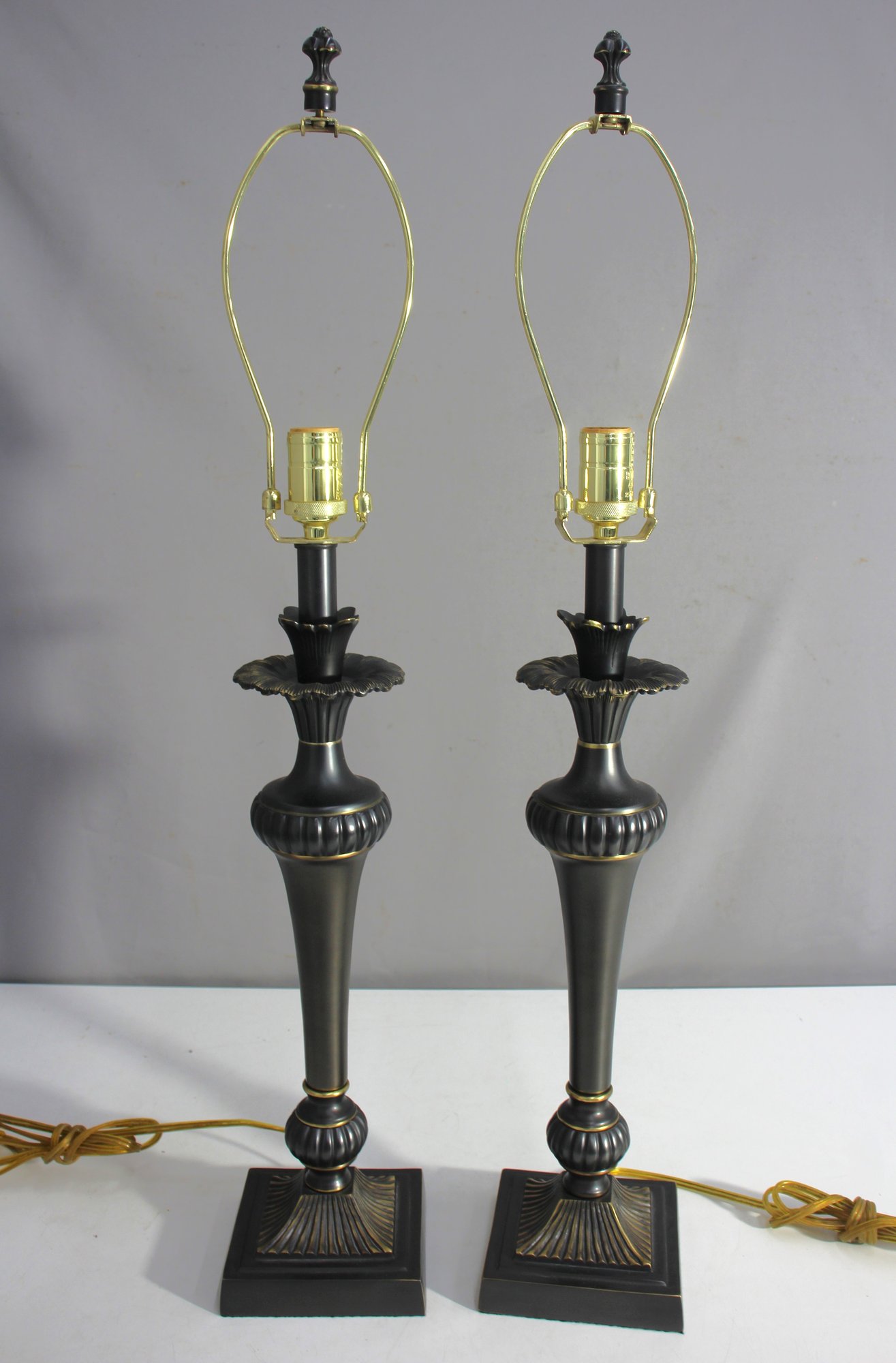 pair of vintage table lamps features a classic and sophisticated design with a bronze-toned finish and intricate detailing. The fluted columns, ornamental accents, and square bases create a timeless and elegant look, perfect for adding a touch of refinement to any space. These lamps are ideal for a living room, bedroom, or office, offering both functionality and style.