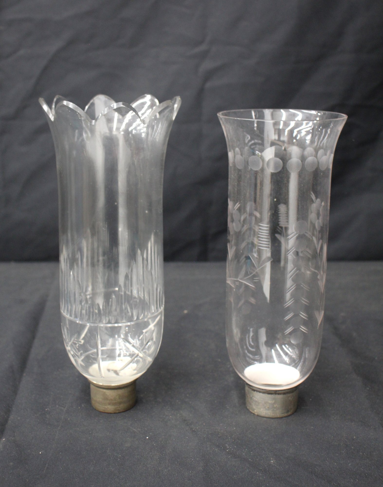 One shade features a fluted top, creating a blooming effect that beautifully diffuses light when a candle is lit within. Its body is adorned with clear, vertical fluting that extends downwards to a finely engraved floral pattern near the base.