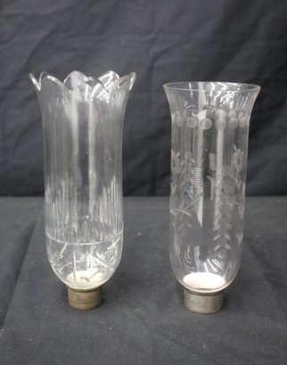The second shade boasts a cylindrical form with a more intricate and defined etched floral design, adding a touch of delicate sophistication. The detailed engraving includes leaves, petals, and possibly stems or vines, creating a harmonious natural scene.