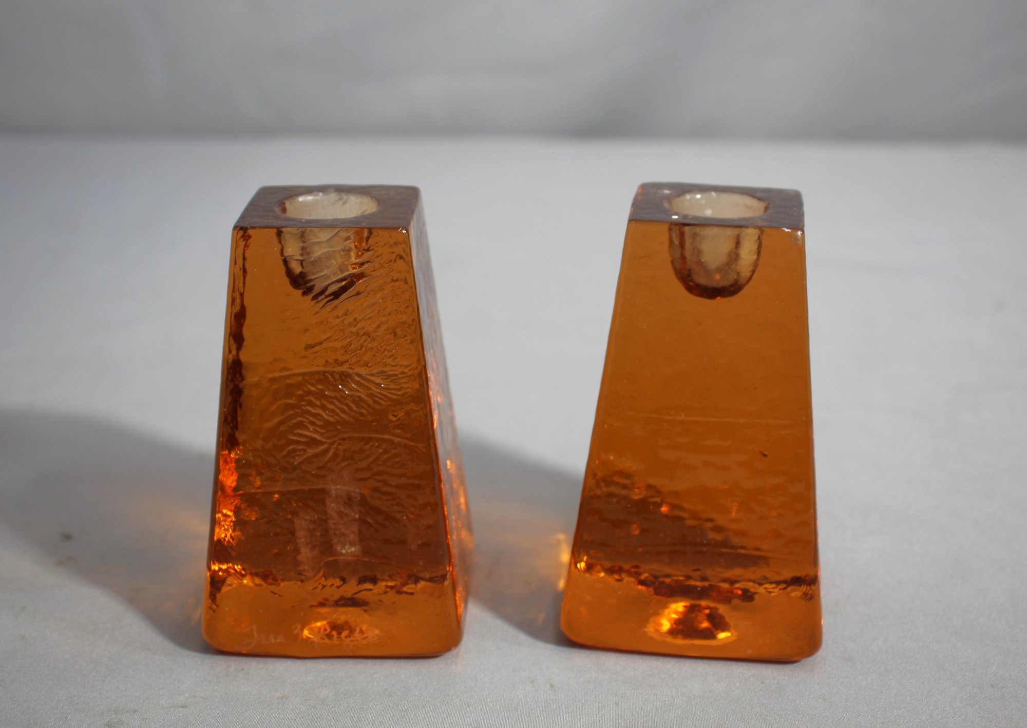 Illuminate your space with this environmentally conscious and aesthetically pleasing pair of Fire & Light candle holders, expertly crafted from recycled glass. These two striking pieces showcase a vibrant orange hue that casts a warm, inviting glow, making them perfect additions to any eco-friendly home decor. Standing approximately 8 inches tall, their unique textured surface and tapered shape reflect a play of light that adds depth and character to their surroundings.