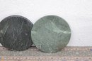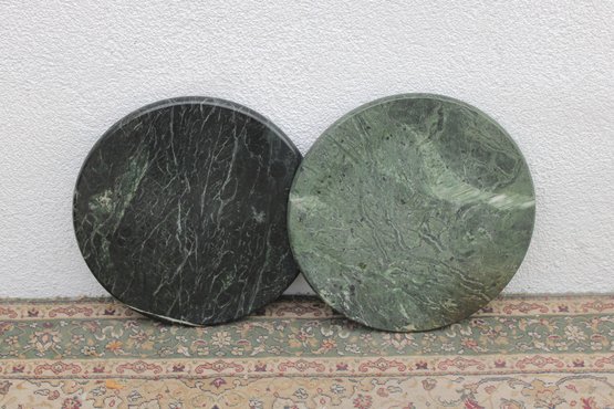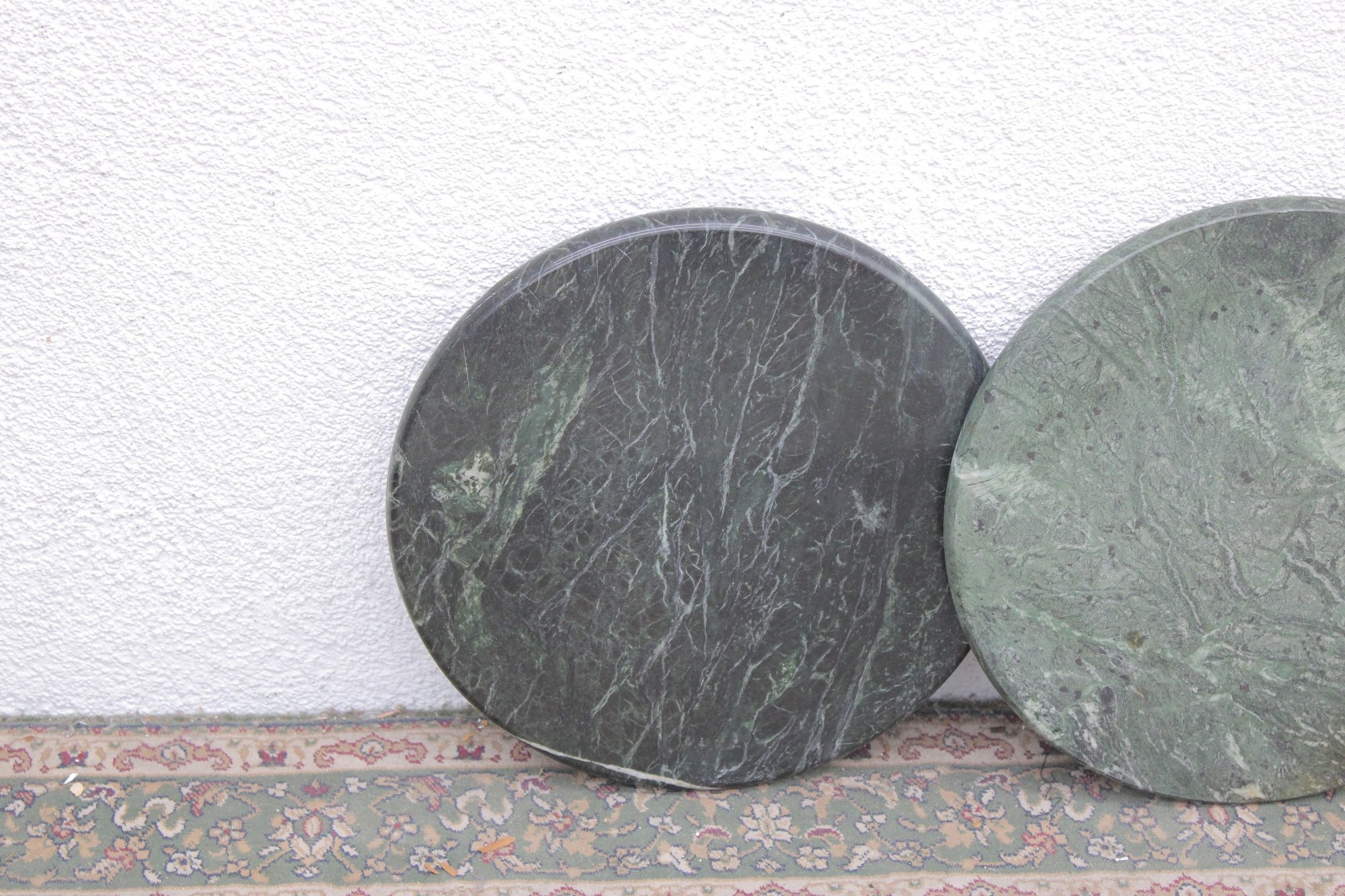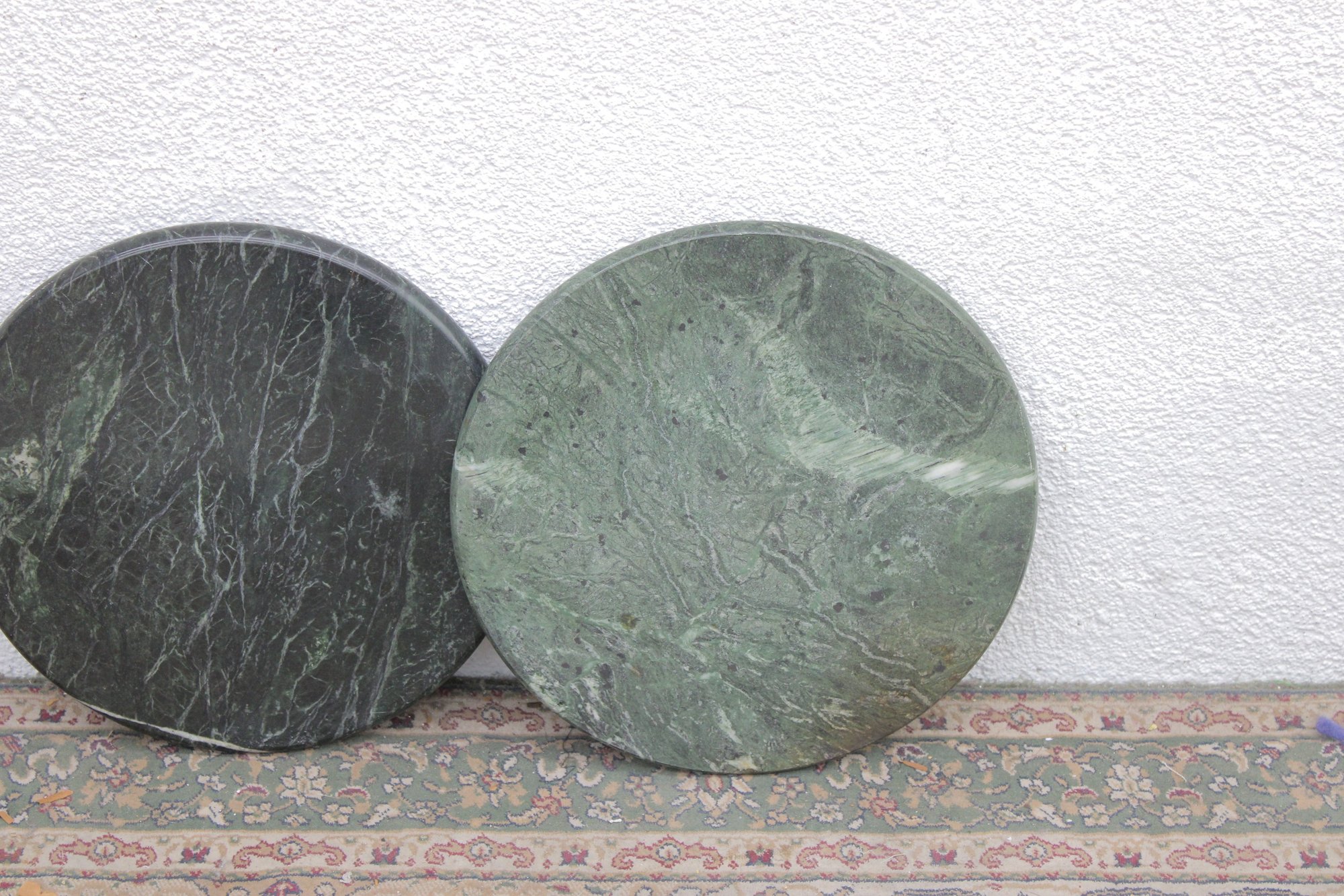 Set of two round green marble pieces featuring natural veining in two complementary shades, one darker and one lighter. These solid stone rounds are versatile and can be used as small table tops, plant stands, display bases, risers, or decorative marble slabs for home décor.