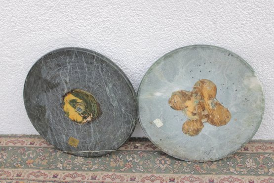 Each piece measures approximately 12 inches round and showcases unique natural color variation and veining, giving the set an elegant, organic look. Ideal for use in a living room, office, retail display, or as accent surfaces for candles, sculptures, or collectibles.