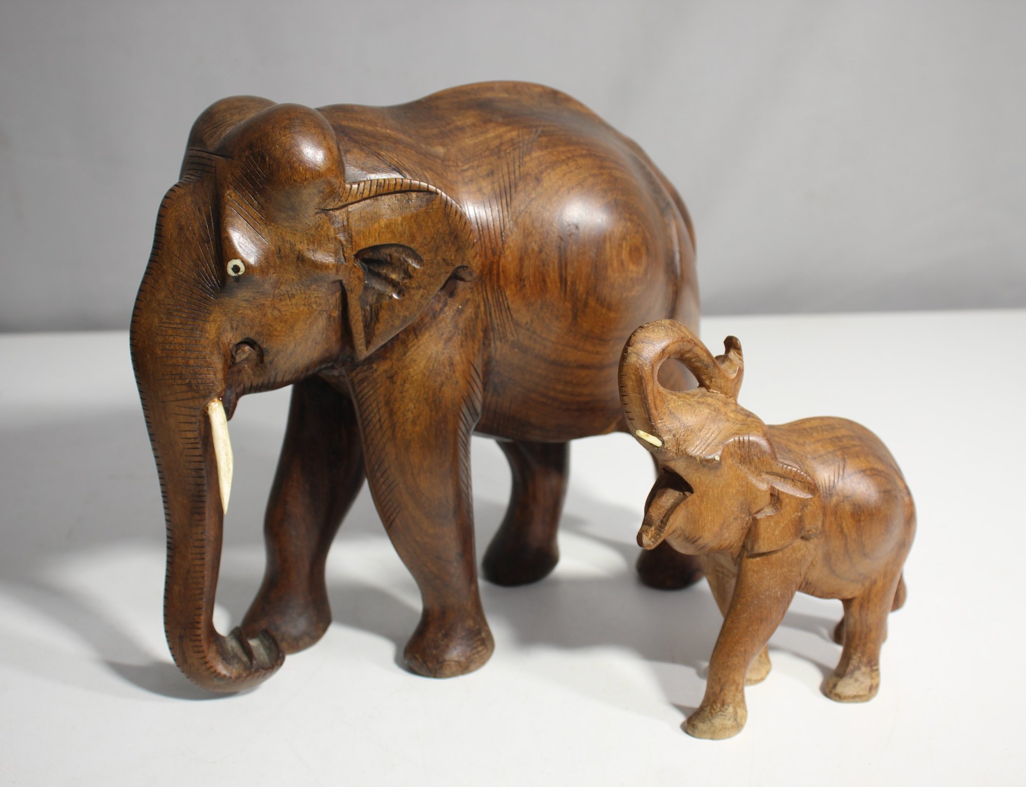 This lot features two intricately hand-carved wooden elephant sculptures. The larger elephant stands with its trunk down, showcasing smooth details and expressive eyes, while the smaller elephant raises its trunk in a display of joy. Both figures are finely detailed, capturing the natural beauty and strength of these majestic animals. The larger elephant has slight wear, and the smaller elephant shows minor signs of age, including a slight chip on the tusk (as pictured). A charming addition to any collection of wooden art or animal-themed decor.
