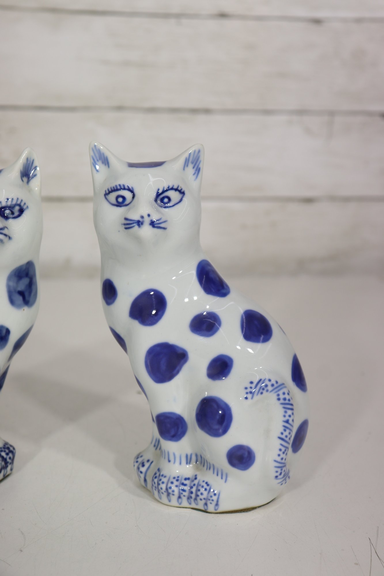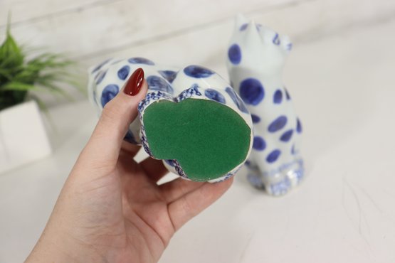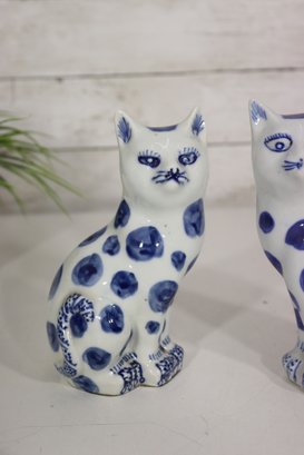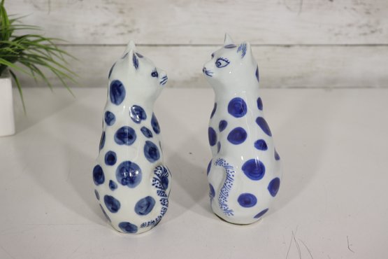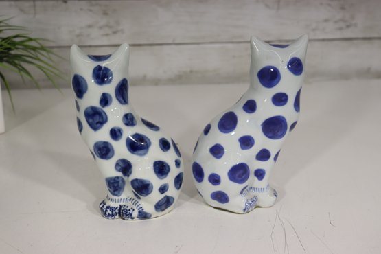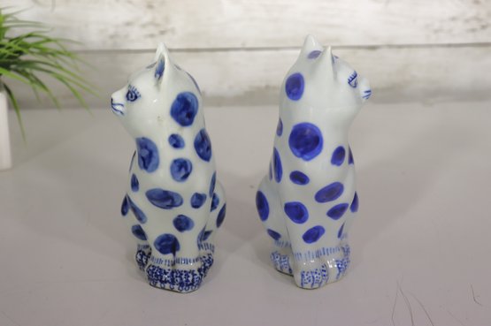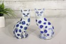 Charming pair of vintage blue & white porcelain cat figurines featuring hand painted spotted designs and expressive faces. Both cats sit in upright pose with classic decorative styling. Felt bottom bases.