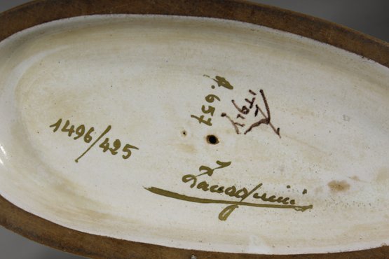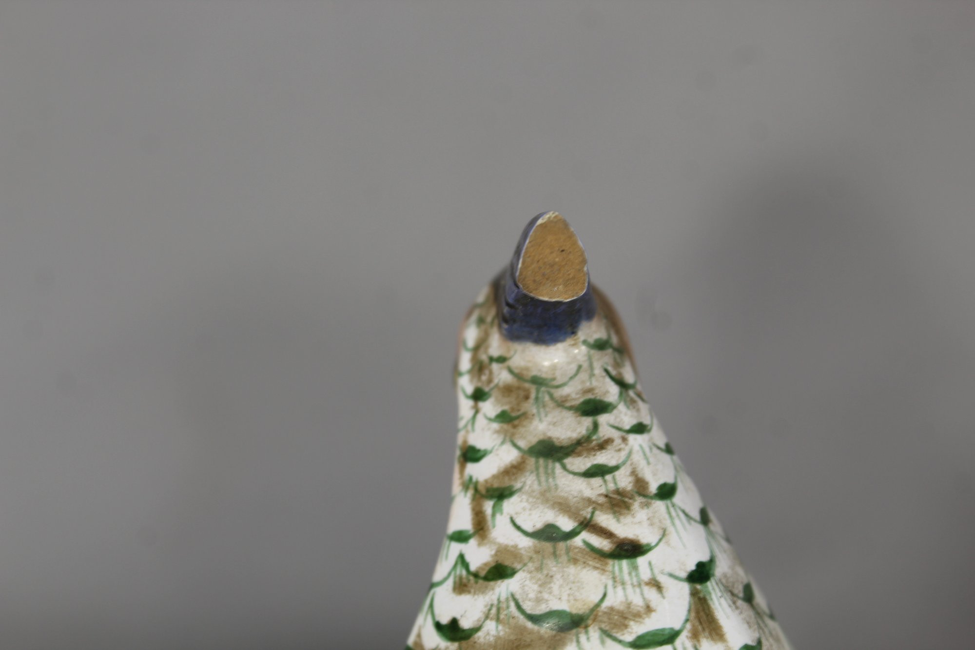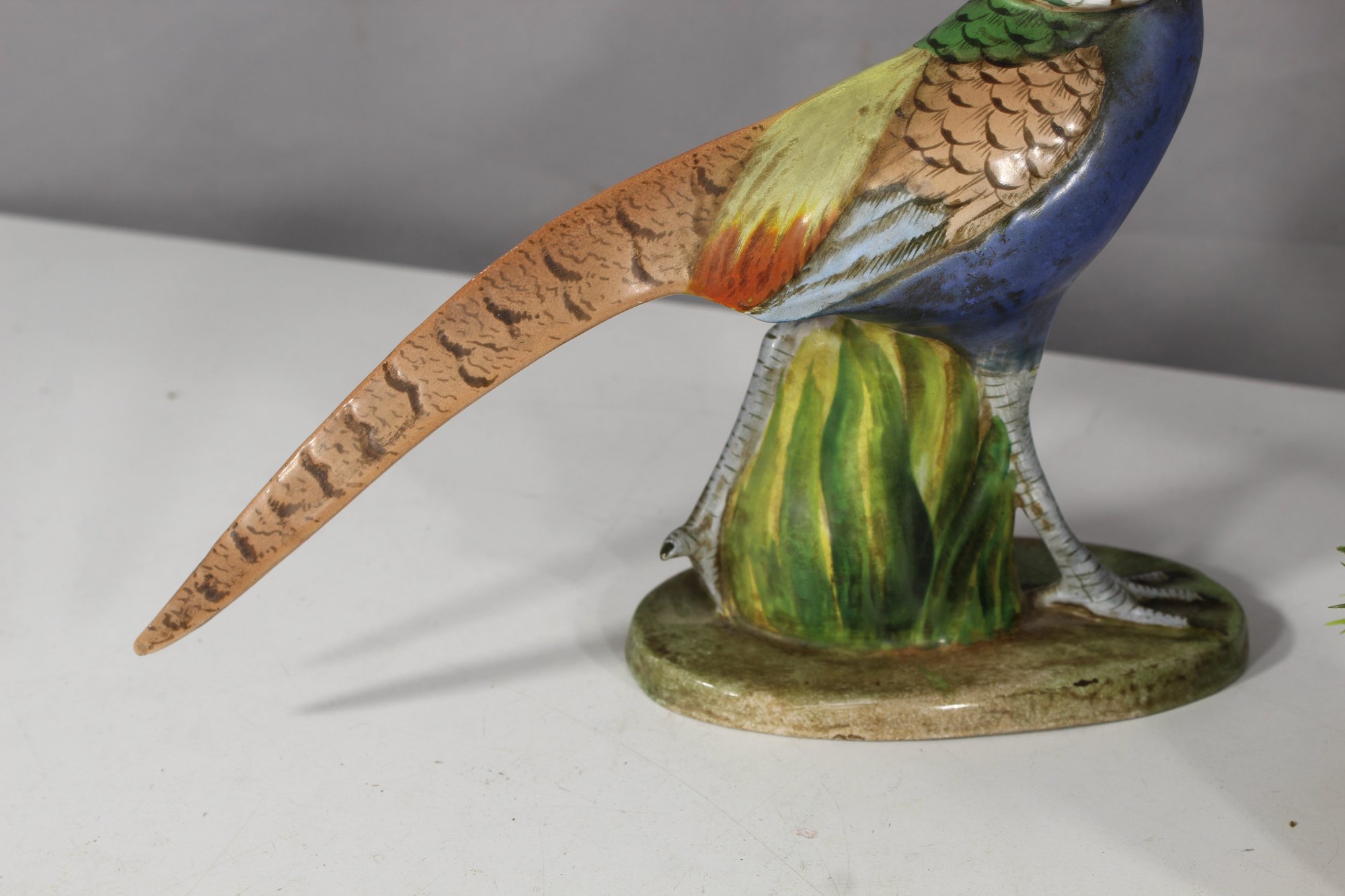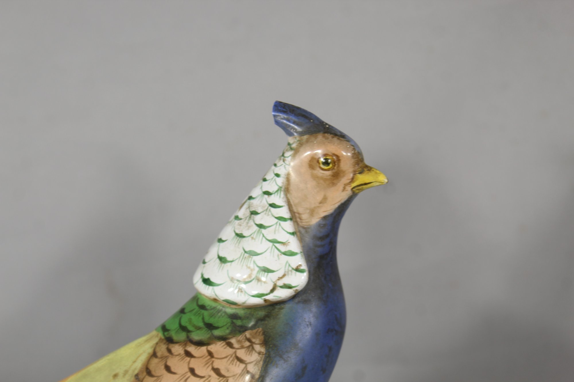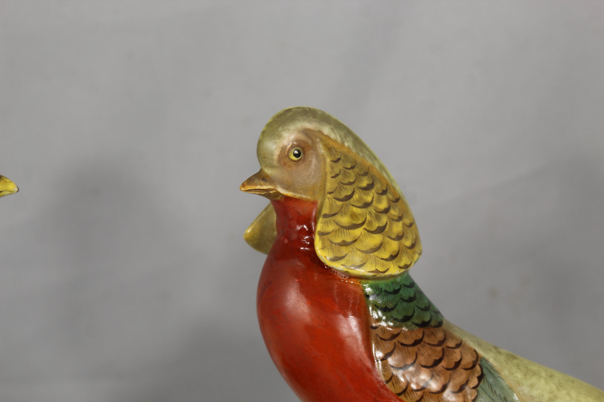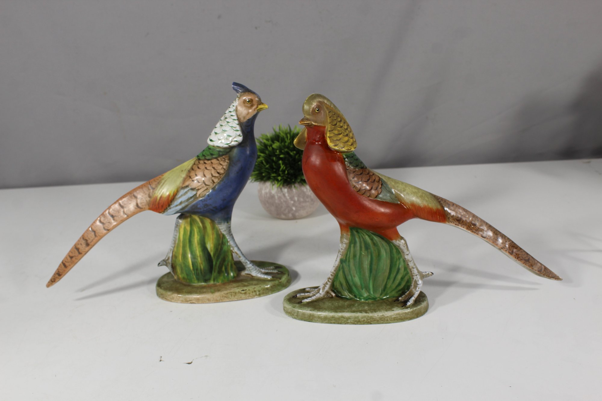 One pheasant has a minor damage on the feather crest, as visible in the provided photographs. Otherwise, the pair remains in excellent condition with no visible cracks or chips.
