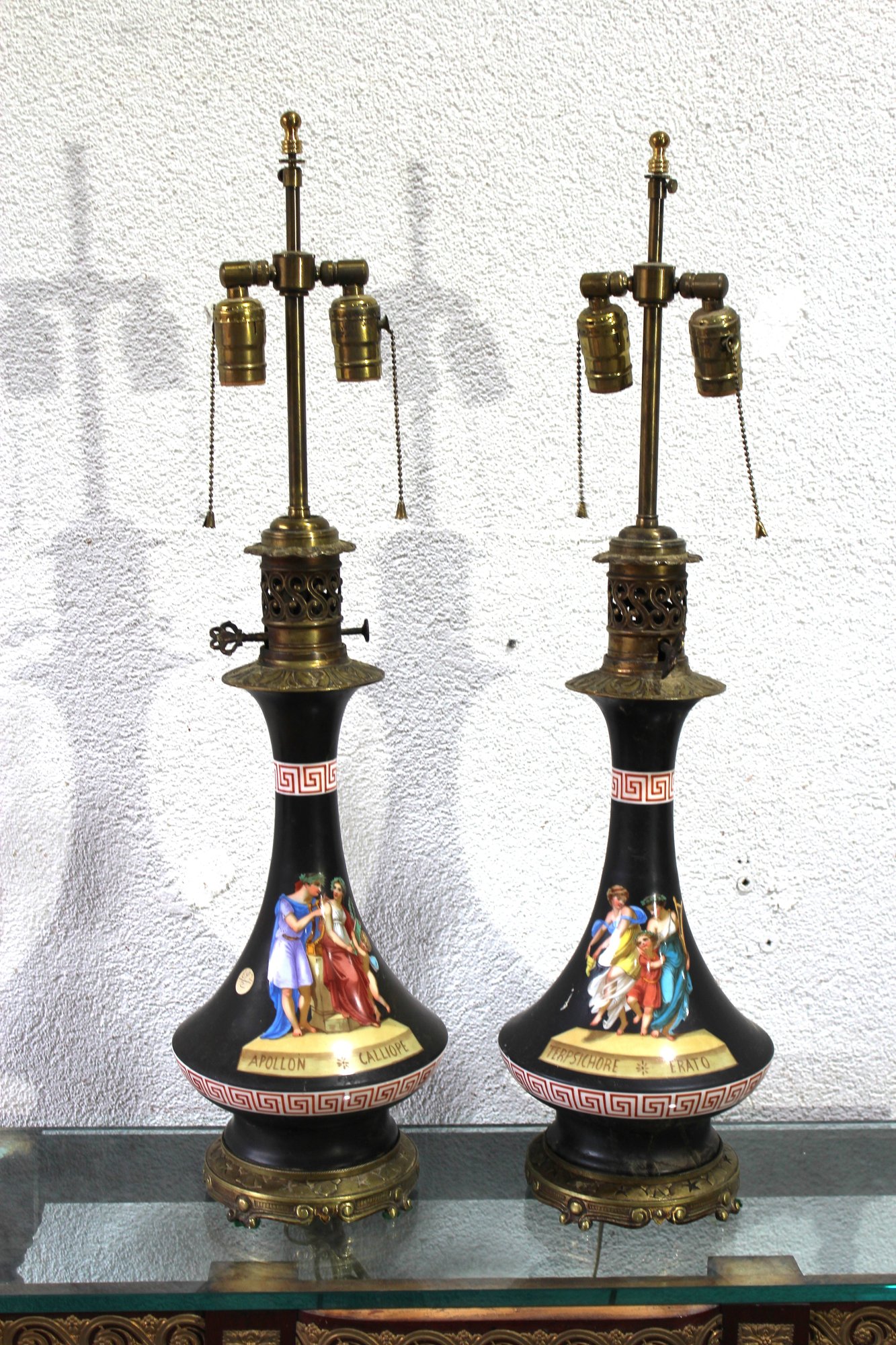 This stunning pair of porcelain lamps features a beautiful hand-painted design, showcasing classical figures labeled "Terpsichore" and "Erato," inspired by the Greek muses. The elegant black porcelain bases are further embellished with a red and white Greek key pattern encircling the top and bottom. Each lamp stands on an ornate gilt metal base, adding to the lamps' classical and sophisticated look.