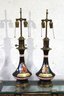 The back of each lamp is also adorned with musical instruments, painted delicately to enhance the overall theme. These lamps have an urn-shaped body and are ready for wiring, with dual sockets and pull chains, bringing both functionality and a touch of artistic heritage to any room.