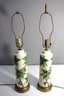 here is a captivating pair of vintage table lamps, each beautifully hand-painted with vibrant floral designs and lush green foliage. These elegant ceramic lamps stand on a robust brass base, adding a touch of timeless sophistication to any room.