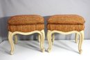 this pair of French Provincial style ottomans by Interior Crafts features beautifully carved wood frames in a soft cream finish and plush upholstered cushions in a warm rust-orange chenille fabric with subtle gold accents.