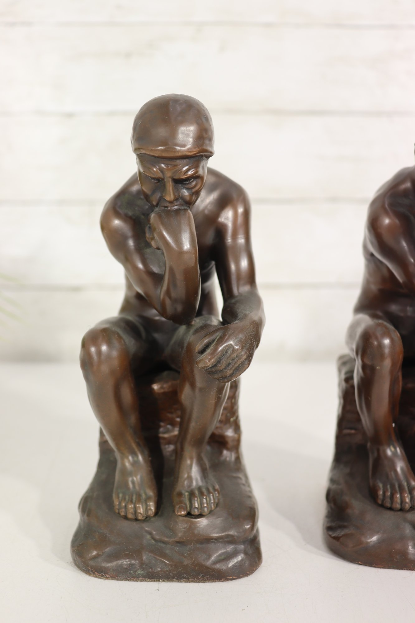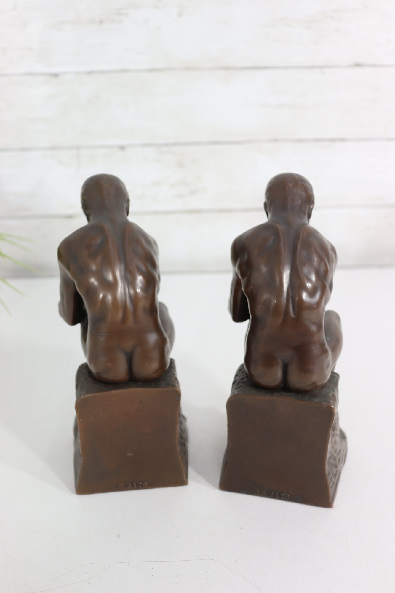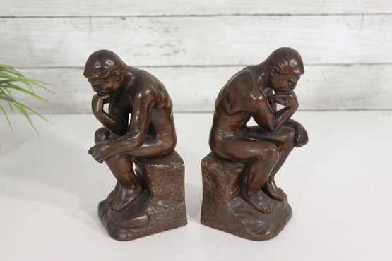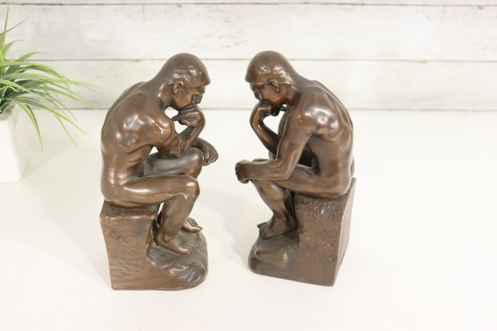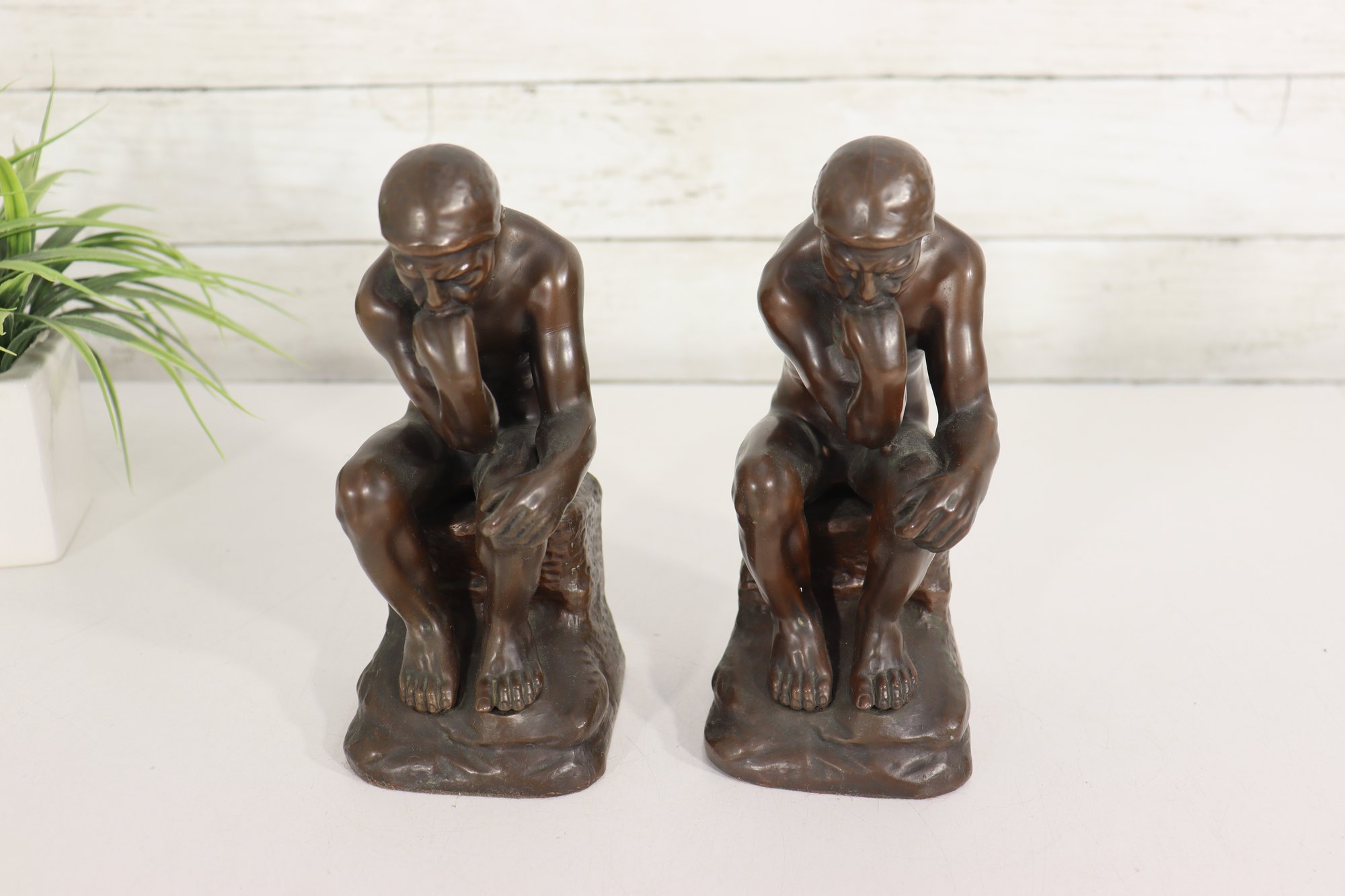 a pair of vintage JB (Jennings Brothers) bronze-finish bookends inspired by Auguste Rodin’s iconic sculpture The Thinker. Each piece features detailed casting, a rich bronze-tone finish, and the original JB label on the felted base.