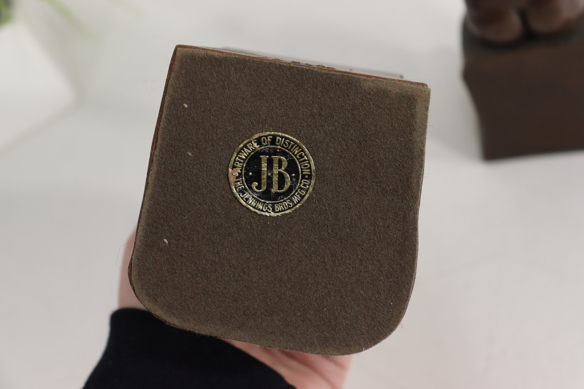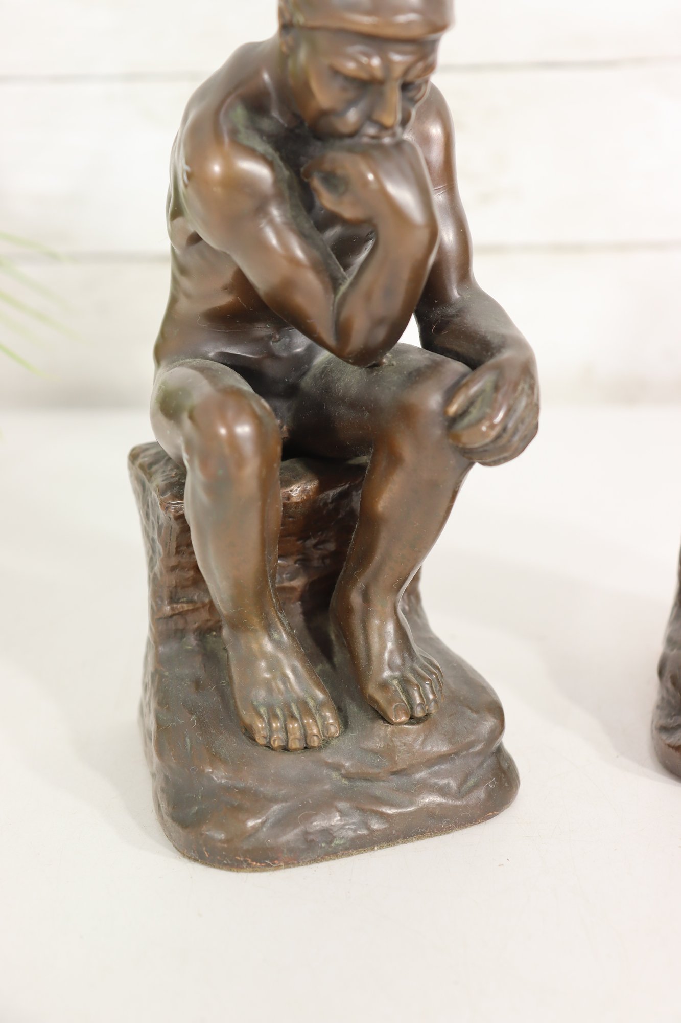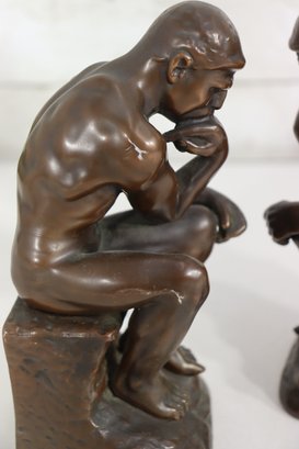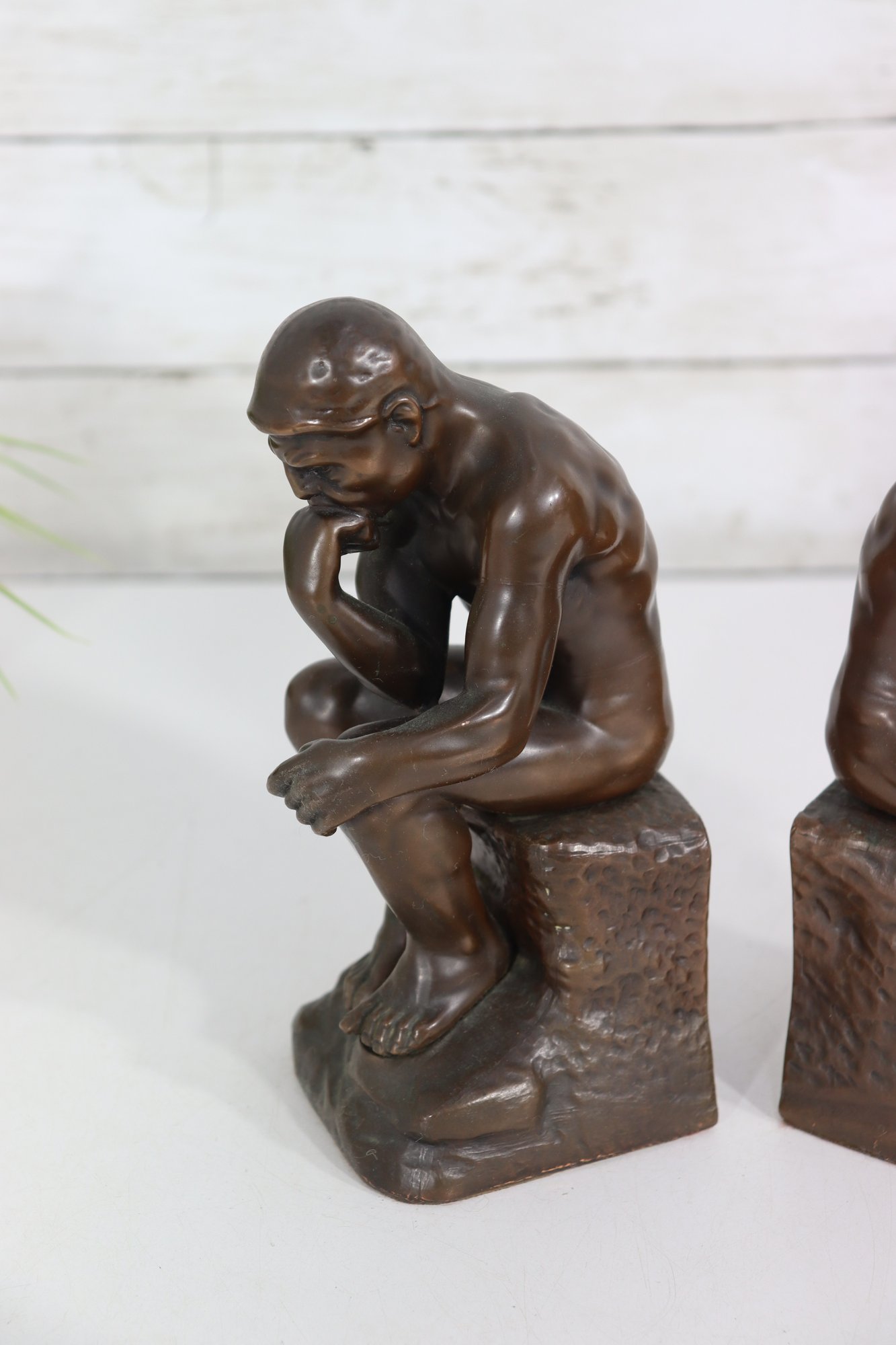 a pair of vintage JB (Jennings Brothers) bronze-finish bookends inspired by Auguste Rodin’s iconic sculpture The Thinker. Each piece features detailed casting, a rich bronze-tone finish, and the original JB label on the felted base.