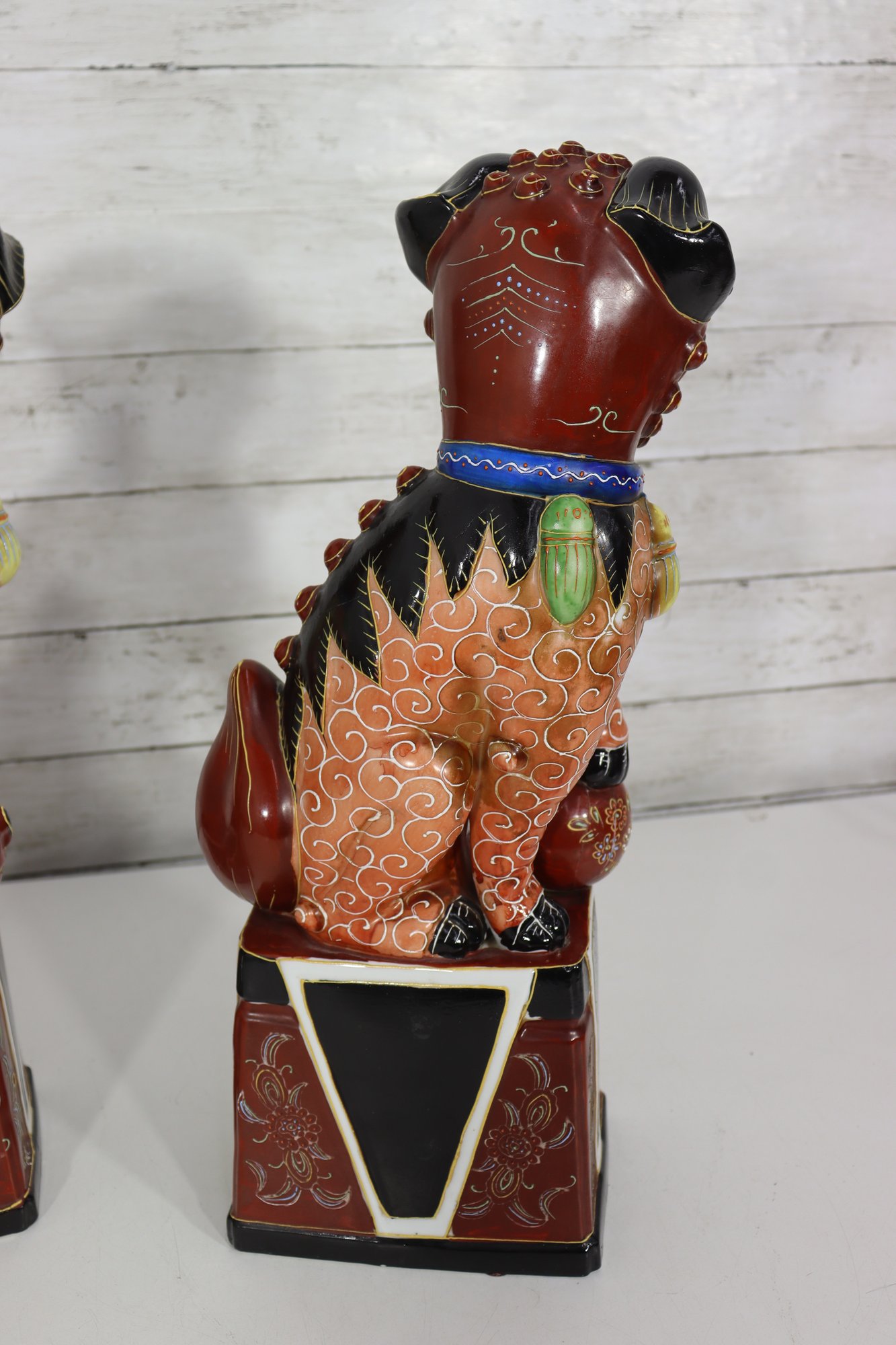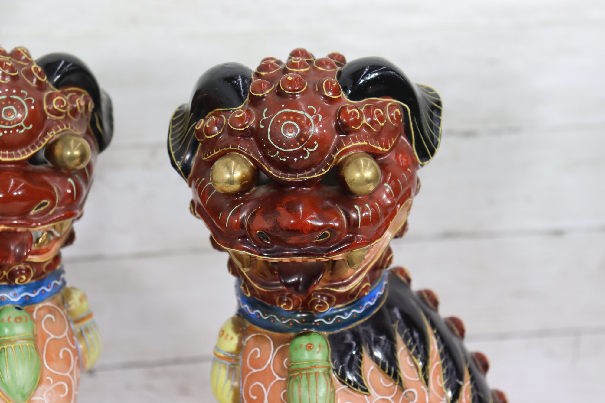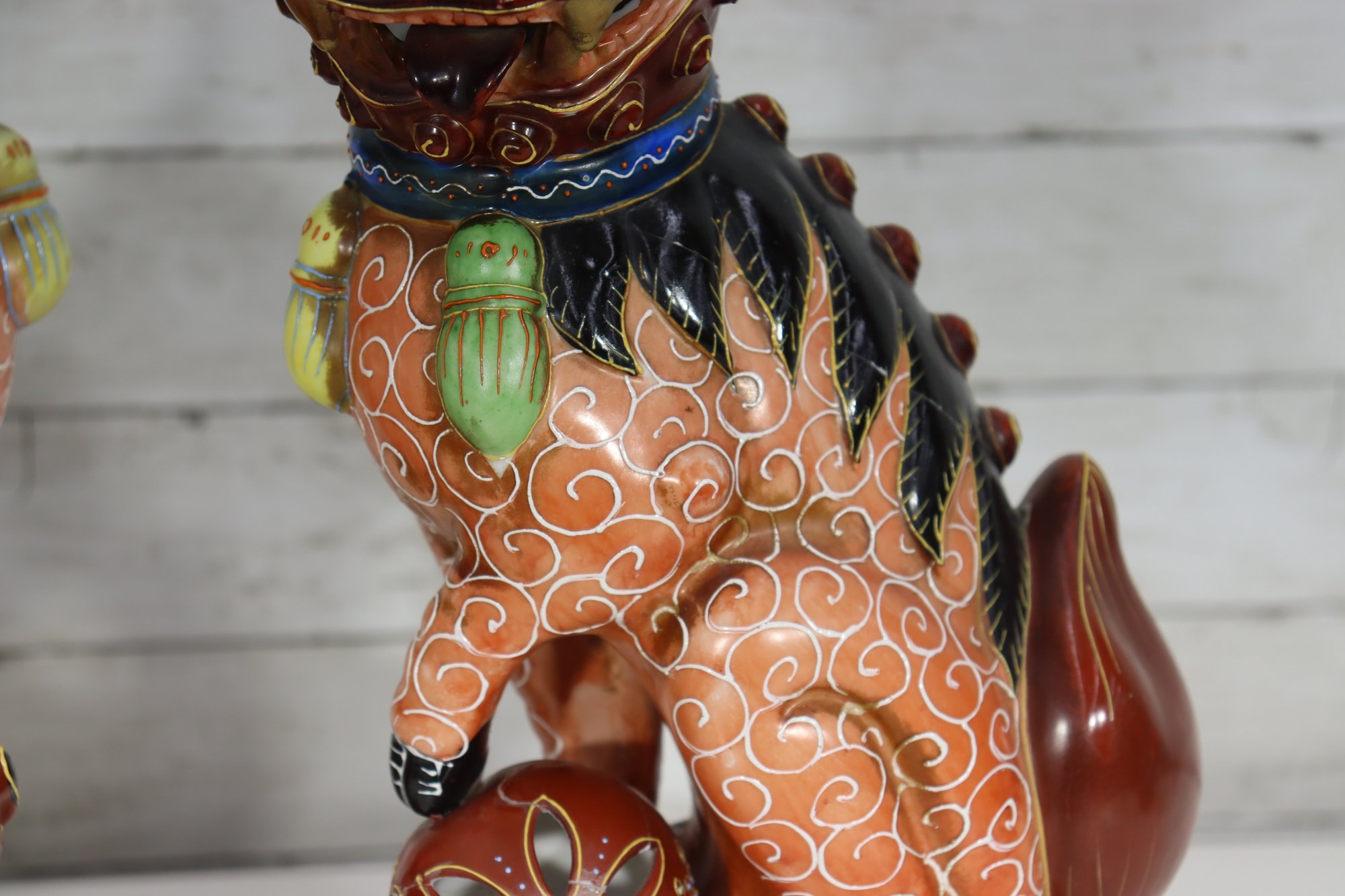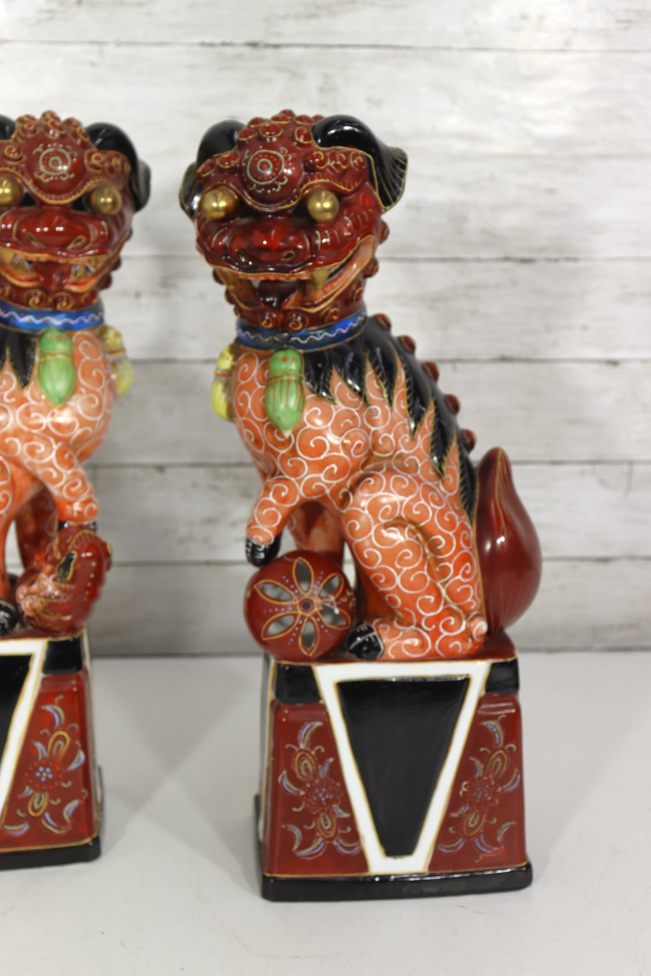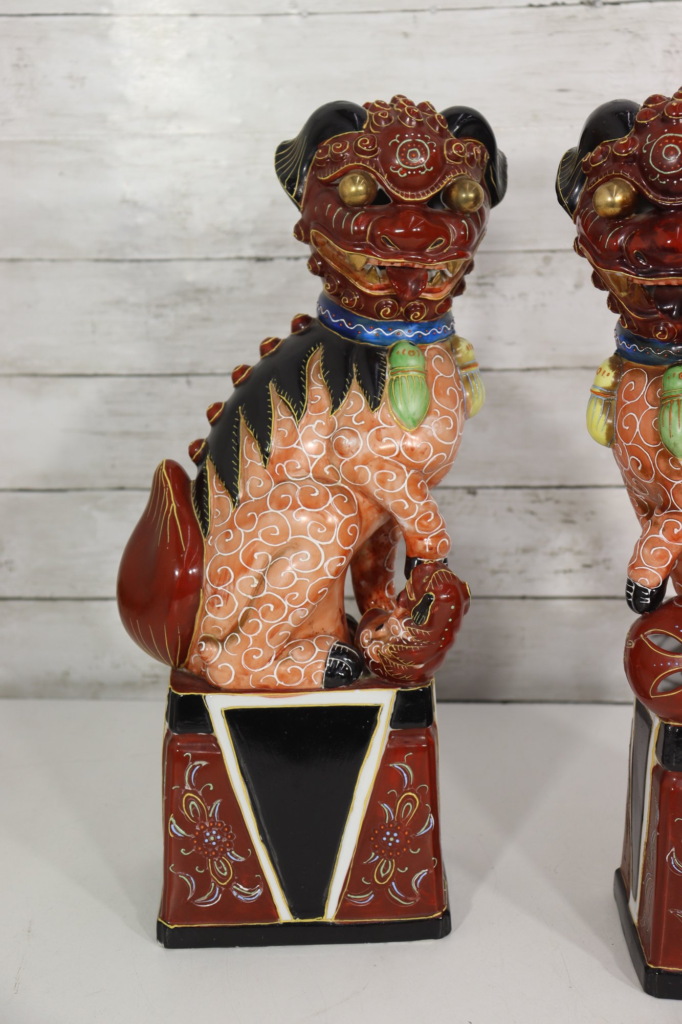 Impressive matching pair of large hand painted Chinese Foo Dog Guardian Lion statues. Highly detailed with bold enamel color, ornate pattern swirl decoration and traditional stance – each Foo Dog seated on pedestal base, one with ball under paw.