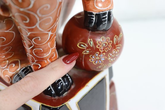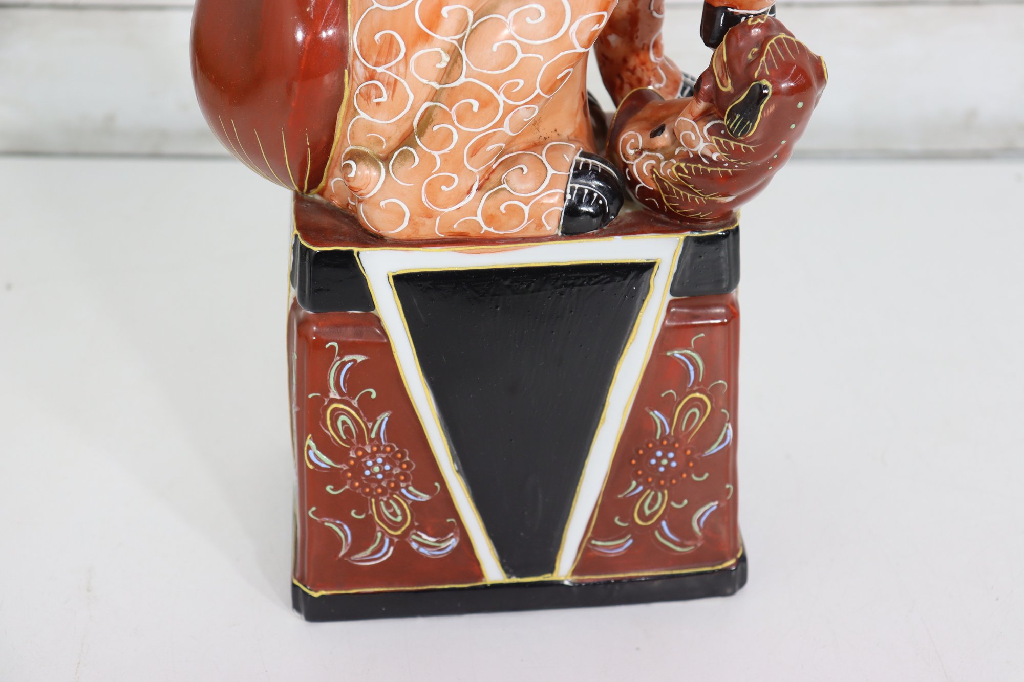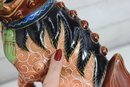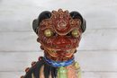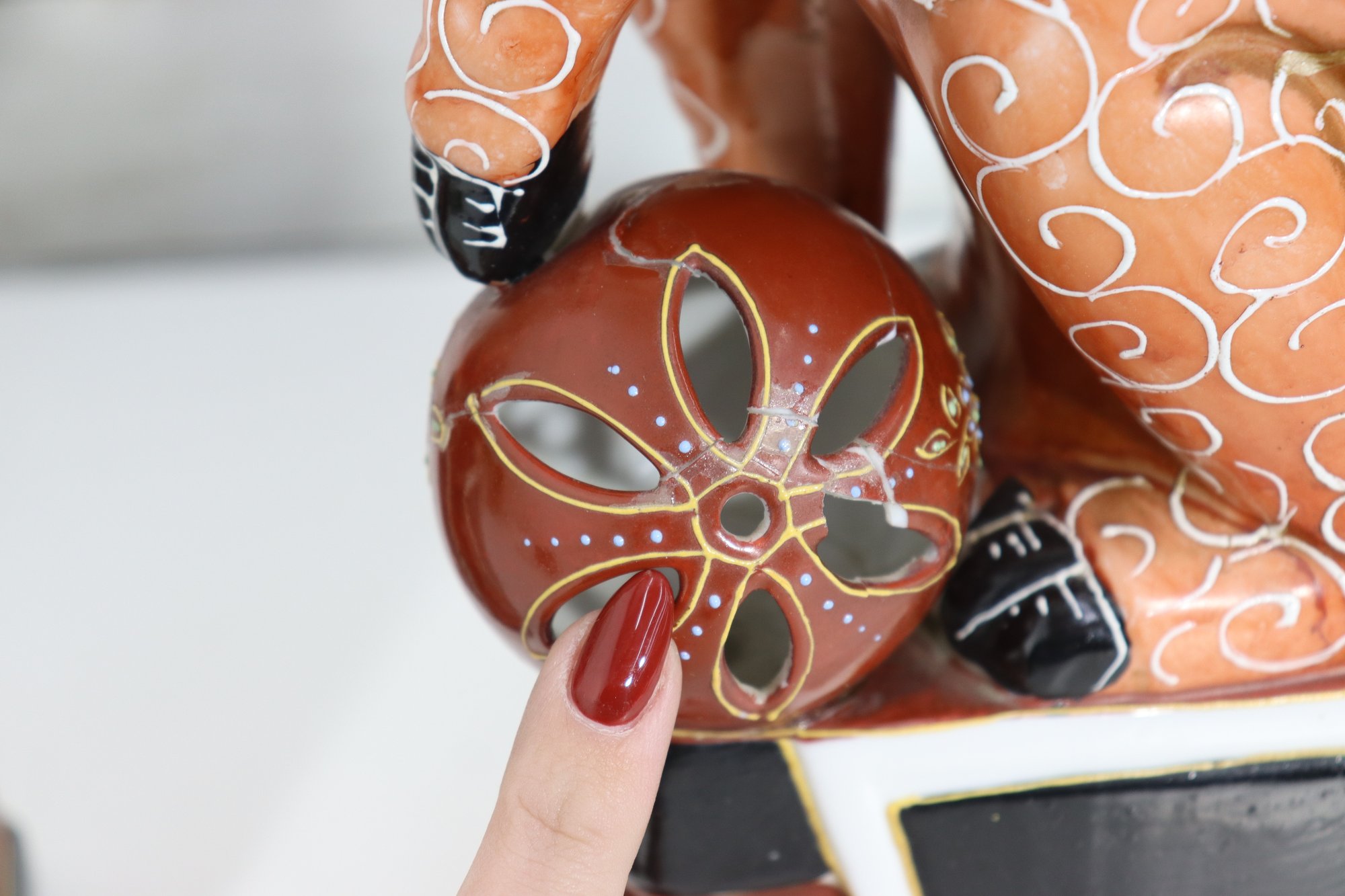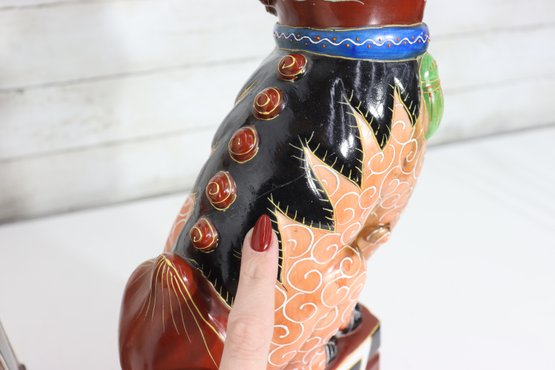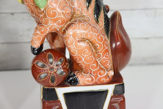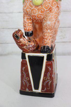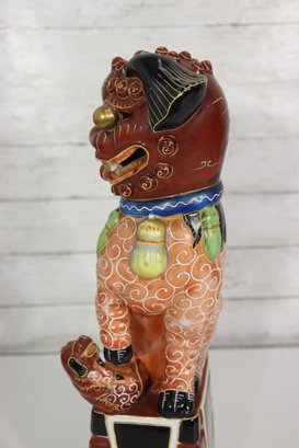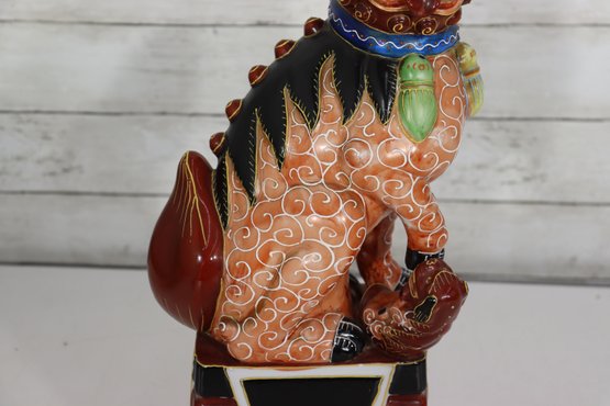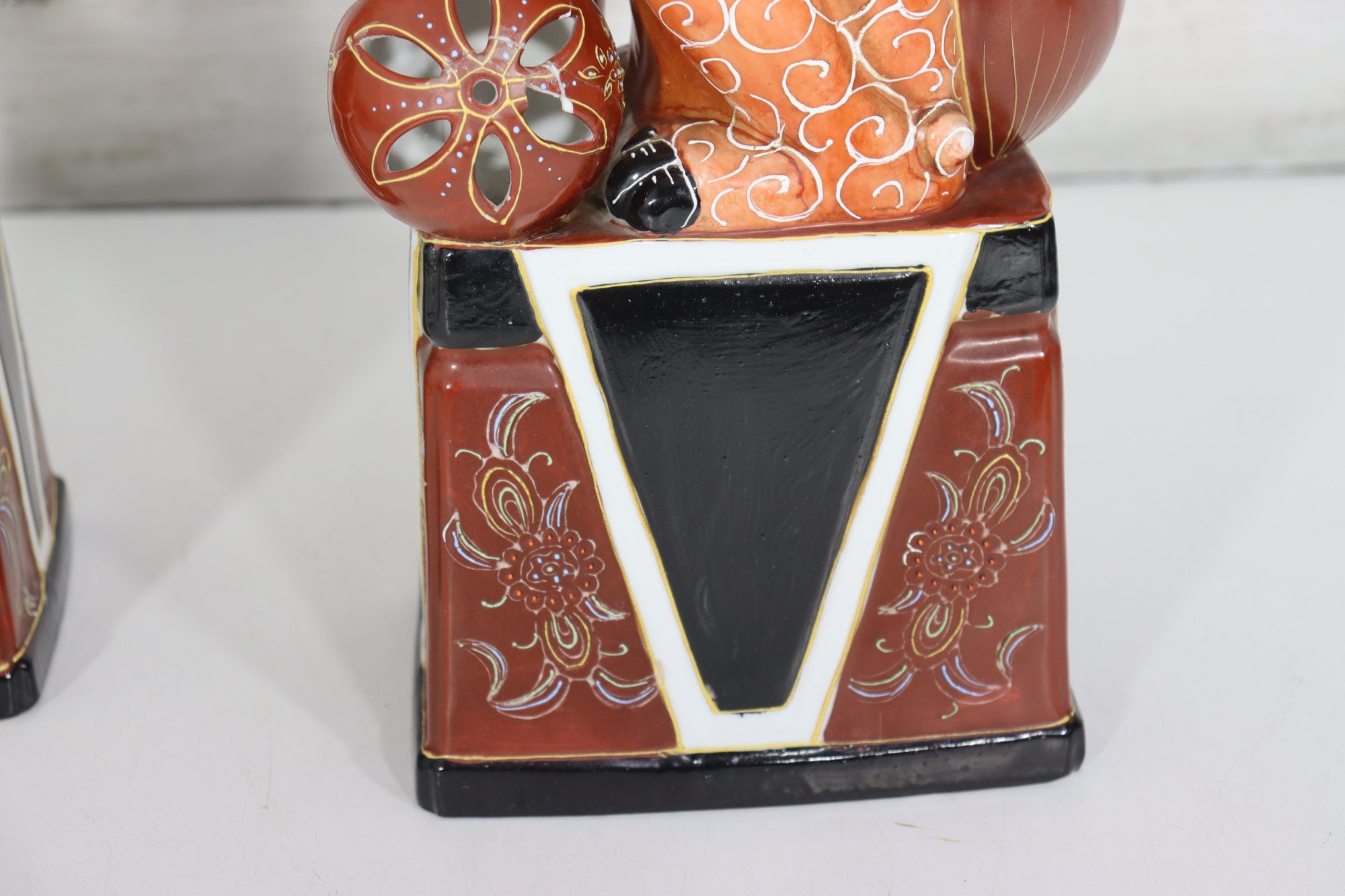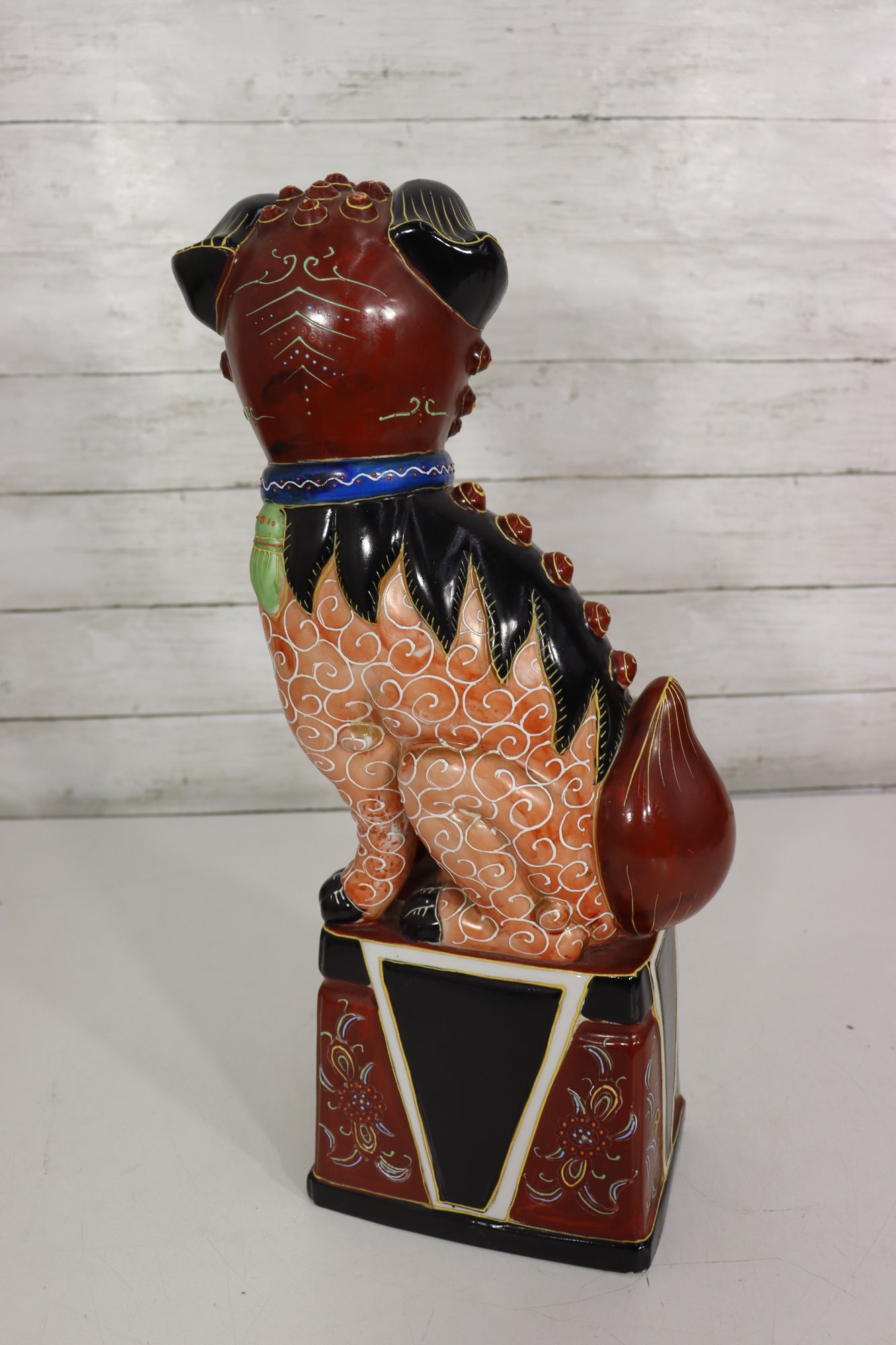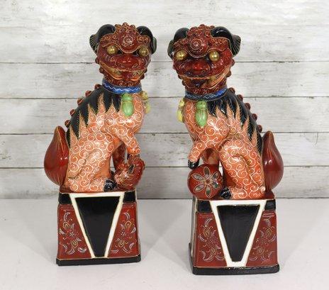 Impressive matching pair of large hand painted Chinese Foo Dog Guardian Lion statues. Highly detailed with bold enamel color, ornate pattern swirl decoration and traditional stance – each Foo Dog seated on pedestal base, one with ball under paw.