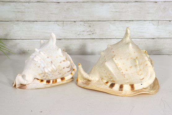 Beautiful pair of large natural conch sea shells, perfect for coastal home décor, beach house displays, or ocean-inspired collections. Each shell showcases a stunning natural form with soft cream tones, ridged textures, and warm brown accents along the edges.