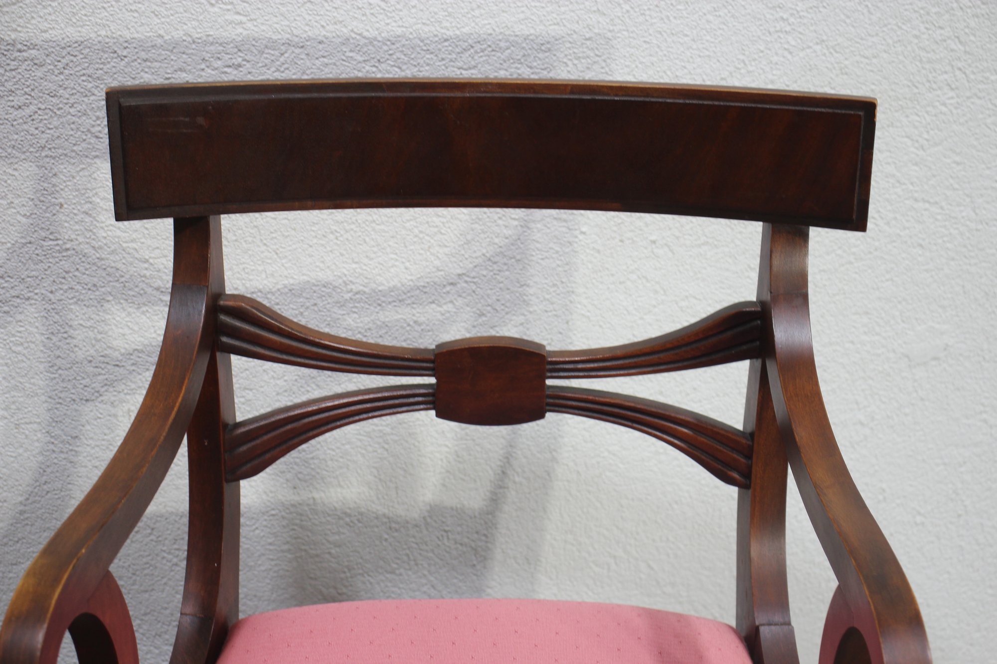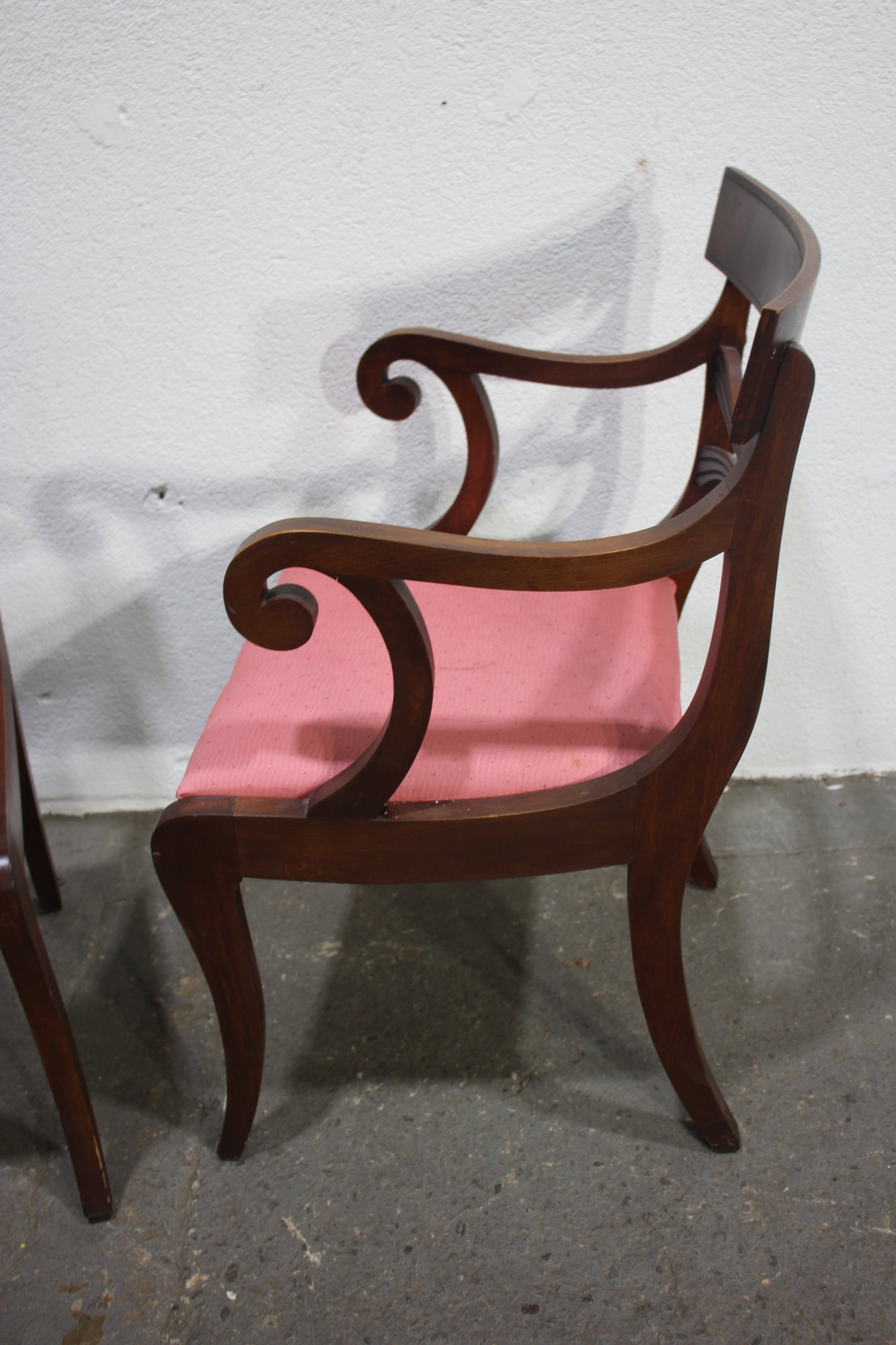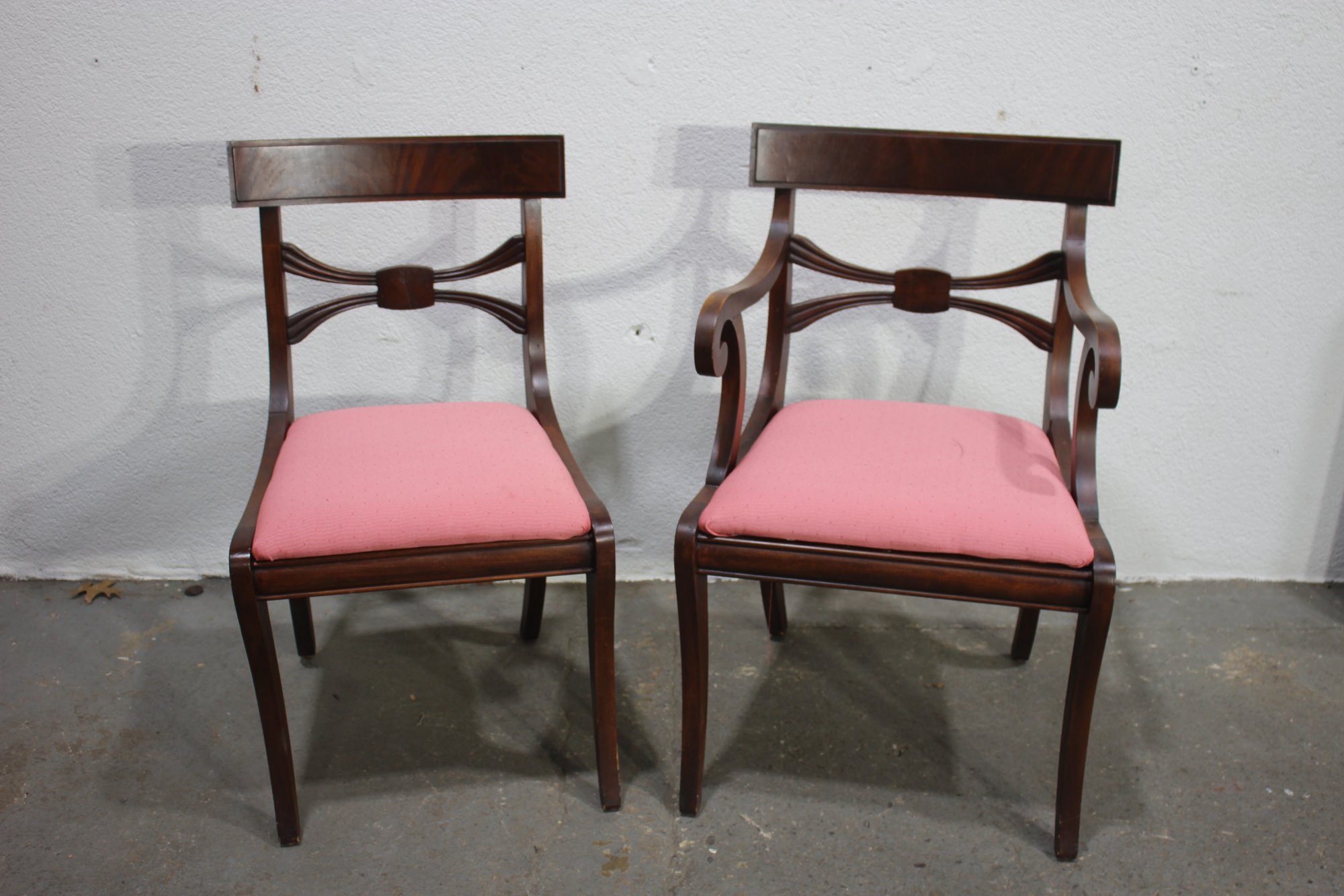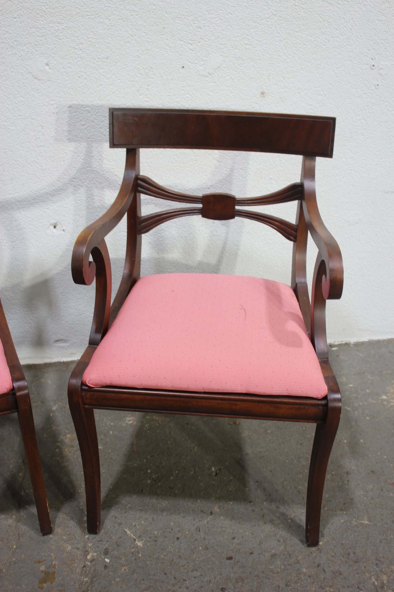 pair of mahogany Regency-style dining chairs offers timeless sophistication and exceptional craftsmanship. The chairs feature a classic curved backrest with a bowtie center detail, exuding refined elegance. One chair includes beautifully scrolled arms, making it a perfect fit as a captain's chair at the head of a dining table.