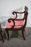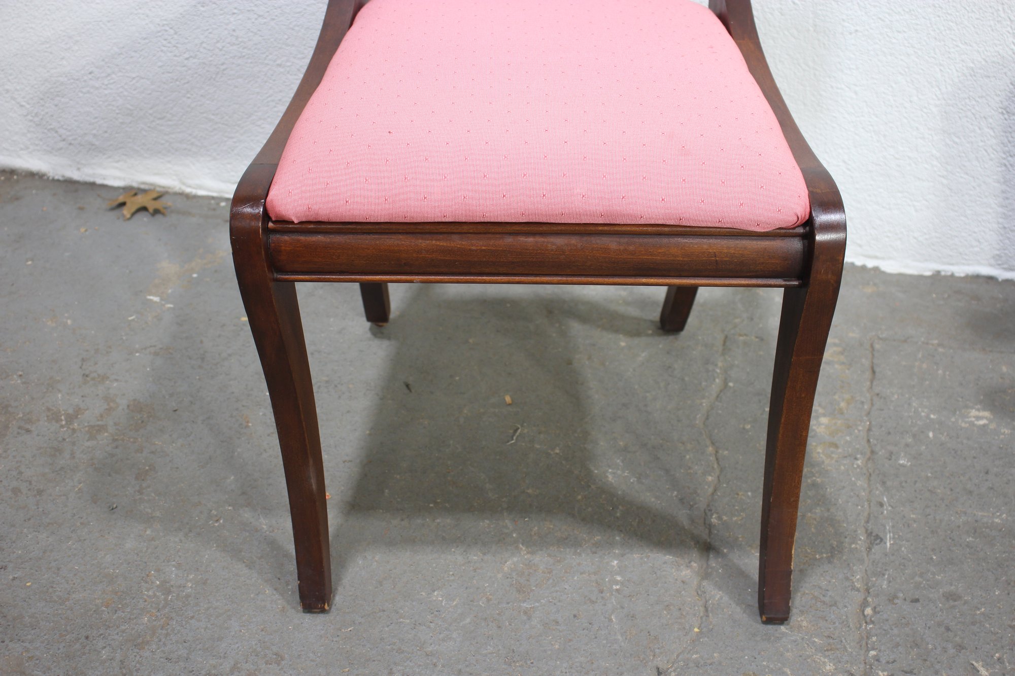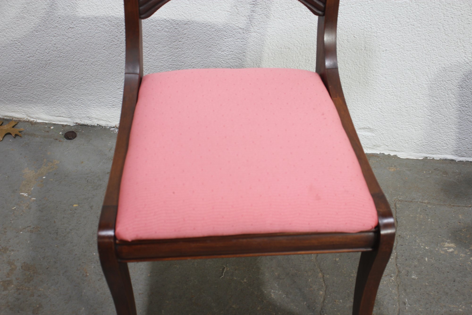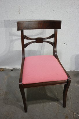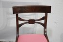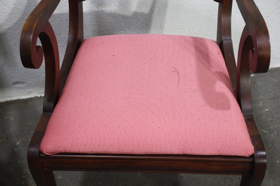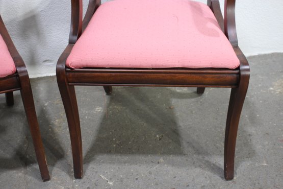 The seats are upholstered in a soft pink fabric, providing a comfortable and stylish accent to the rich mahogany wood finish. These versatile chairs are ideal for use in a dining room, as occasional seating, or as accent pieces.