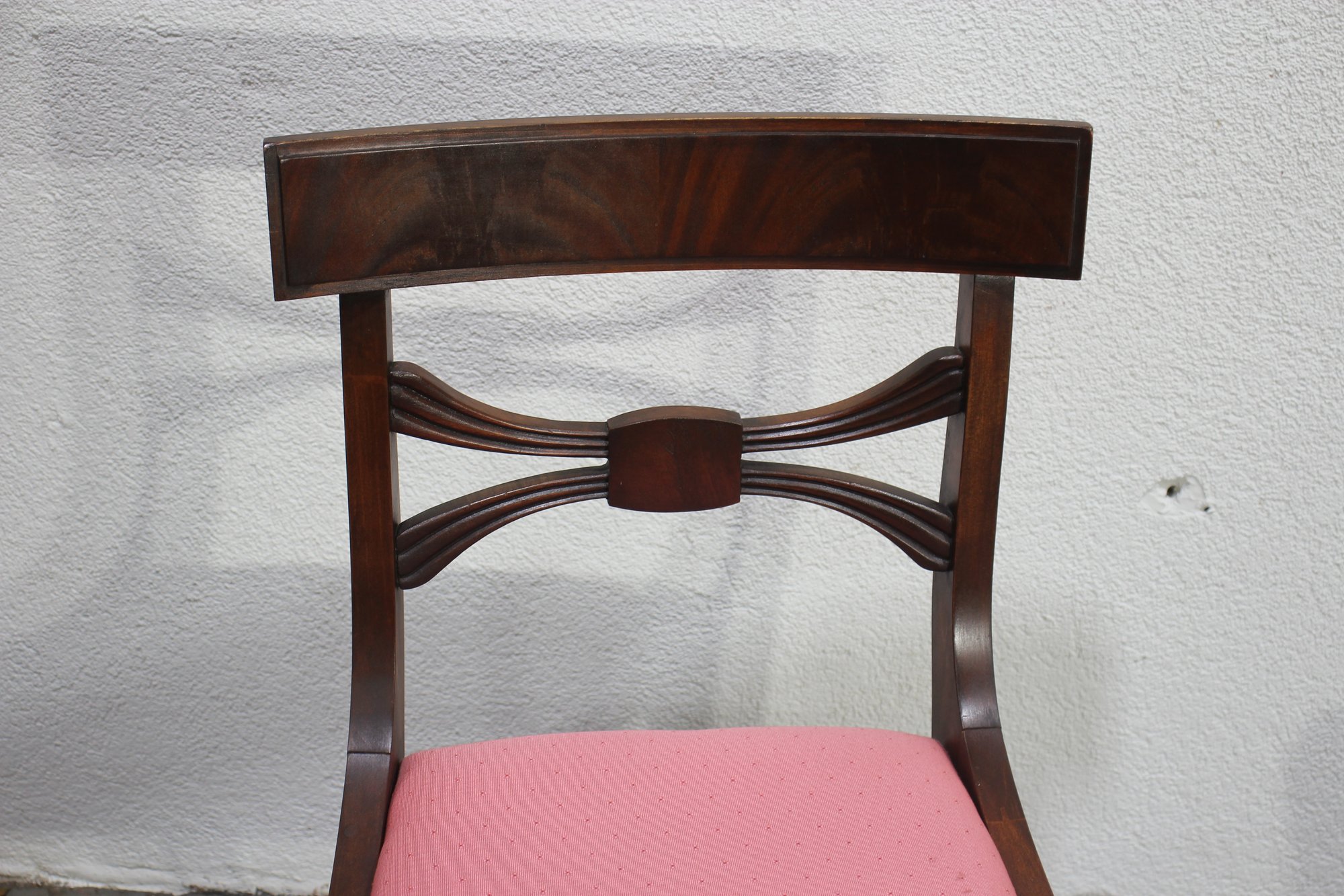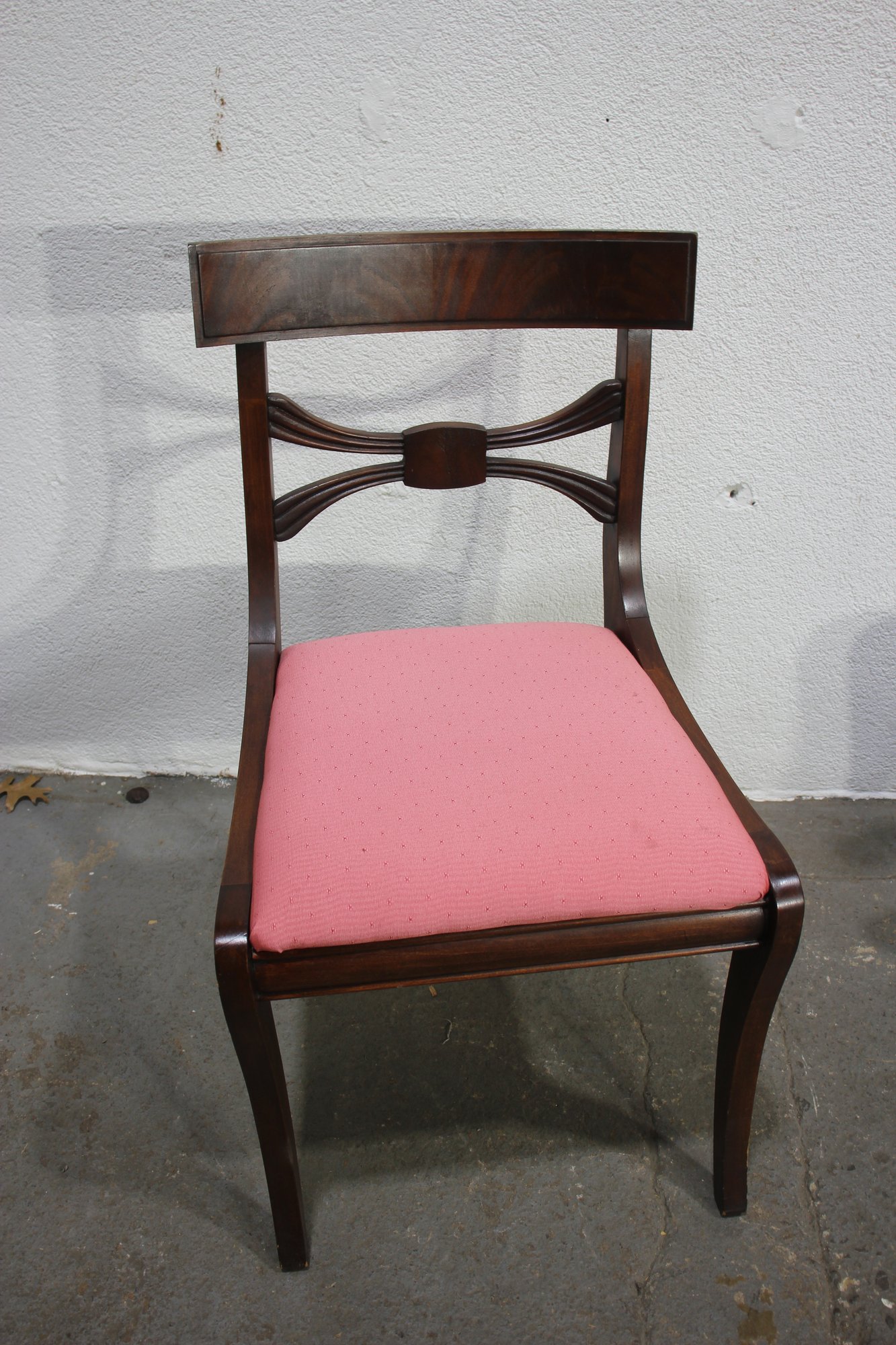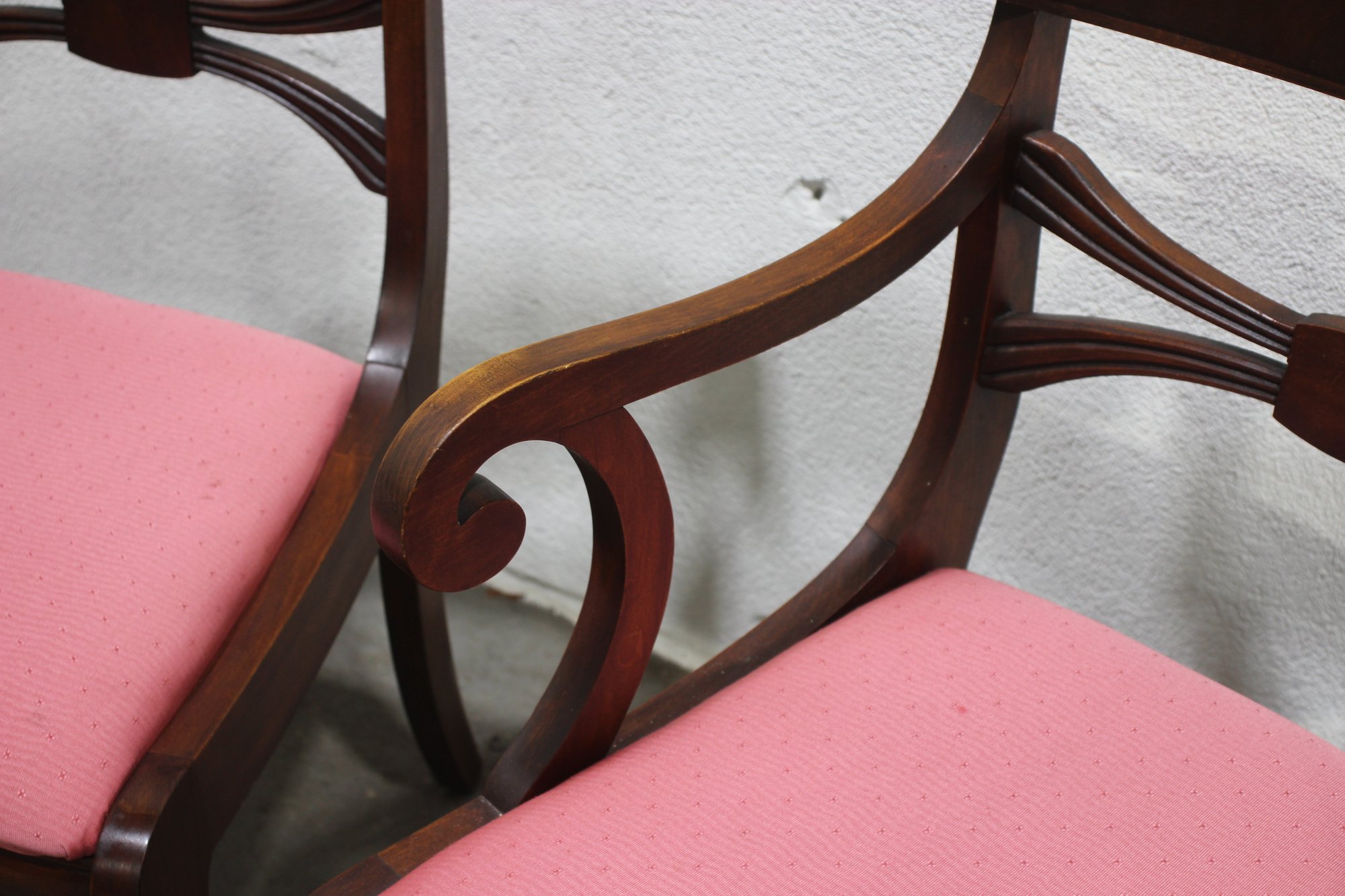 The seats are upholstered in a soft pink fabric, providing a comfortable and stylish accent to the rich mahogany wood finish. These versatile chairs are ideal for use in a dining room, as occasional seating, or as accent pieces.