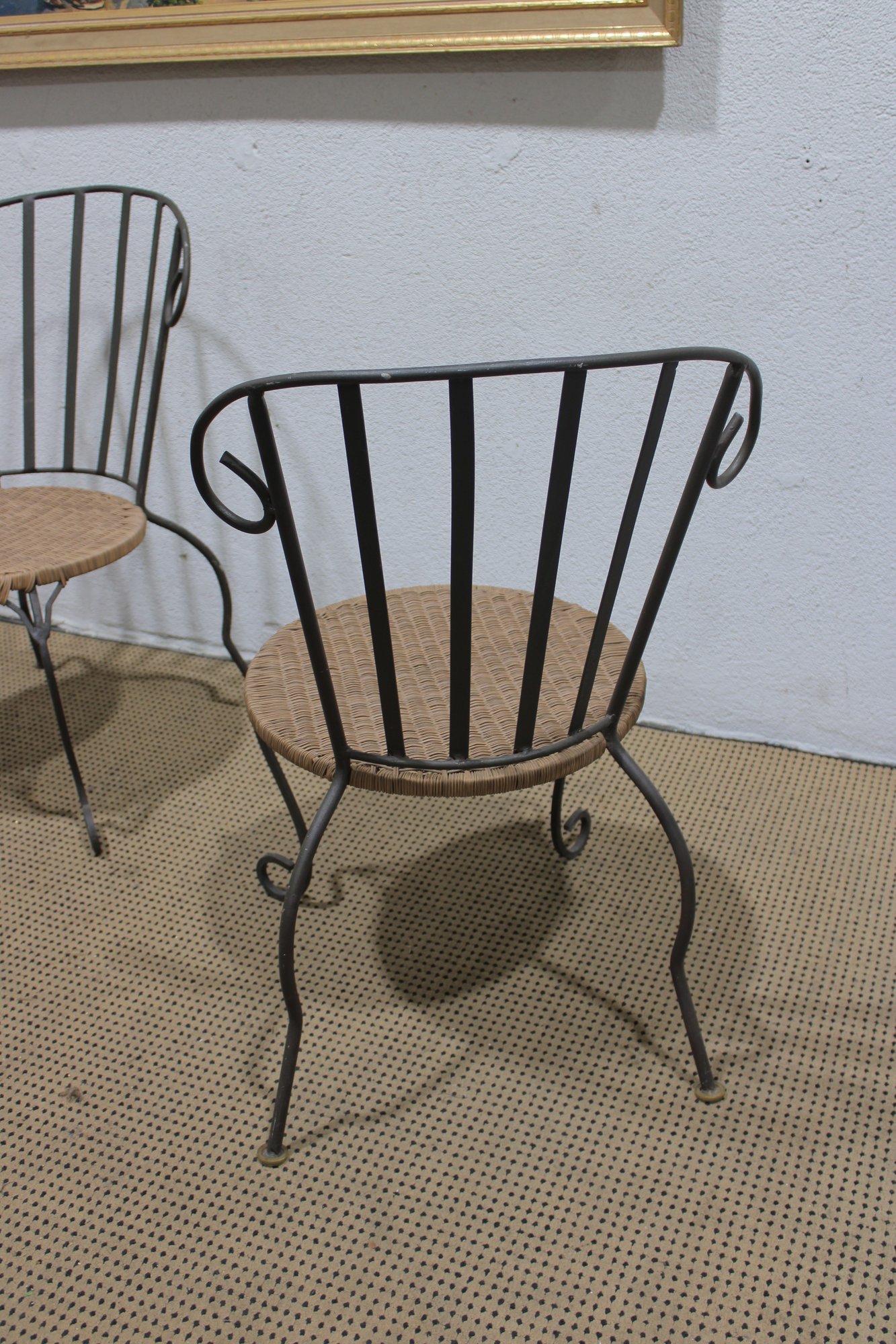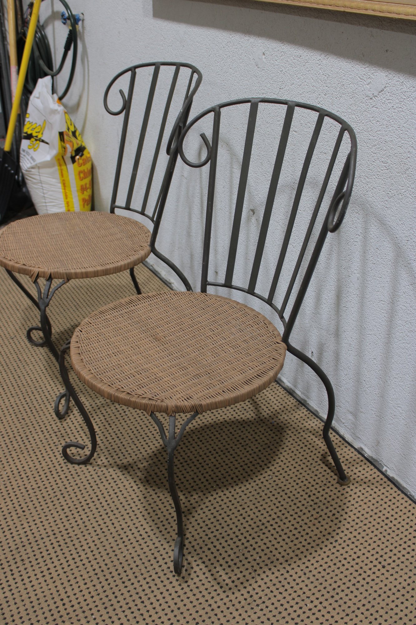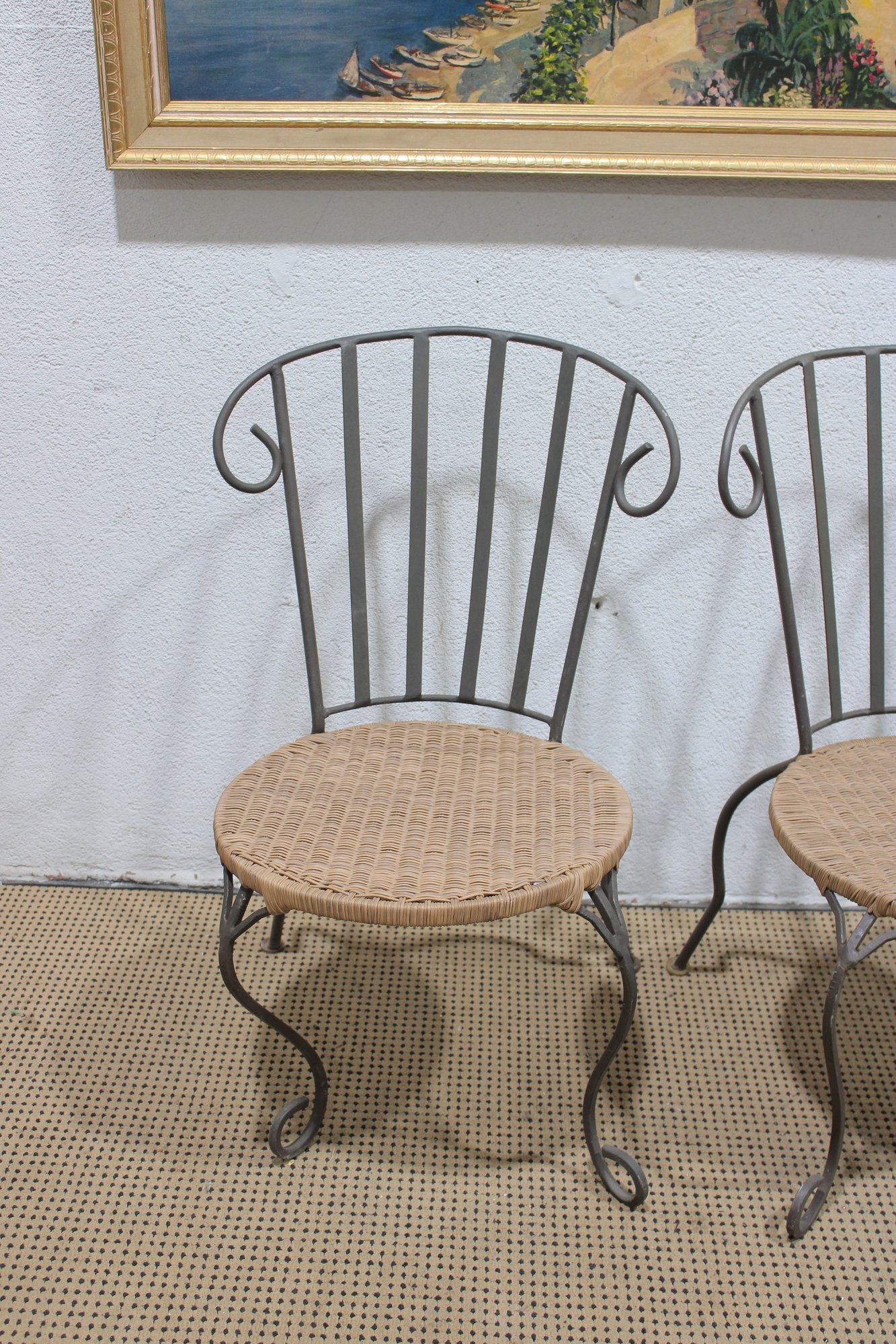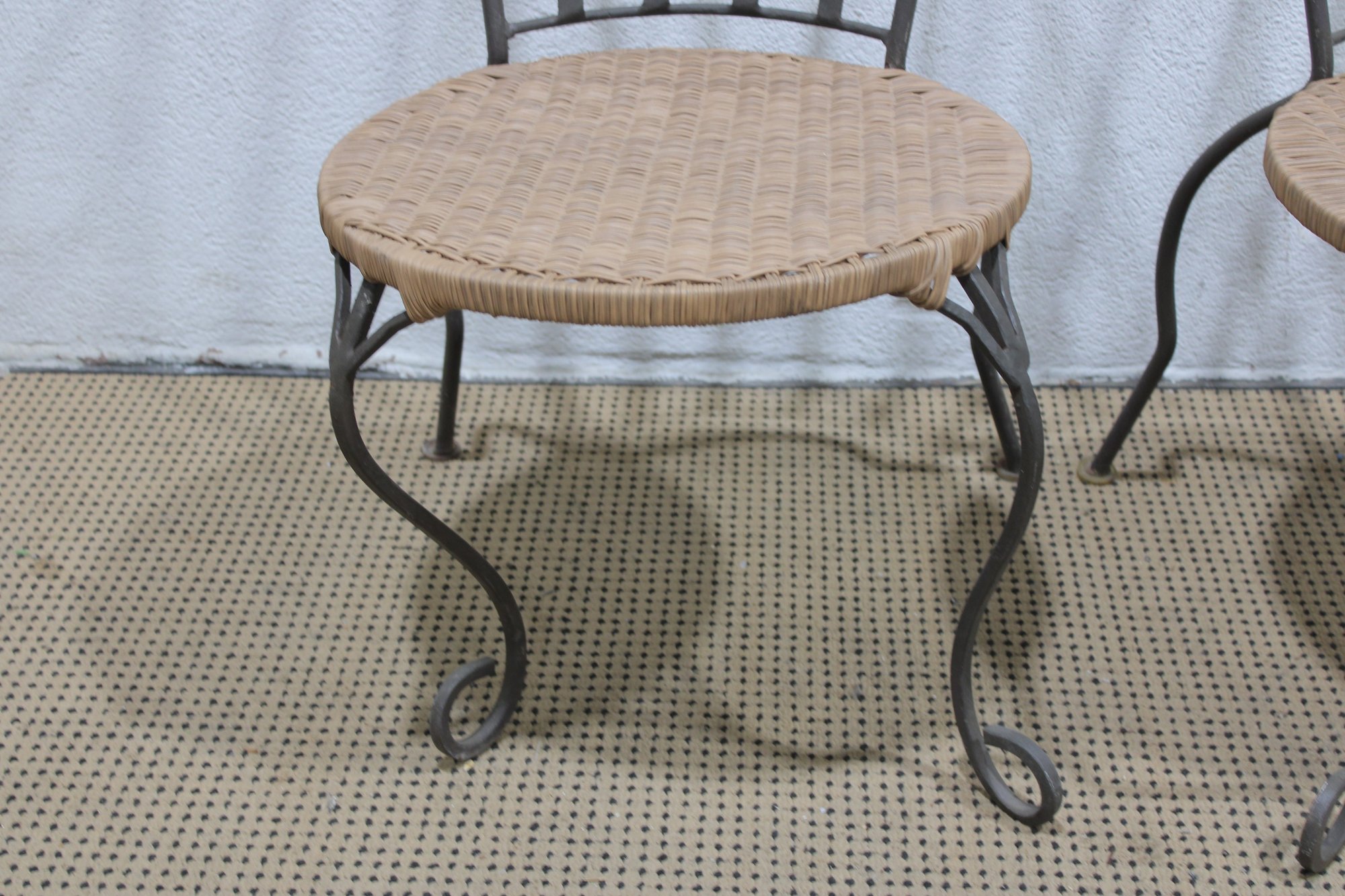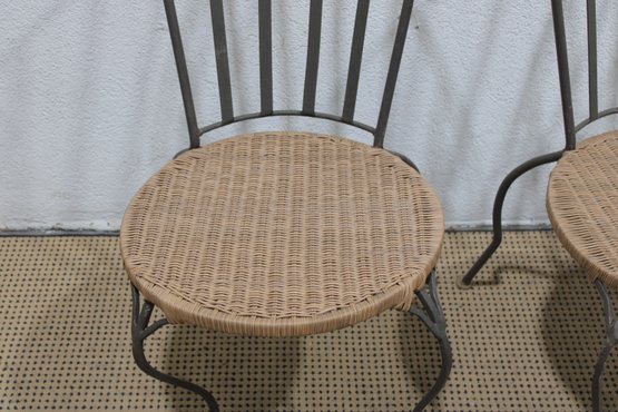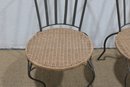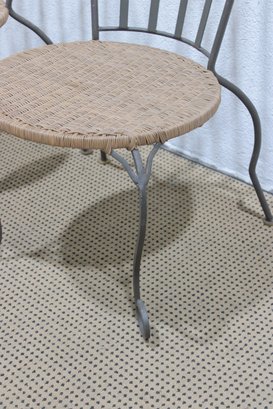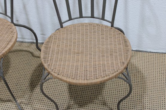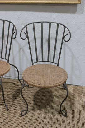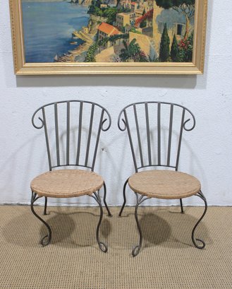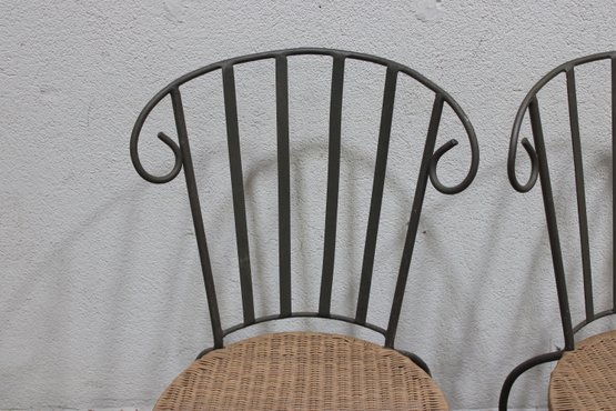 pair of metal bistro chairs featuring decorative scroll backs and woven round seats. These chairs have a light, airy design that works beautifully in a sunroom, patio, breakfast nook, or café-style setting.