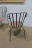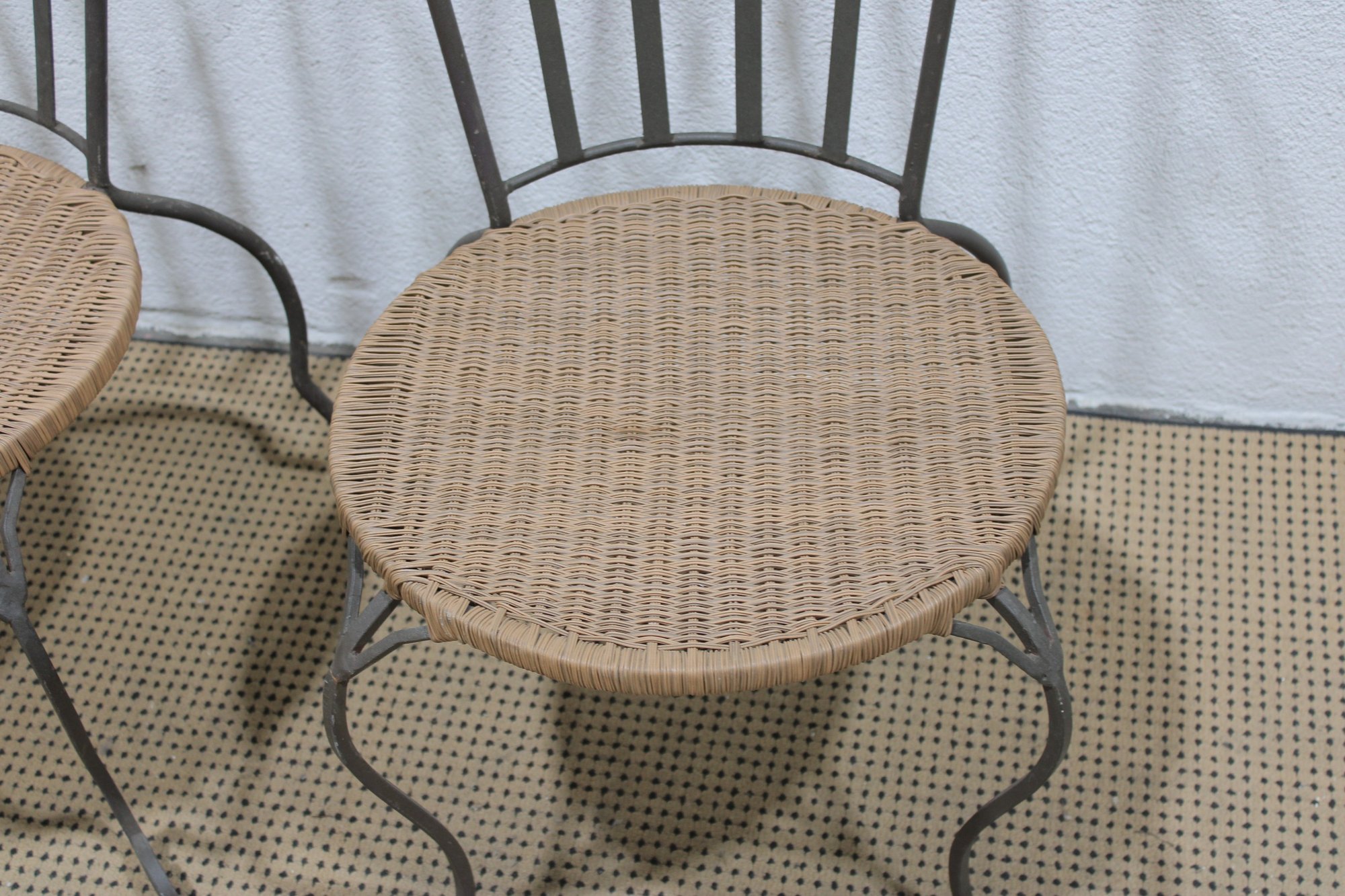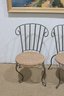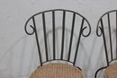Each chair features a curved metal back with vertical slats and elegant scroll details at the top corners. The round woven seats measure approximately 18.5 inches in diameter, offering comfortable seating with a natural texture that contrasts nicely with the painted metal frame. The legs have gentle curves and small decorative feet that add to the overall charm.