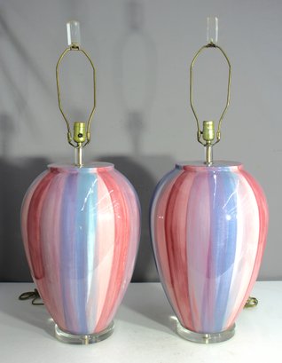 Add a touch of elegance to your home with this exquisite pair of table lamps. Featuring a beautifully hand-painted striped glass base in soft hues of pink, lavender, and blue, these lamps sit atop sturdy lucite platforms, providing a modern yet classic aesthetic. The lamps are complete with brass fittings and harp, making them ready for your choice of shades. Perfect for a living room, bedroom, or any space that needs a pop of color and sophistication. Both lamps are in excellent condition with minor signs of wear on the base, adding to their unique charm. Don't miss the chance to own these timeless pieces!