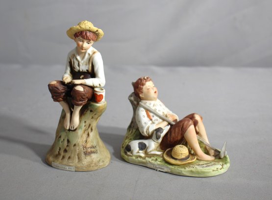 "Summertime 1933" features a young boy perched atop a stonewall-5.5"H , enjoying the simple pleasure of a sunny day, while "Lazybones" 3.5"H depicts a boy lounging beside his loyal dog, lost in the tranquility of a lazy afternoon. Both figurines are adorned with fine details, from the textures of their clothing to the expressions on their faces, and are highlighted by subtle yet vibrant coloration that brings each scene to life.