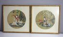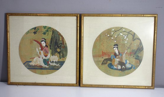 A stunning pair of Oriental-style framed artworks featuring circular designs of serene and traditional scenes. Each piece portrays a delicate balance of cultural elements, depicting elegant figures amidst natural landscapes. These exquisite works are housed in golden bamboo-style frames, enhancing their timeless beauty.