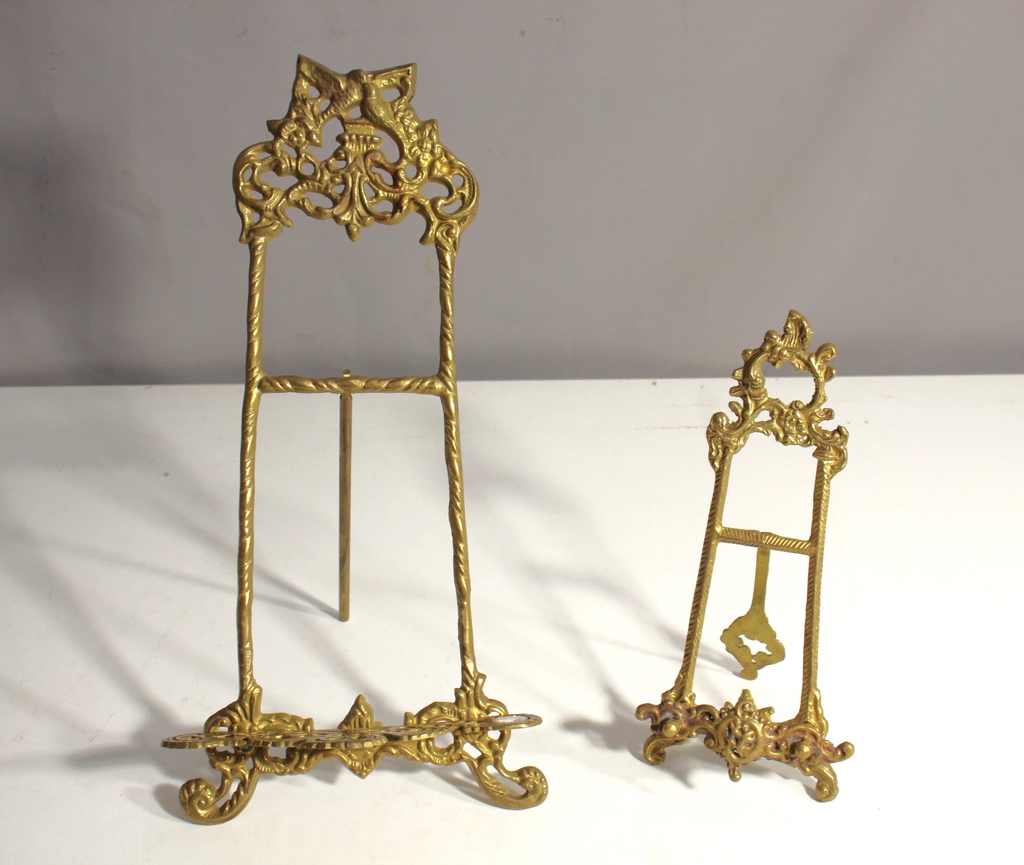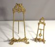 A beautiful pair of antique brass easel stands with intricate detailing, ideal for displaying pictures, books, or small decorative objects. These stands feature elegant craftsmanship with a delicate floral and scroll motif, making them both functional and aesthetically pleasing.
