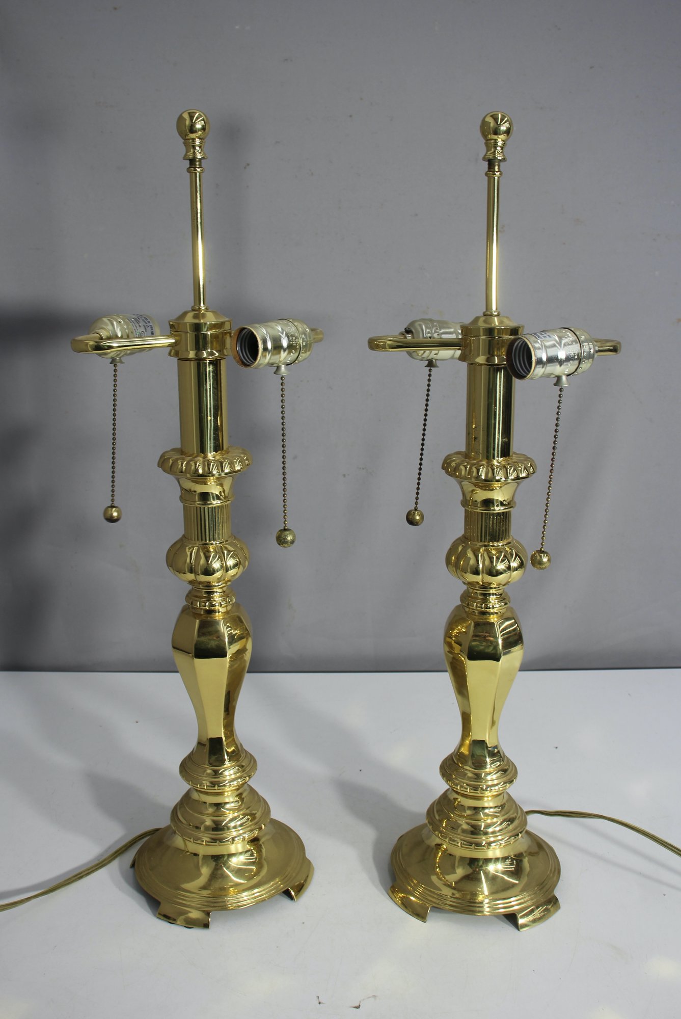 This elegant pair of polished brass table lamps features timeless design and dual light fixtures with pull chains for added convenience. Each lamp stands on a sturdy, decorative base with intricate detailing, showcasing excellent craftsmanship. The lamps are wired for standard use and offer a touch of classic charm to any room. The bases show minor wear consistent with age, adding character to the set. Perfect for a traditional or vintage-style home decor setup. Ready to brighten your space!