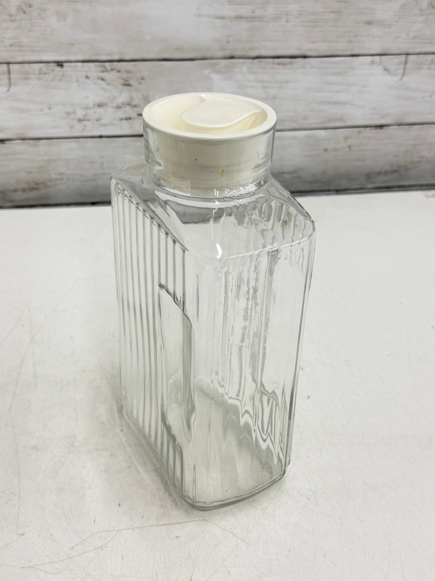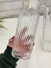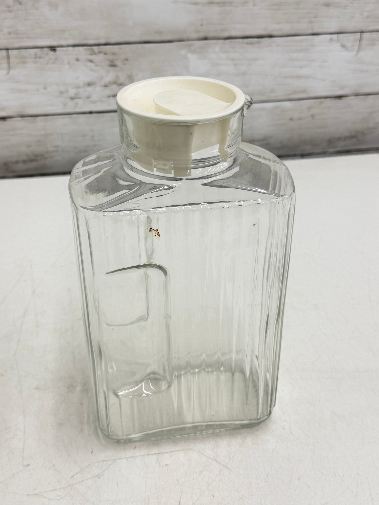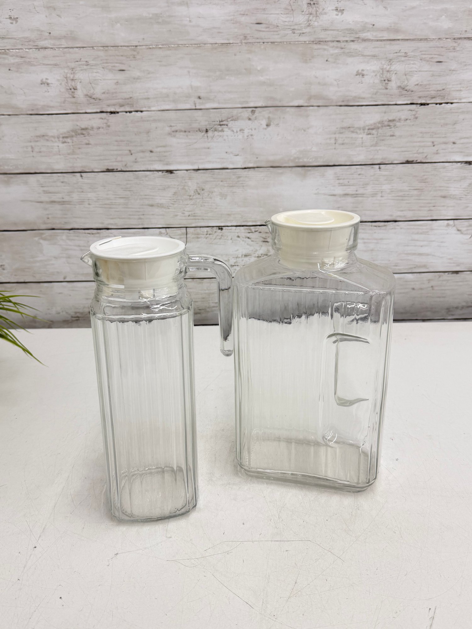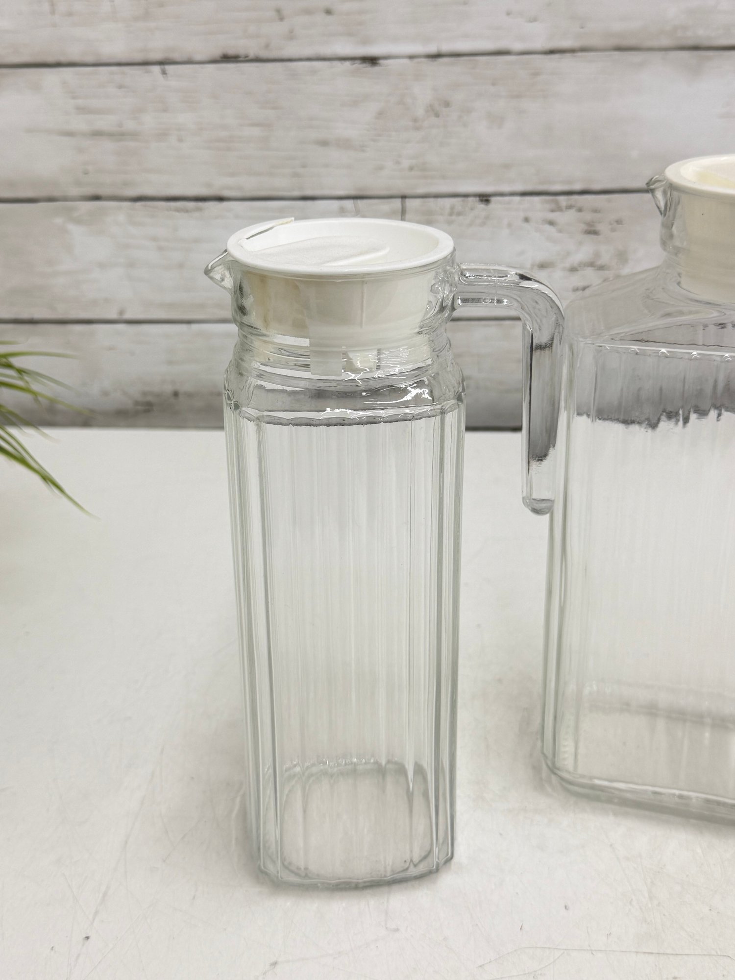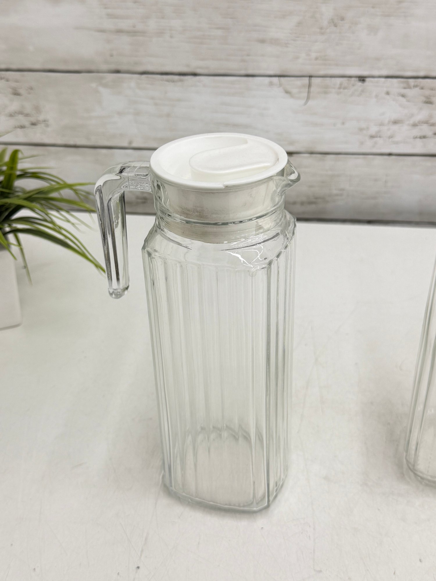 Pair Of Ribbed Glass Beverage Pitchers W/ Lids Vintage Modern 10" H