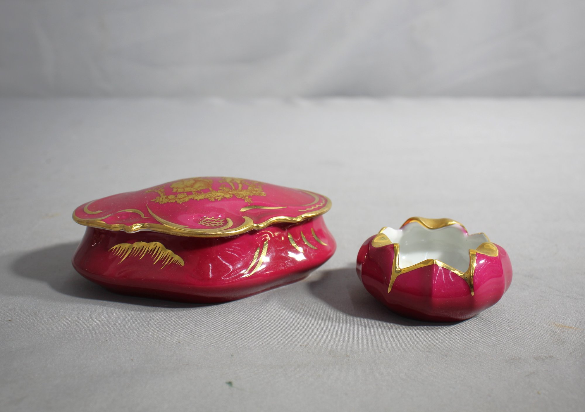 small Limoges porcelain dish, ornately adorned with a rich magenta glaze and accented with gold gilding. The central tableau showcases a classic Rococo scene, The small dish features a vivid magenta rim with luxurious gold gilt accents, creating a stunning contrast that frames the pastoral scene depicted at the center. The scene, inspired by the Rococo artist Watteau, captures an idyllic moment of leisure in the French countryside