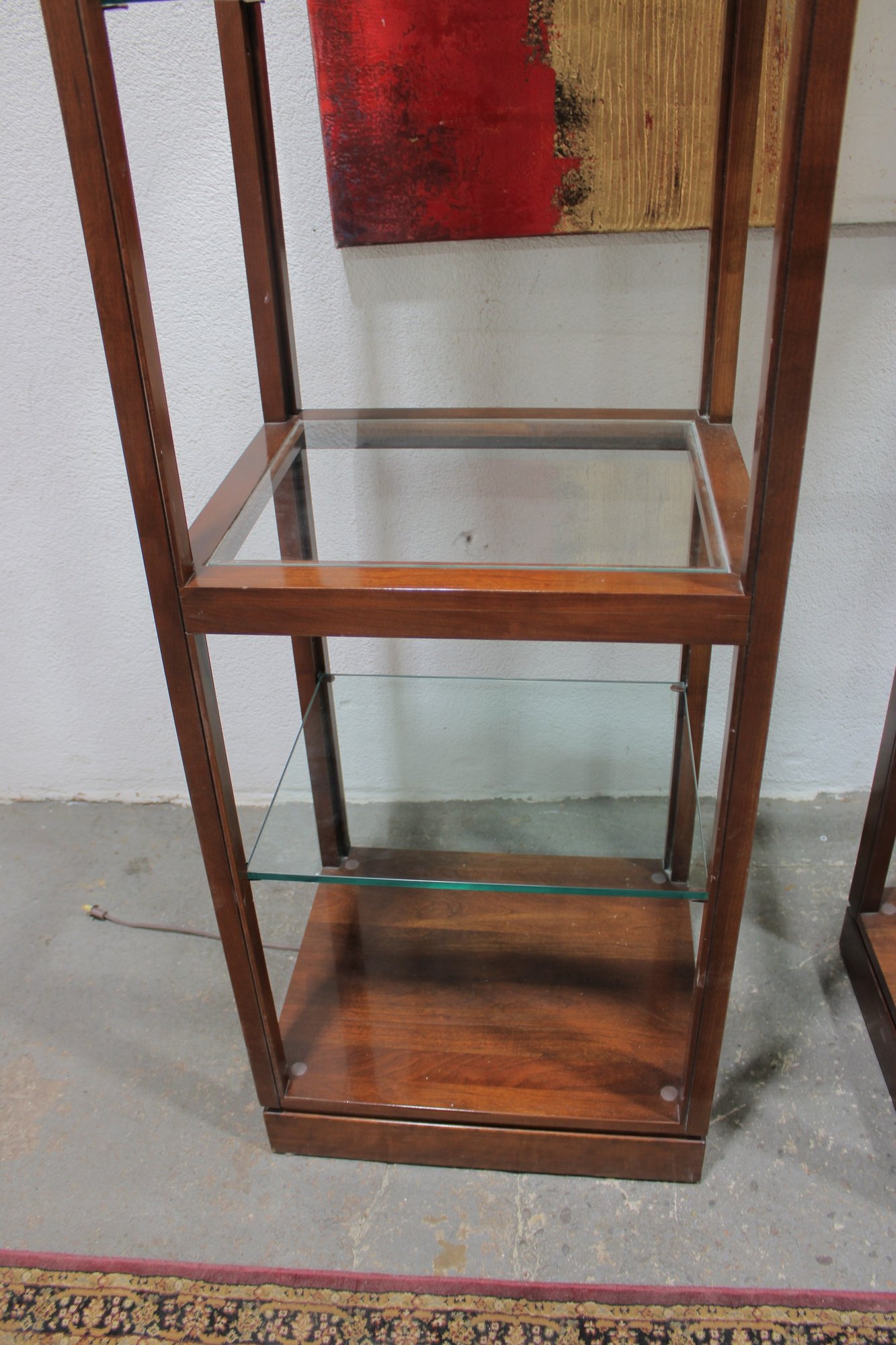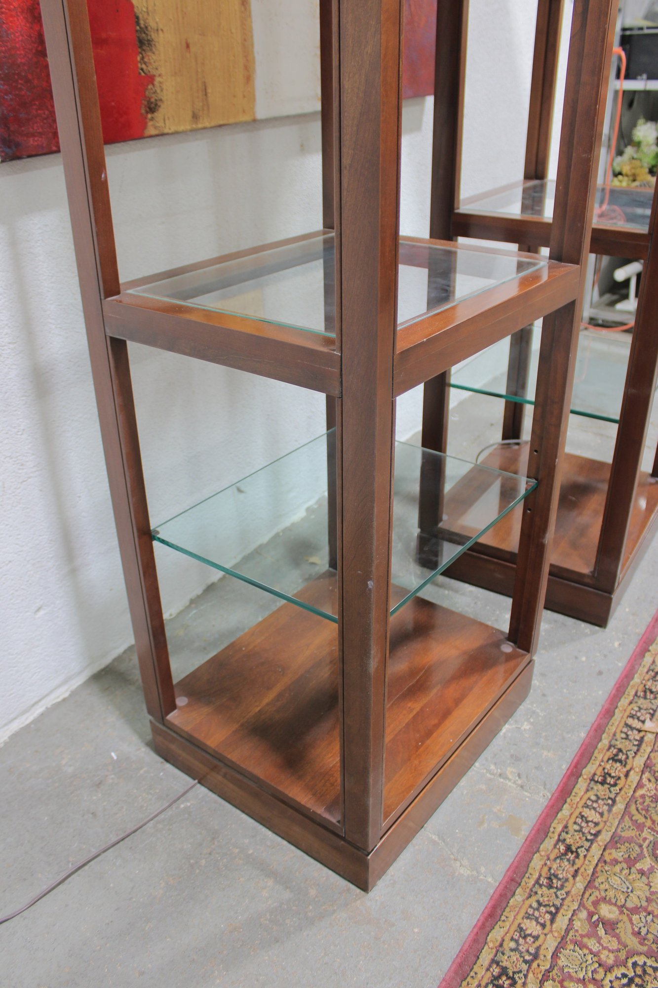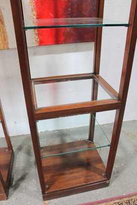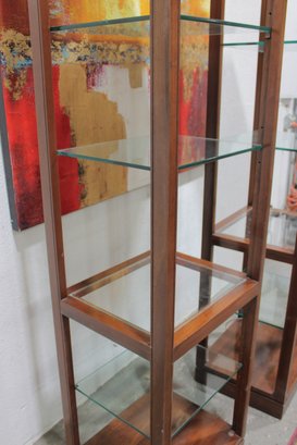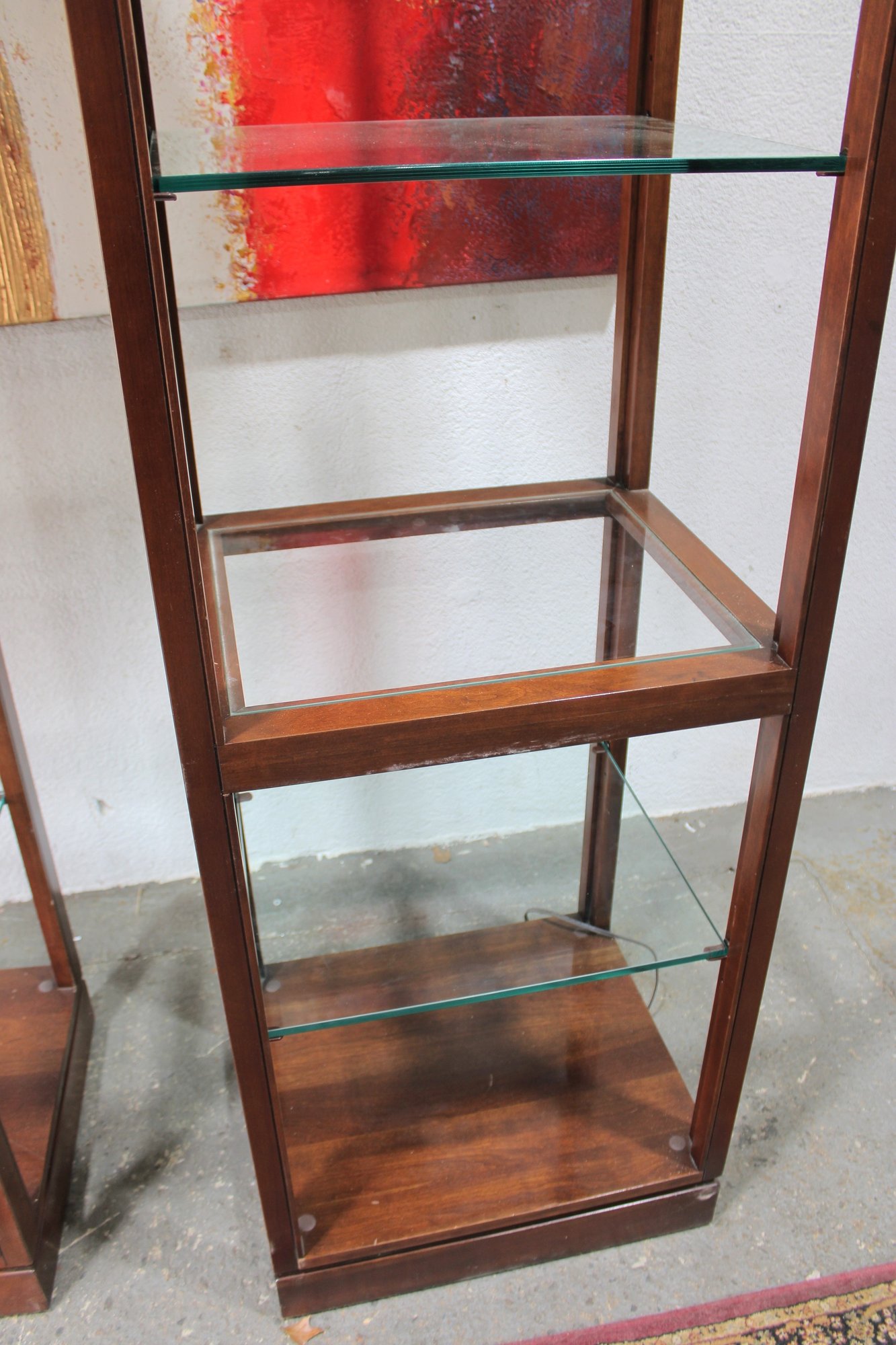 a matching pair of tall wood and glass curio display cabinets, perfect for showcasing collectibles, art objects, or decorative pieces. Each cabinet features a clean, contemporary frame with warm wood tones and multiple glass display shelves that allow items to be viewed from several angles.