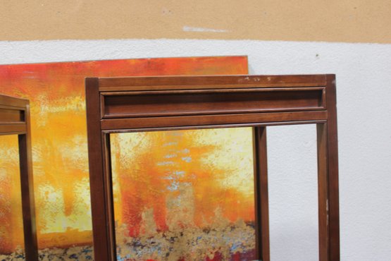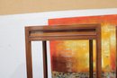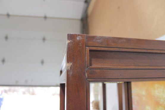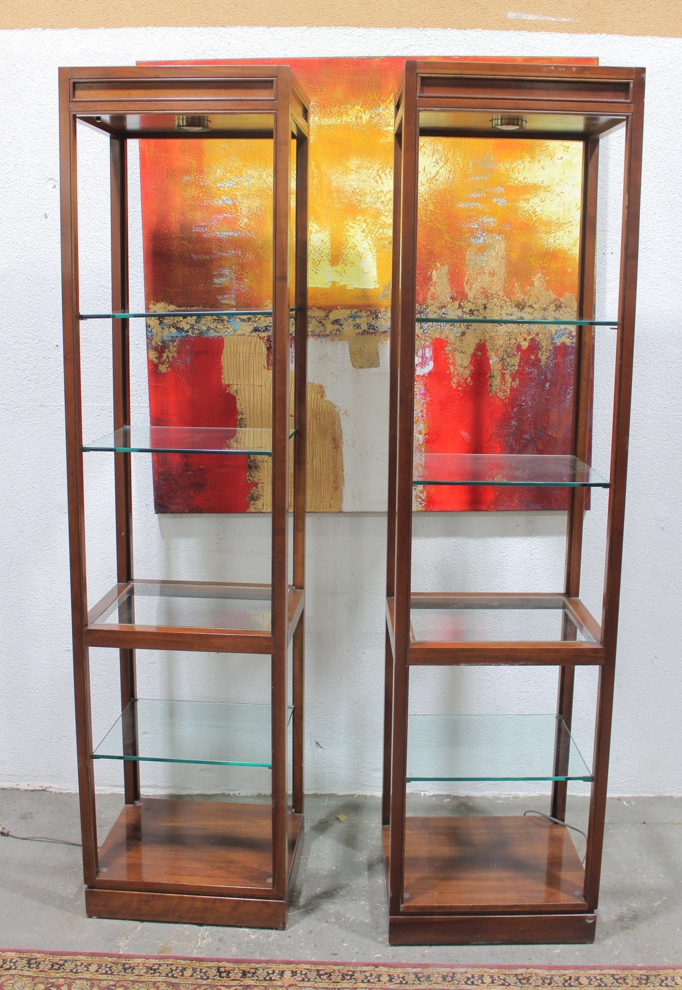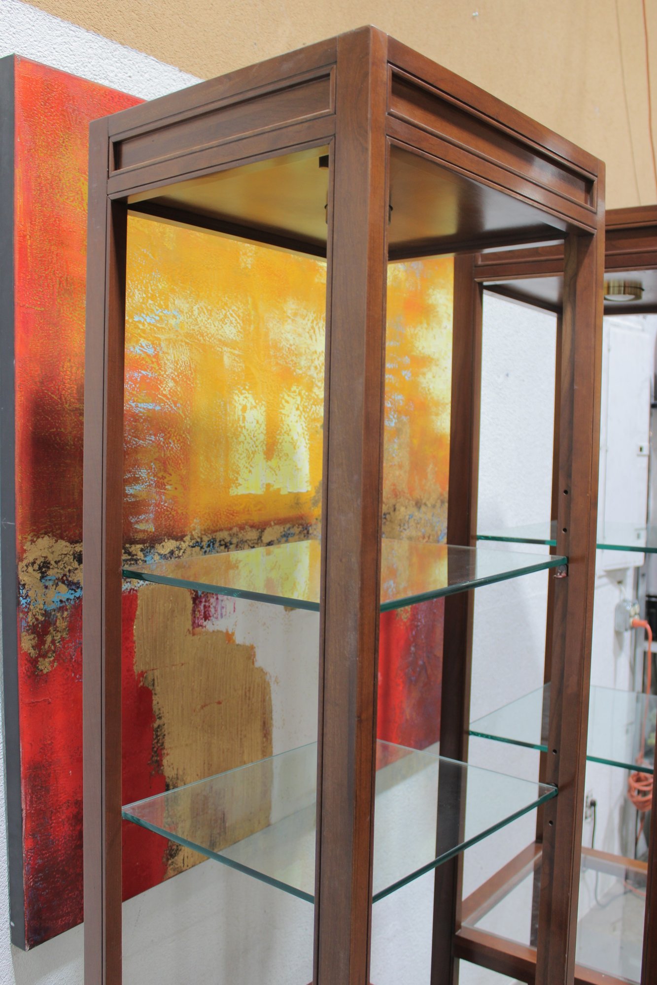 a matching pair of tall wood and glass curio display cabinets, perfect for showcasing collectibles, art objects, or decorative pieces. Each cabinet features a clean, contemporary frame with warm wood tones and multiple glass display shelves that allow items to be viewed from several angles.