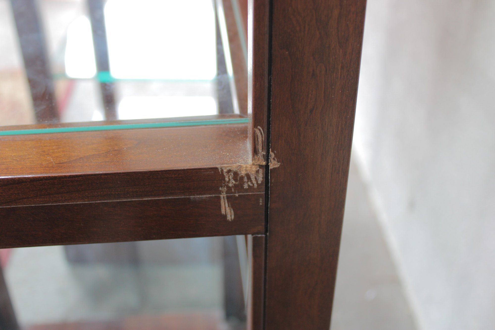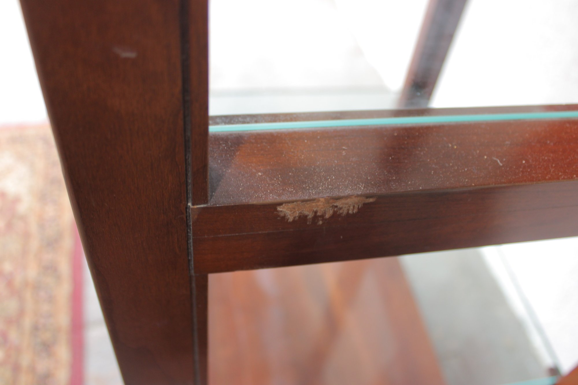 The open glass shelving provides an elegant and minimal presentation style while the sturdy wood frame adds warmth and durability.