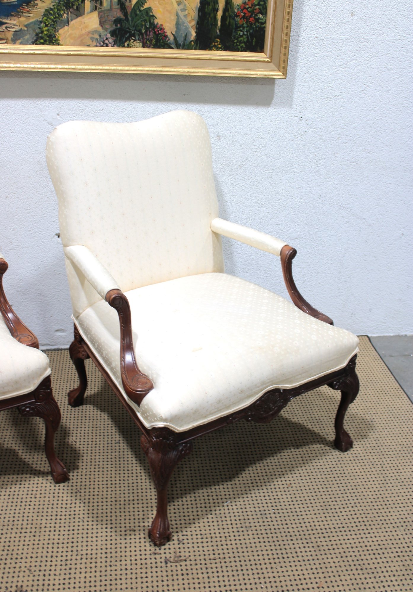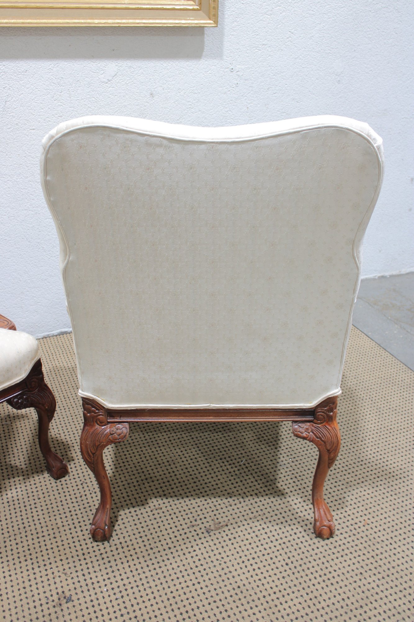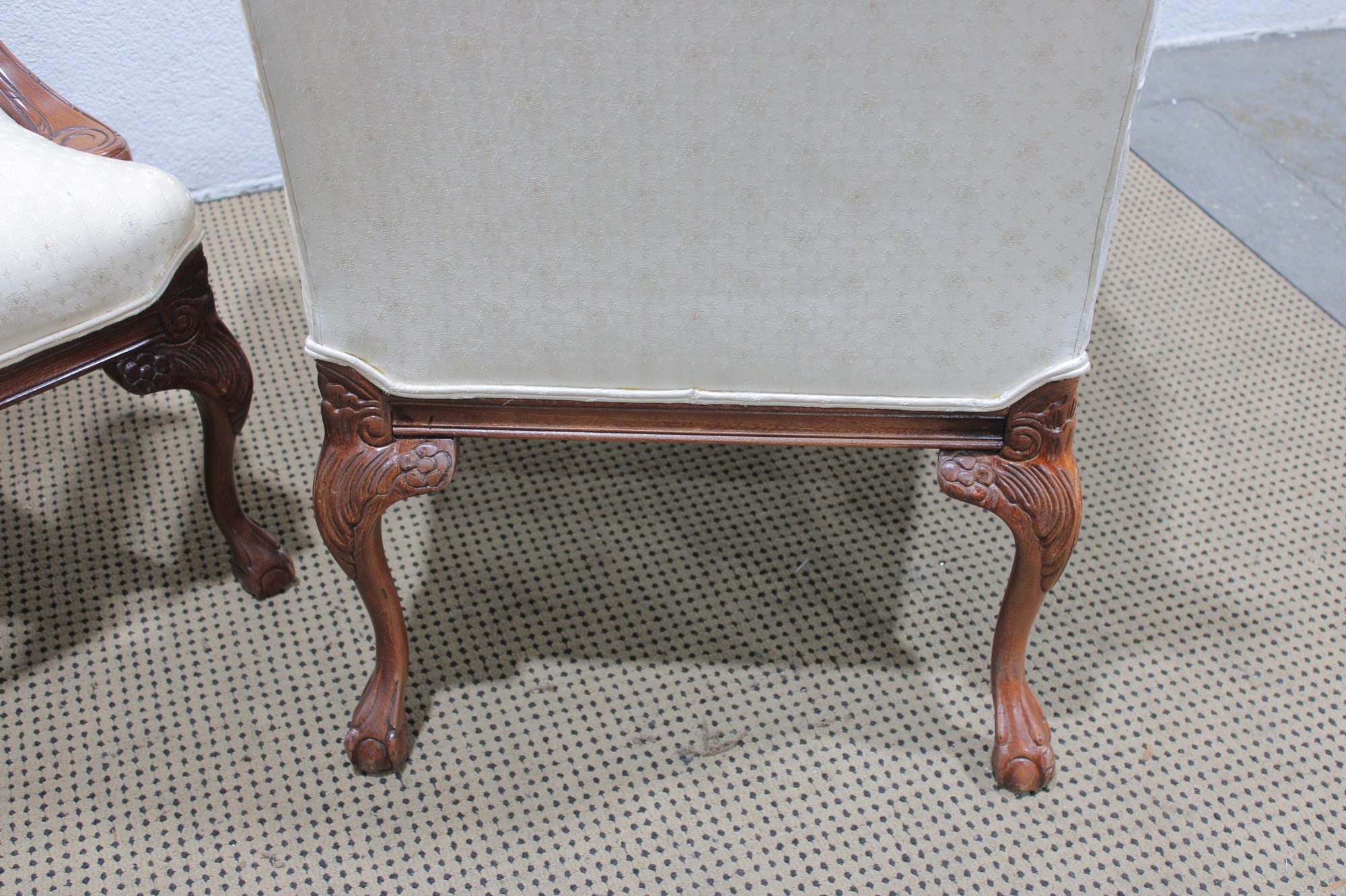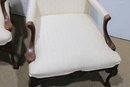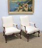 pair of traditional upholstered armchairs featuring carved wood frames and graceful cabriole legs. These refined accent chairs offer classic styling with comfortable proportions, making them ideal for a formal living room, sitting area, office, or bedroom.