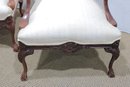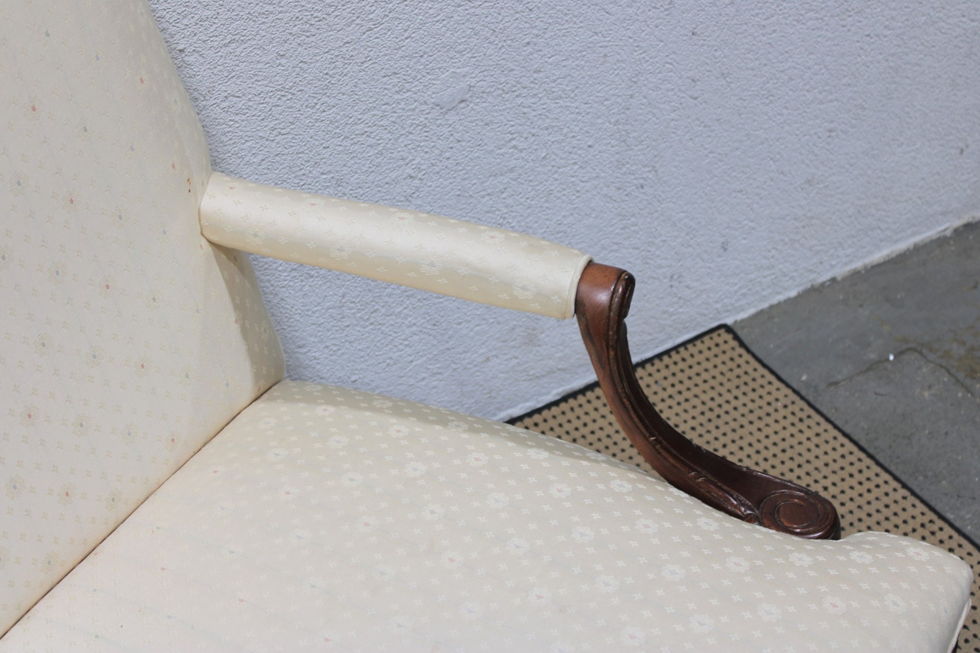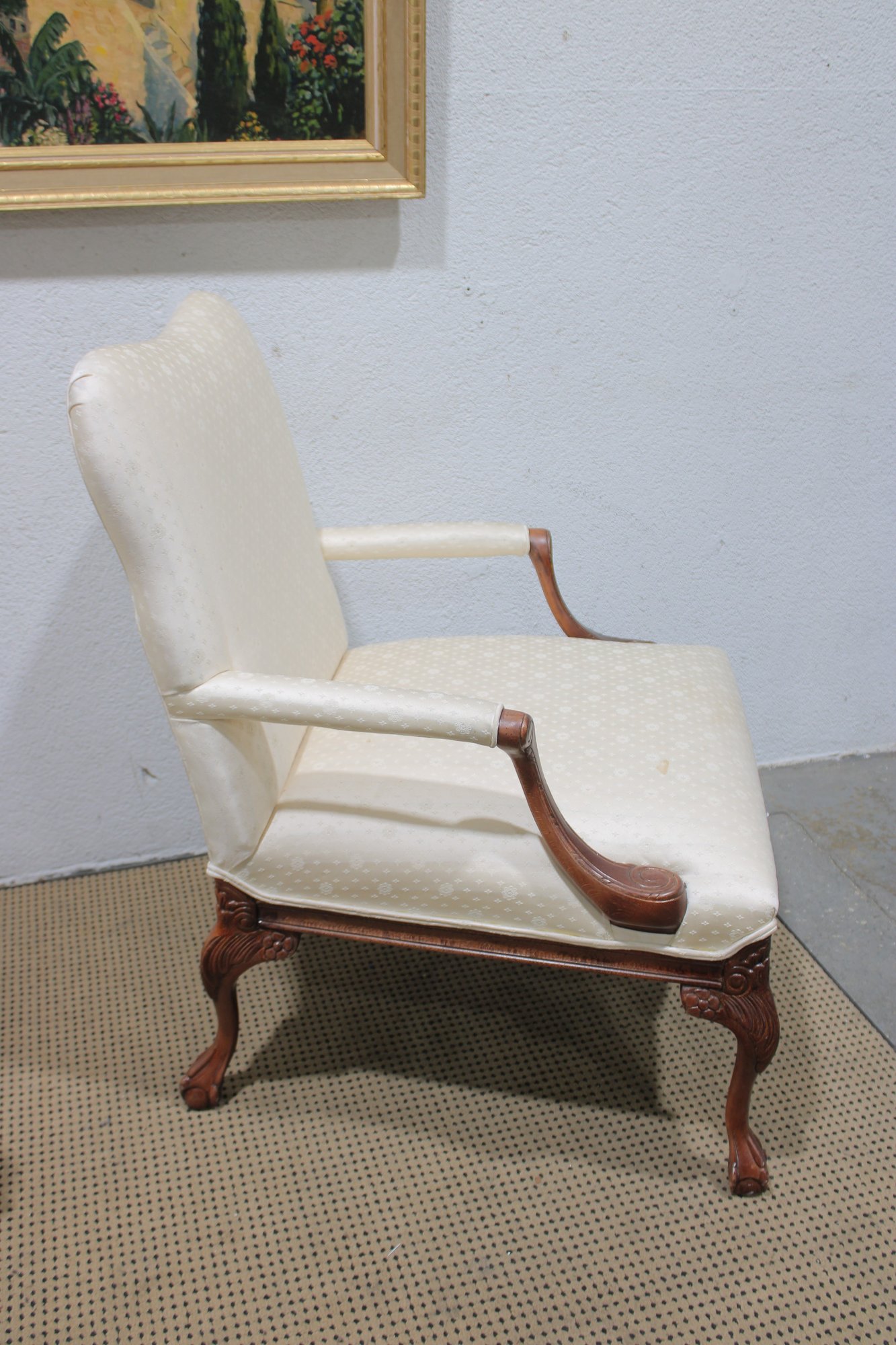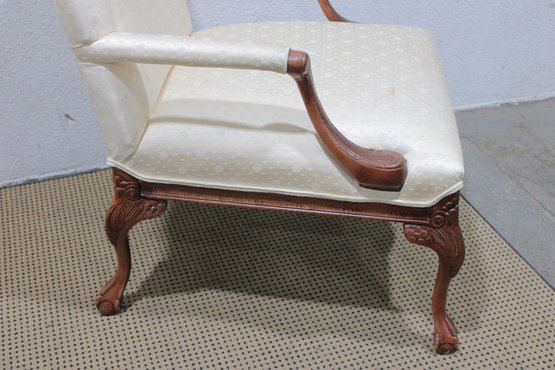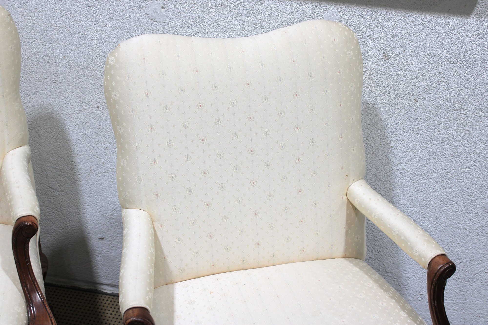 pair of traditional upholstered armchairs featuring carved wood frames and graceful cabriole legs. These refined accent chairs offer classic styling with comfortable proportions, making them ideal for a formal living room, sitting area, office, or bedroom.