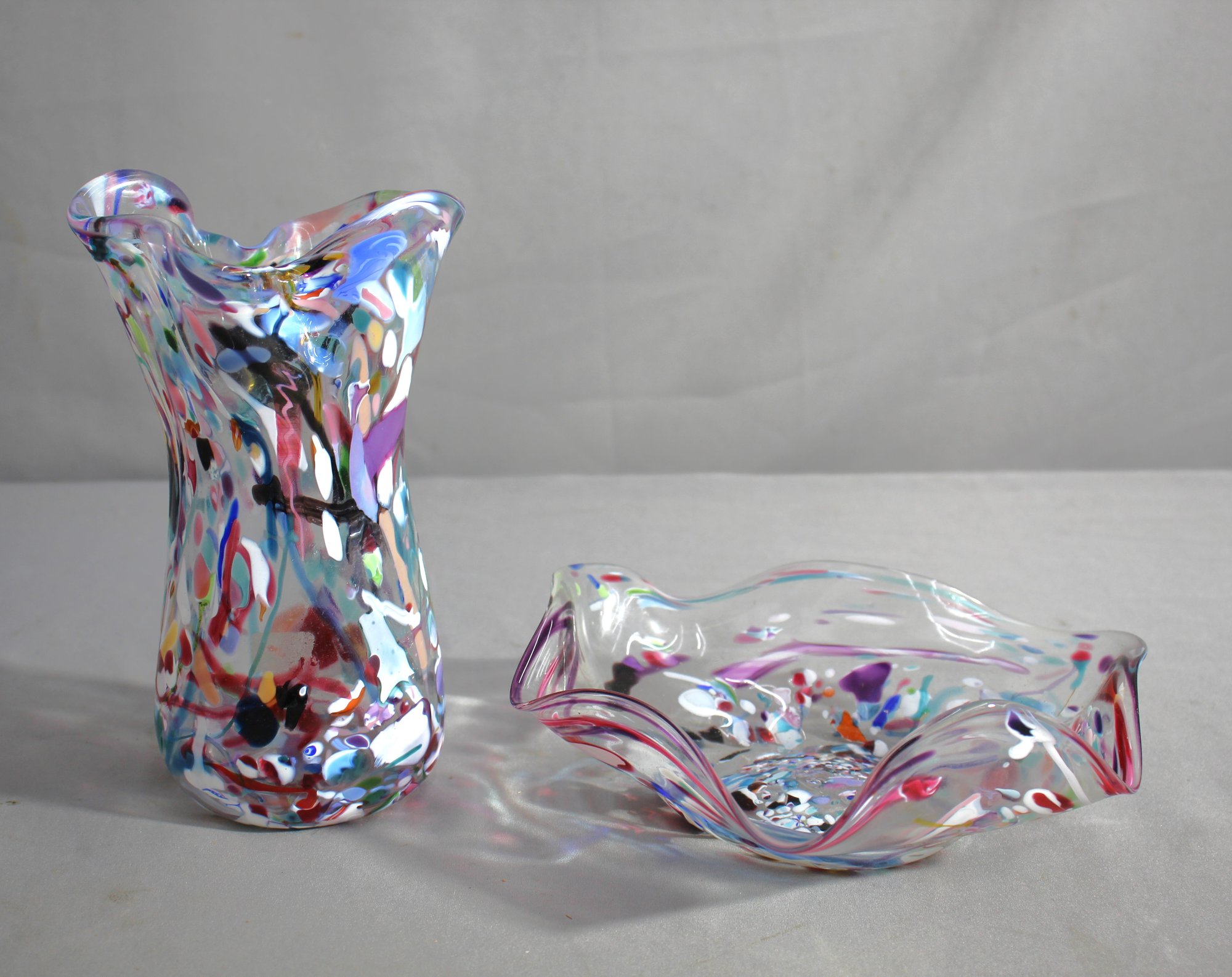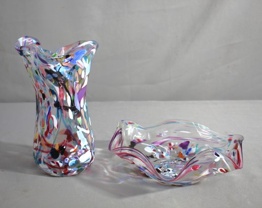 Add a splash of color to your collection with this exquisite pair of multicolor Murano-style art glass pieces. This set includes a stunning vase and a unique dish, both showcasing the intricate craftsmanship and vibrant patterns characteristic of Murano glass.
