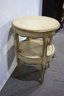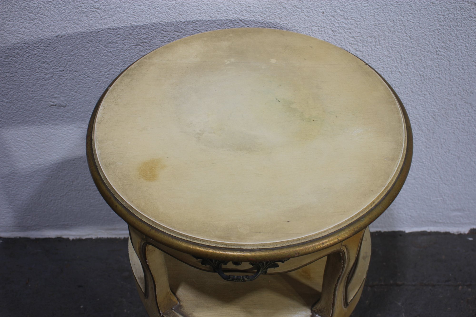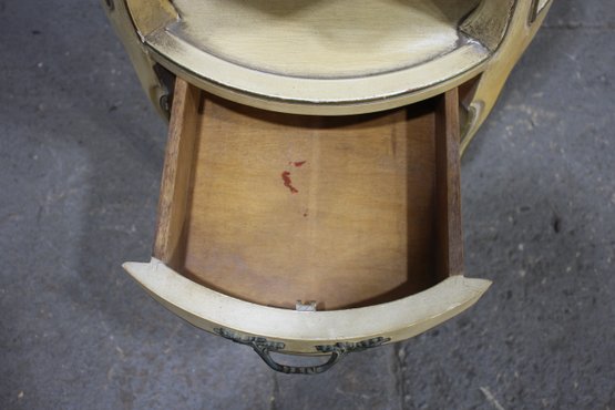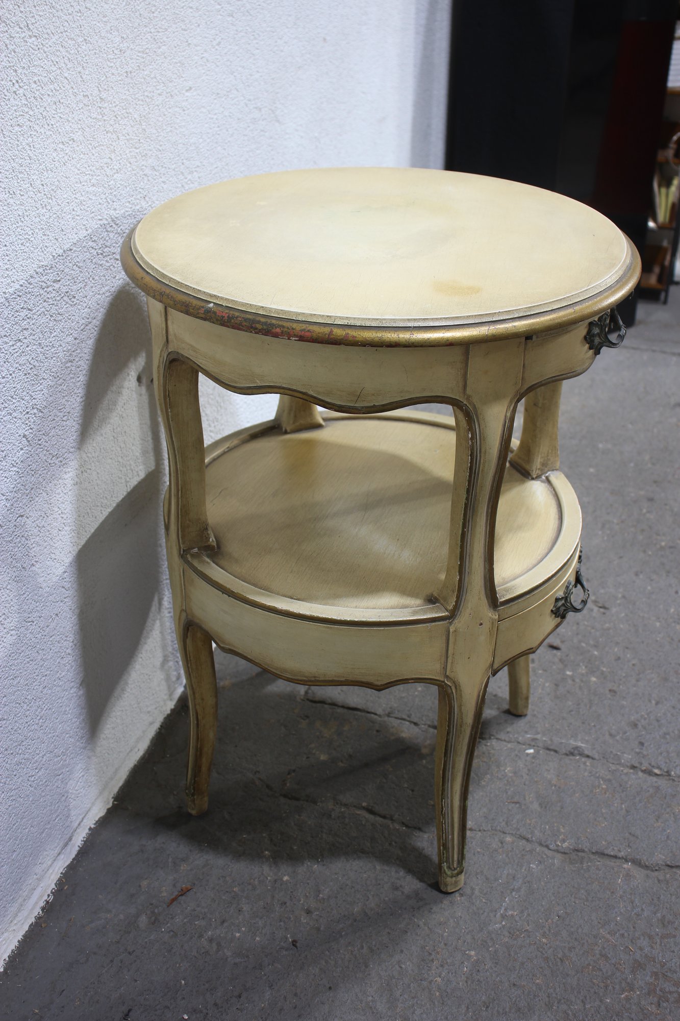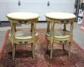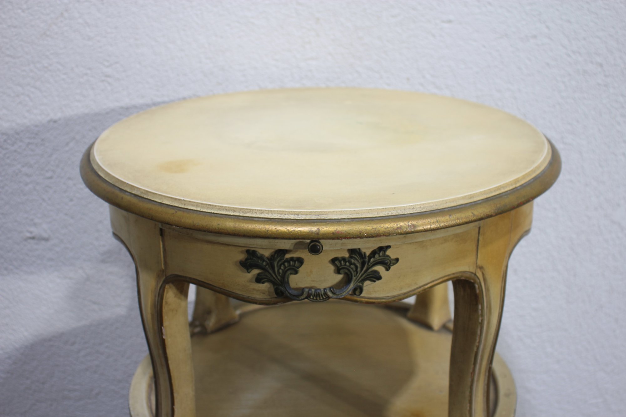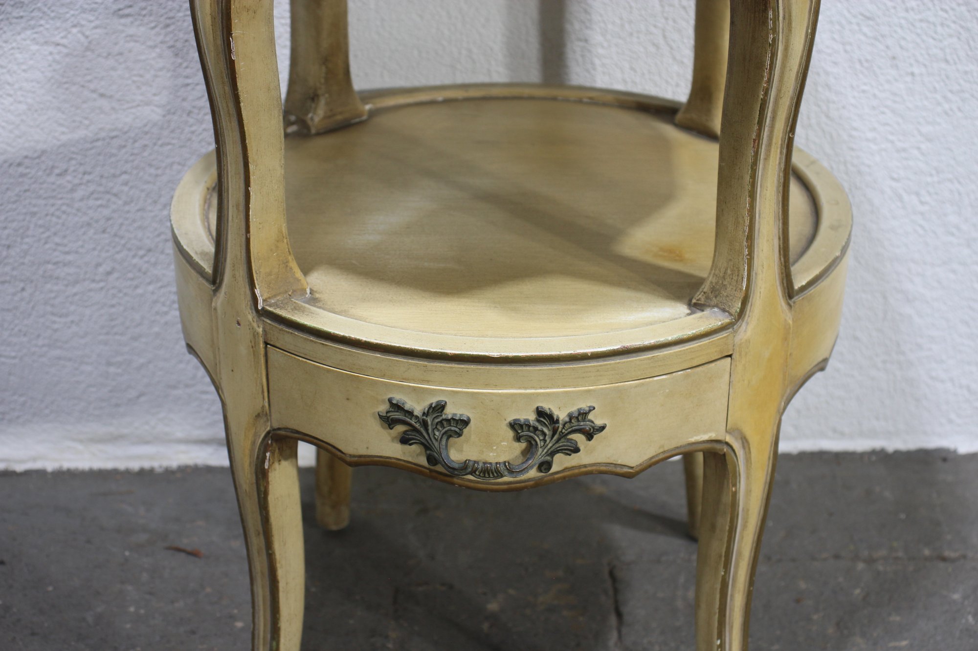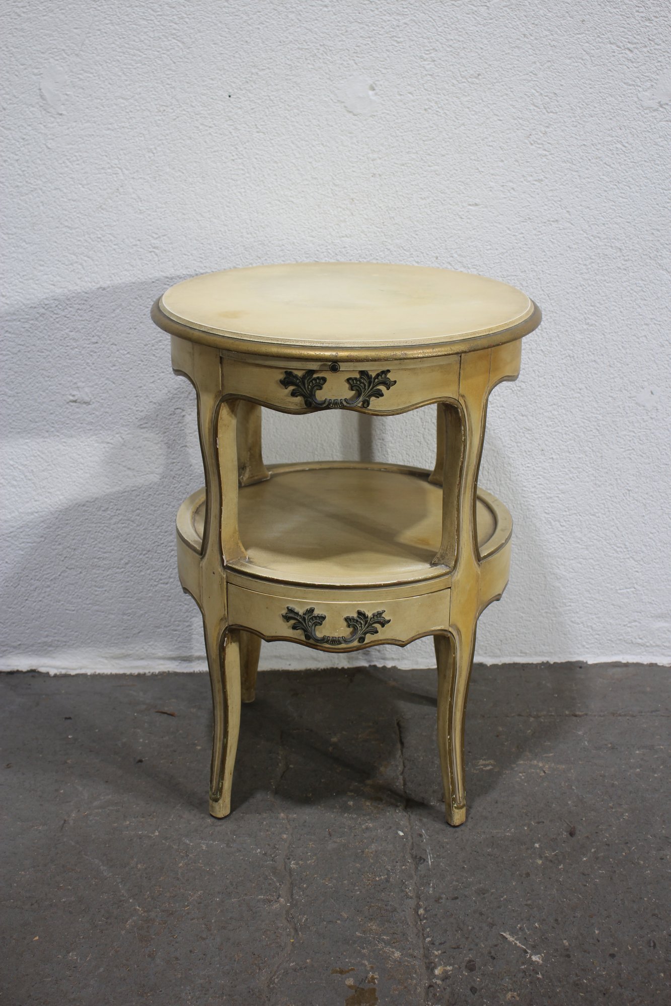 A pair of vintage, Antique French Provincial Two Tier Accent Tables. The top features a side tray that pulls out and the bottom has a pull out drawer with a decorative pull.