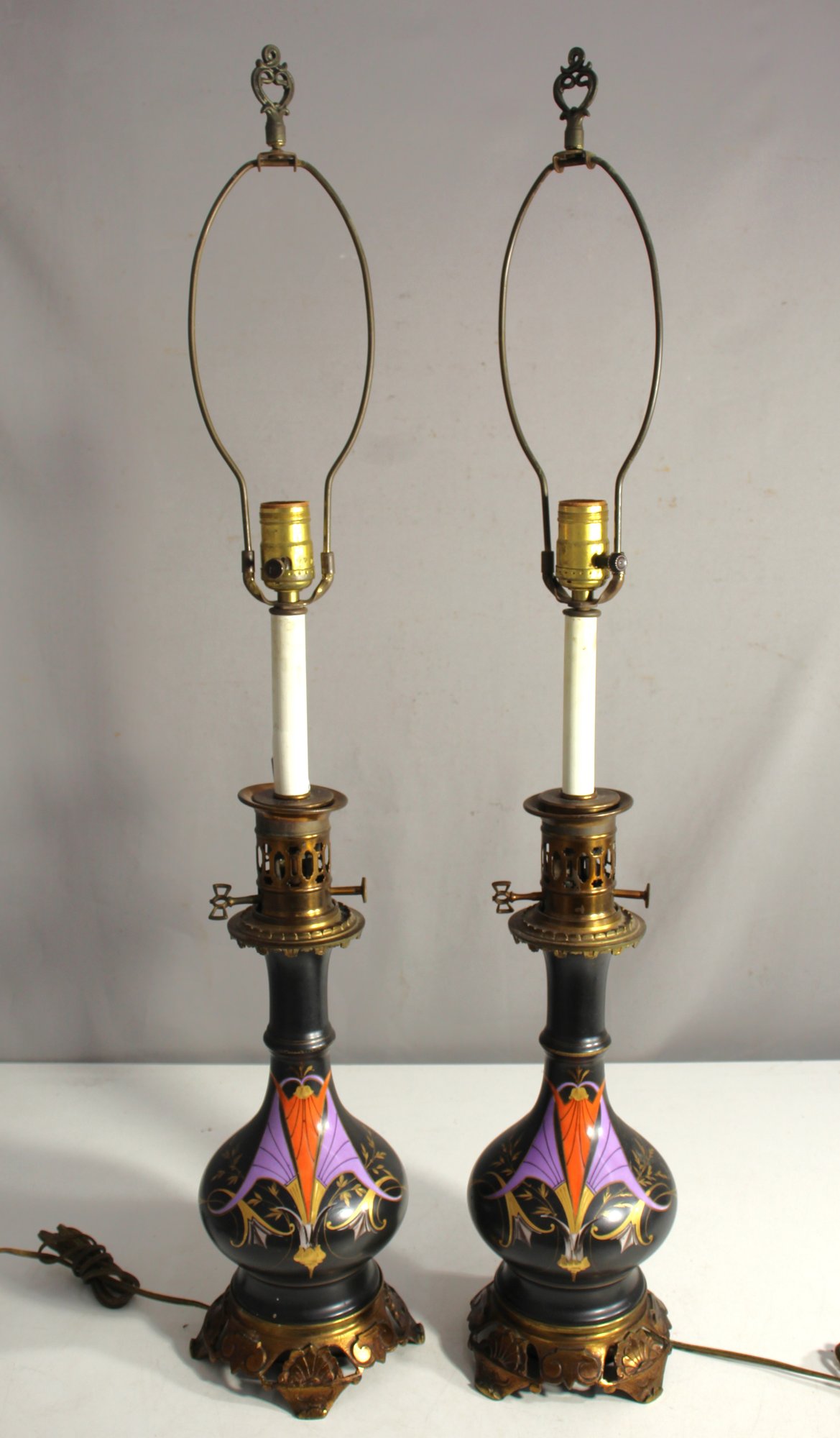 pair of Art Deco-inspired table lamps standing 35 inches tall. These striking lamps feature intricate hand-painted designs in bold orange, purple, and gold on a matte black base, supported by ornately detailed metal bases. Both lamps retain their vintage charm and are in good overall condition, showcasing an eye-catching blend of style and functionality. Perfect for adding a touch of classic Art Deco flair to any room.