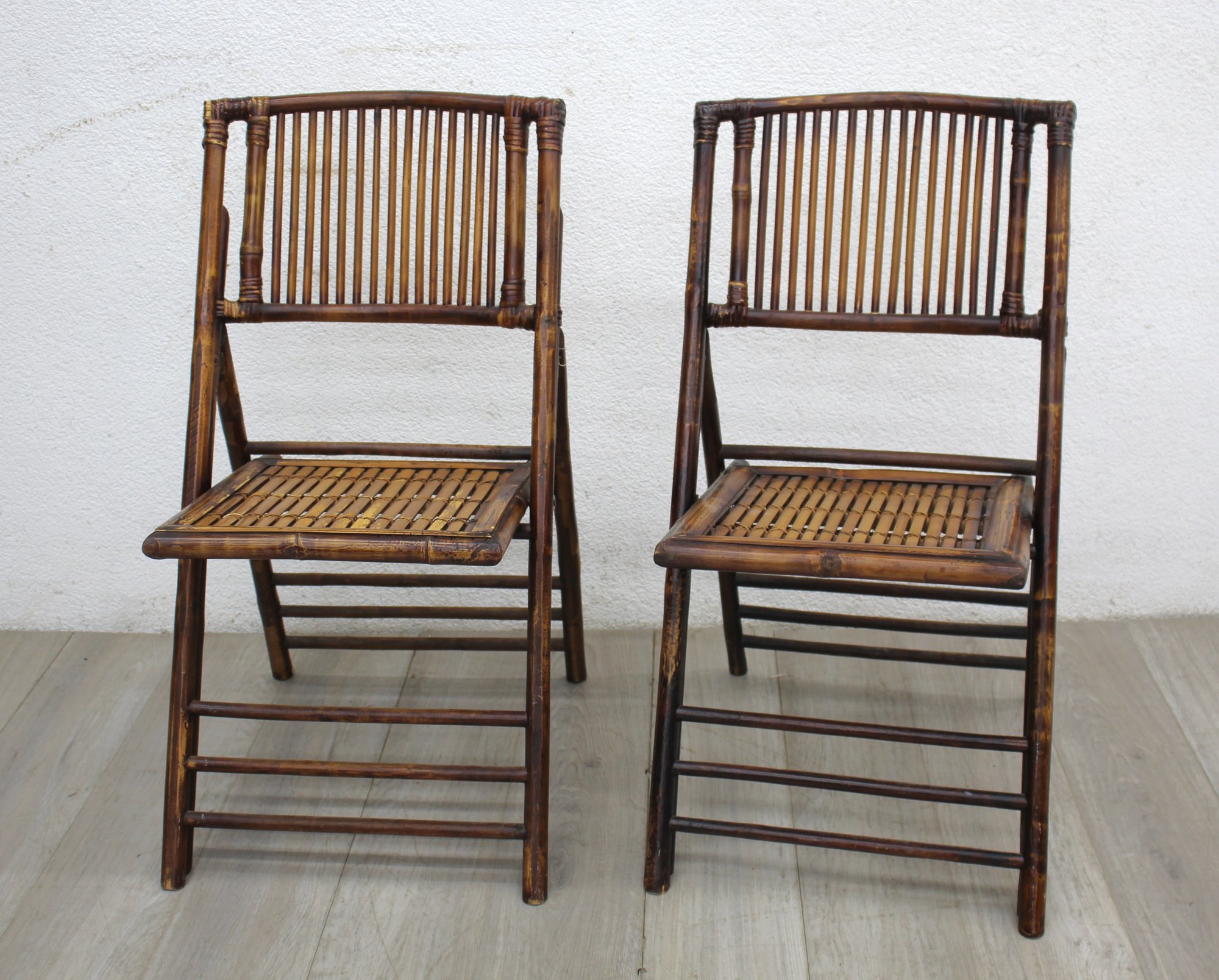 This charming pair of vintage folding chairs is made from sturdy bamboo, offering a natural and rustic appeal. The slatted backrest and woven seat design add both comfort and style, making these chairs perfect for outdoor gatherings, patios, or adding a touch of bohemian flair to your home decor. Lightweight and foldable for easy storage and transport. In good condition with some signs of wear consistent with age.