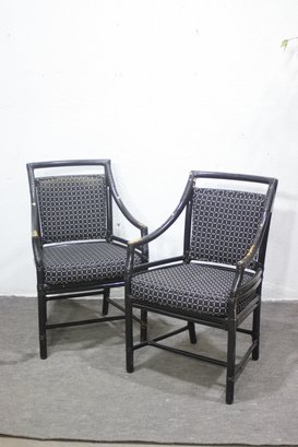 This pair of vintage black painted bamboo armchairs offers a stylish blend of mid-century, chinoiserie, and bohemian aesthetics. Featuring a sleek black lacquered finish with geometric-patterned upholstered seats, these chairs are both decorative and functional. Their curved armrests and slatted back design add to their elegant silhouette, making them perfect for a living room, sunroom, or accent seating area.