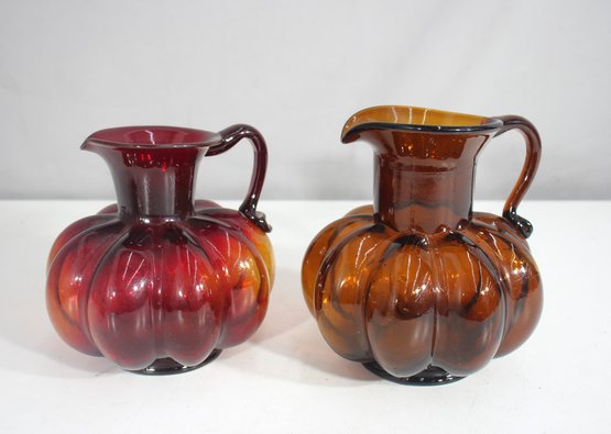 This stunning pair of vintage blown glass pitchers features a unique pumpkin-shaped design with deep ribbed detailing and a beautiful curved handle. One pitcher showcases a warm amber brown hue, while the other has a vibrant ruby red gradient with hints of orange, making them perfect for seasonal decor or glass collectors.