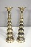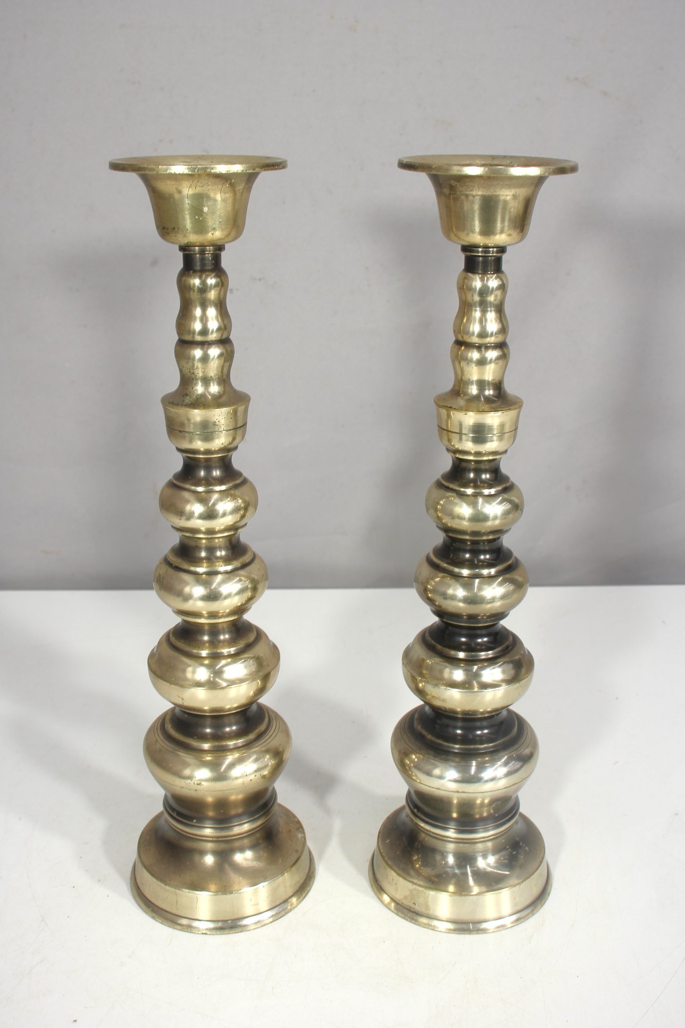 This elegant pair of vintage brass candlesticks features a classic turned silhouette with a beautifully aged patina. Standing at 15.5 inches tall, these candlesticks make a stunning statement on a mantel, dining table, or altar.