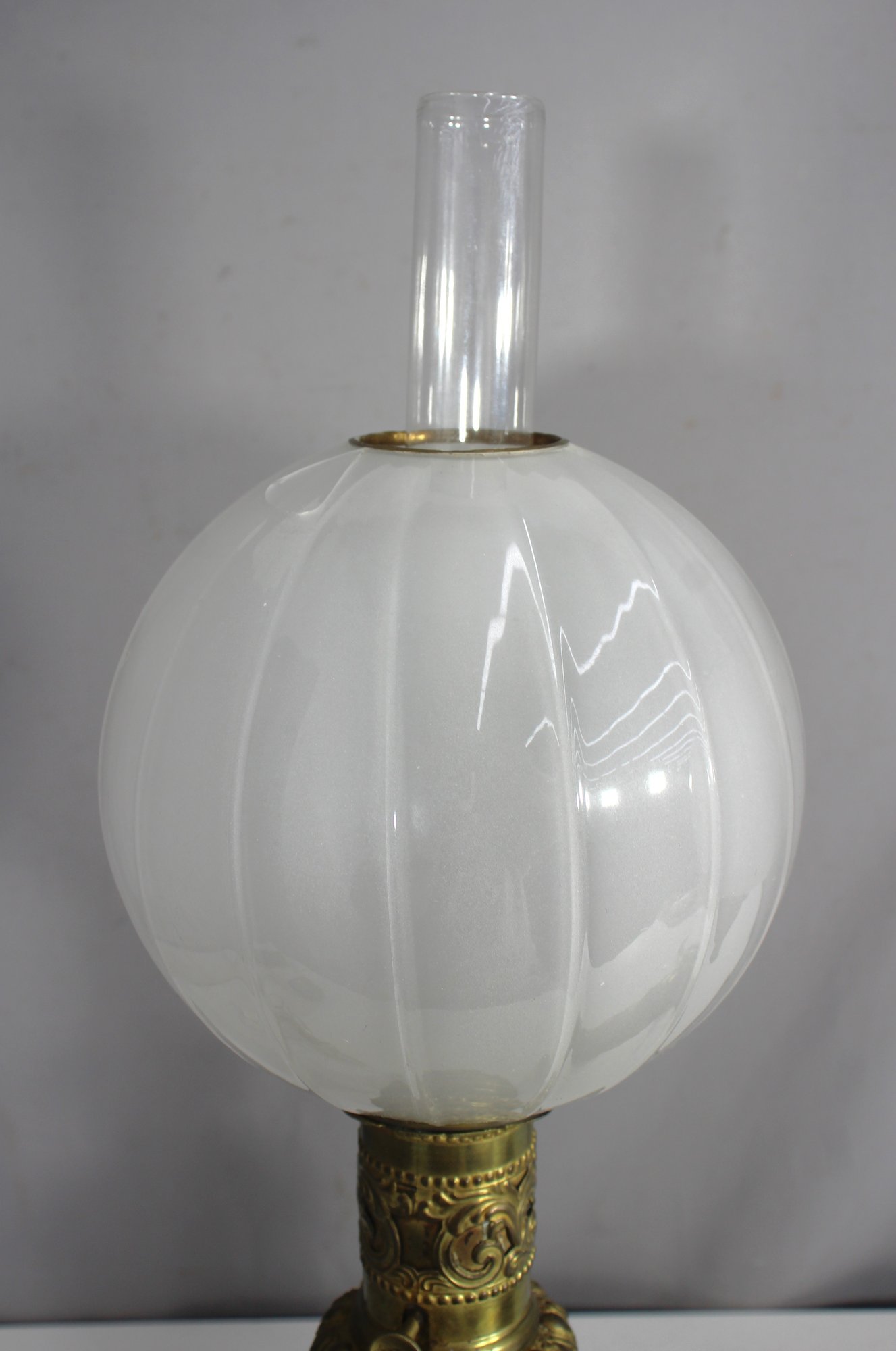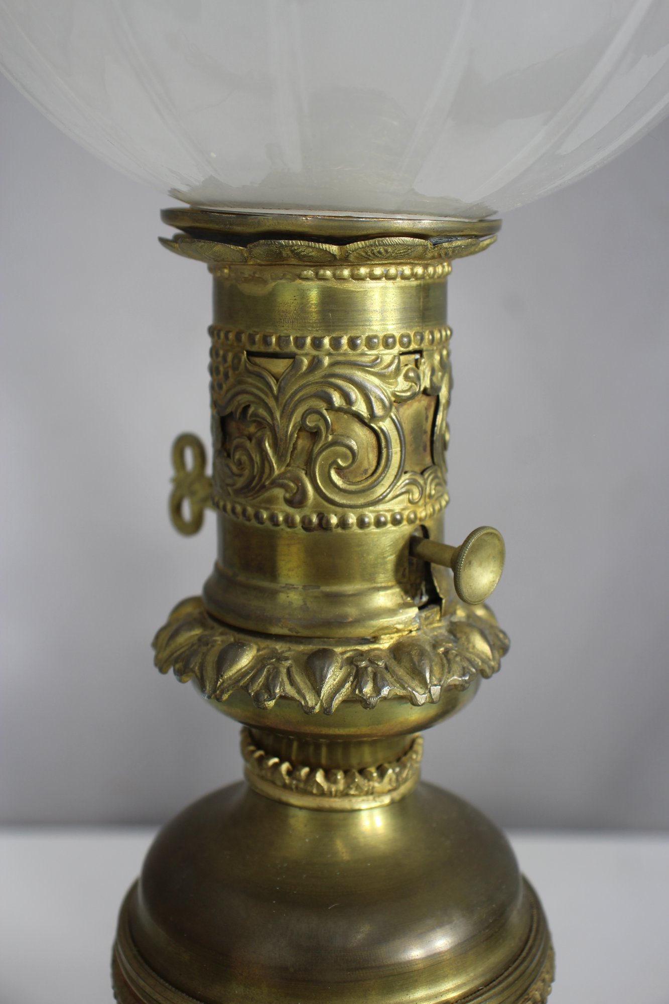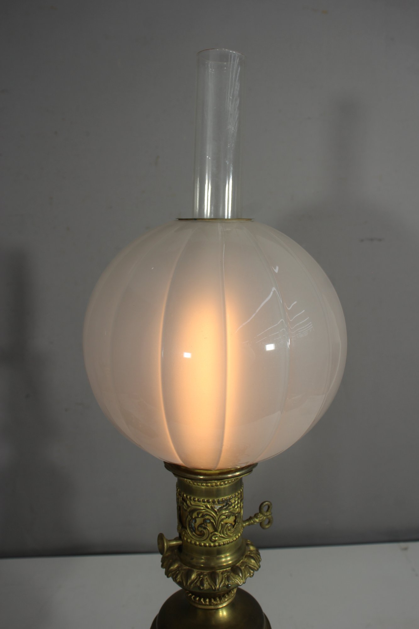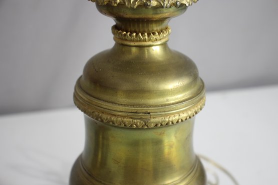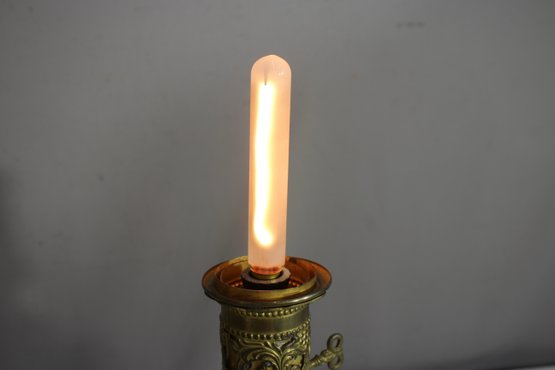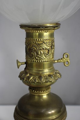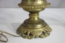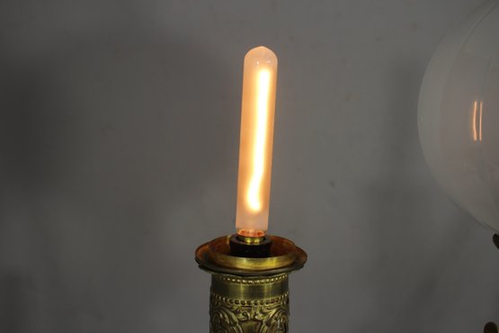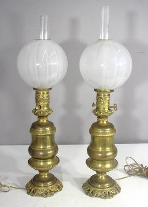 This stunning pair of vintage brass hurricane table lamps brings an air of Victorian elegance to any room. Each lamp features a beautifully detailed brass base with intricate floral engravings, supporting a white swirl glass globe and a clear glass chimney, evoking the charm of classic oil lamps.