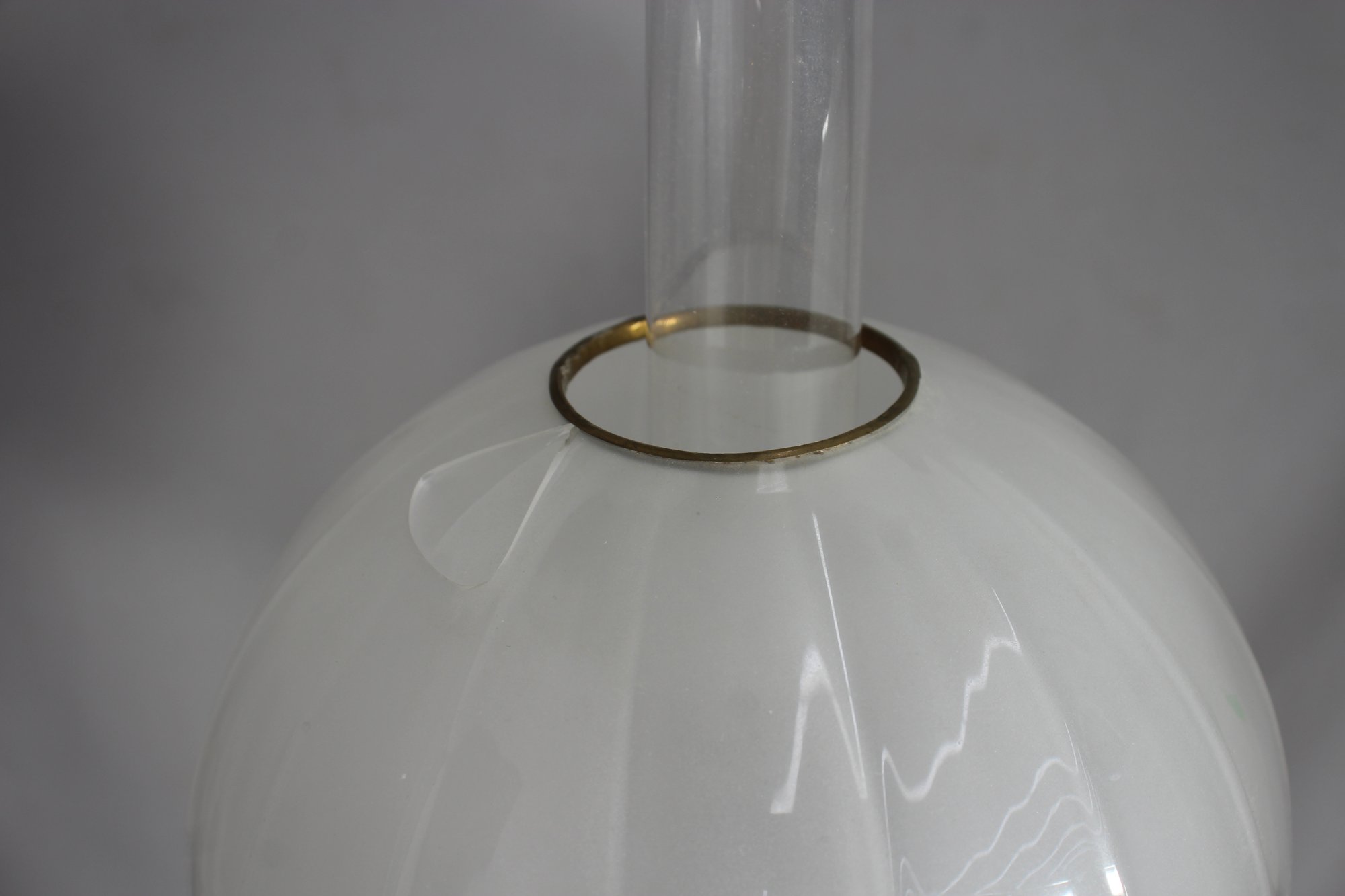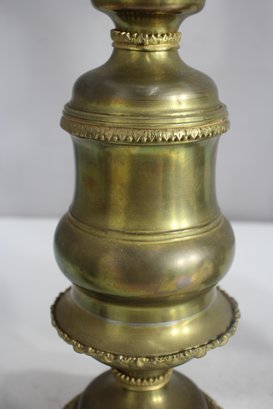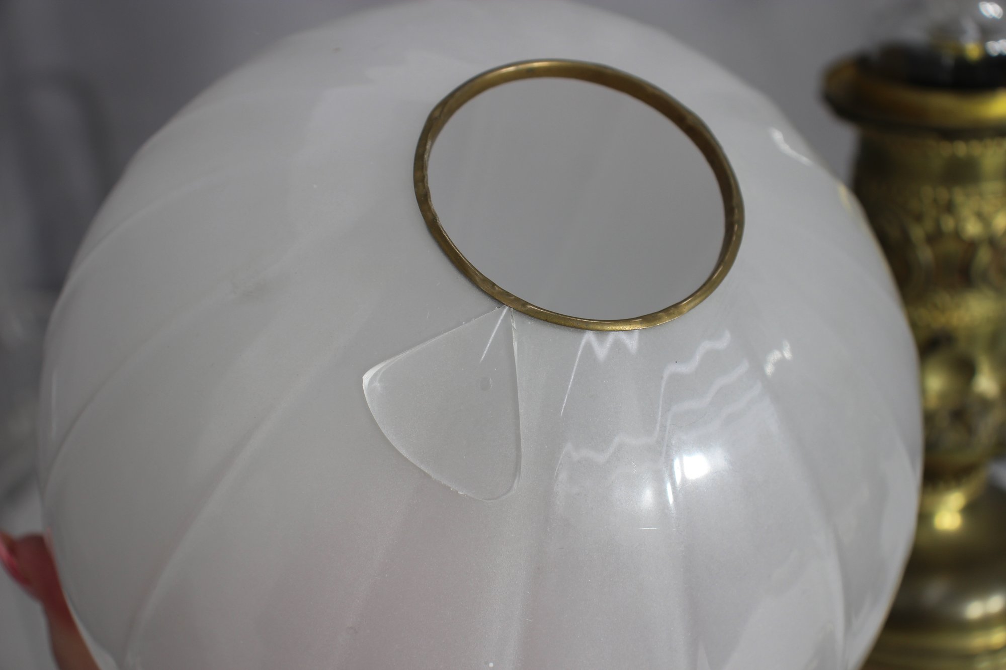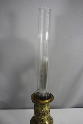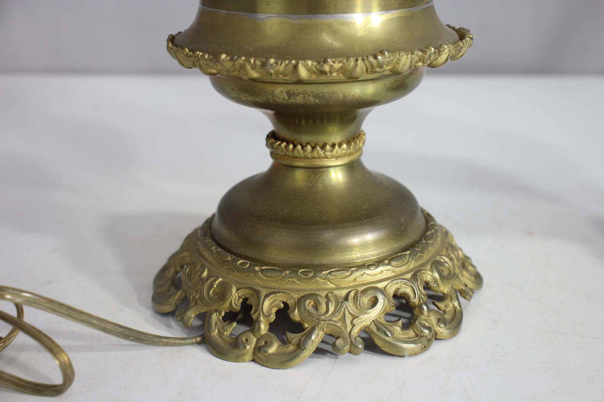 This stunning pair of vintage brass hurricane table lamps brings an air of Victorian elegance to any room. Each lamp features a beautifully detailed brass base with intricate floral engravings, supporting a white swirl glass globe and a clear glass chimney, evoking the charm of classic oil lamps.