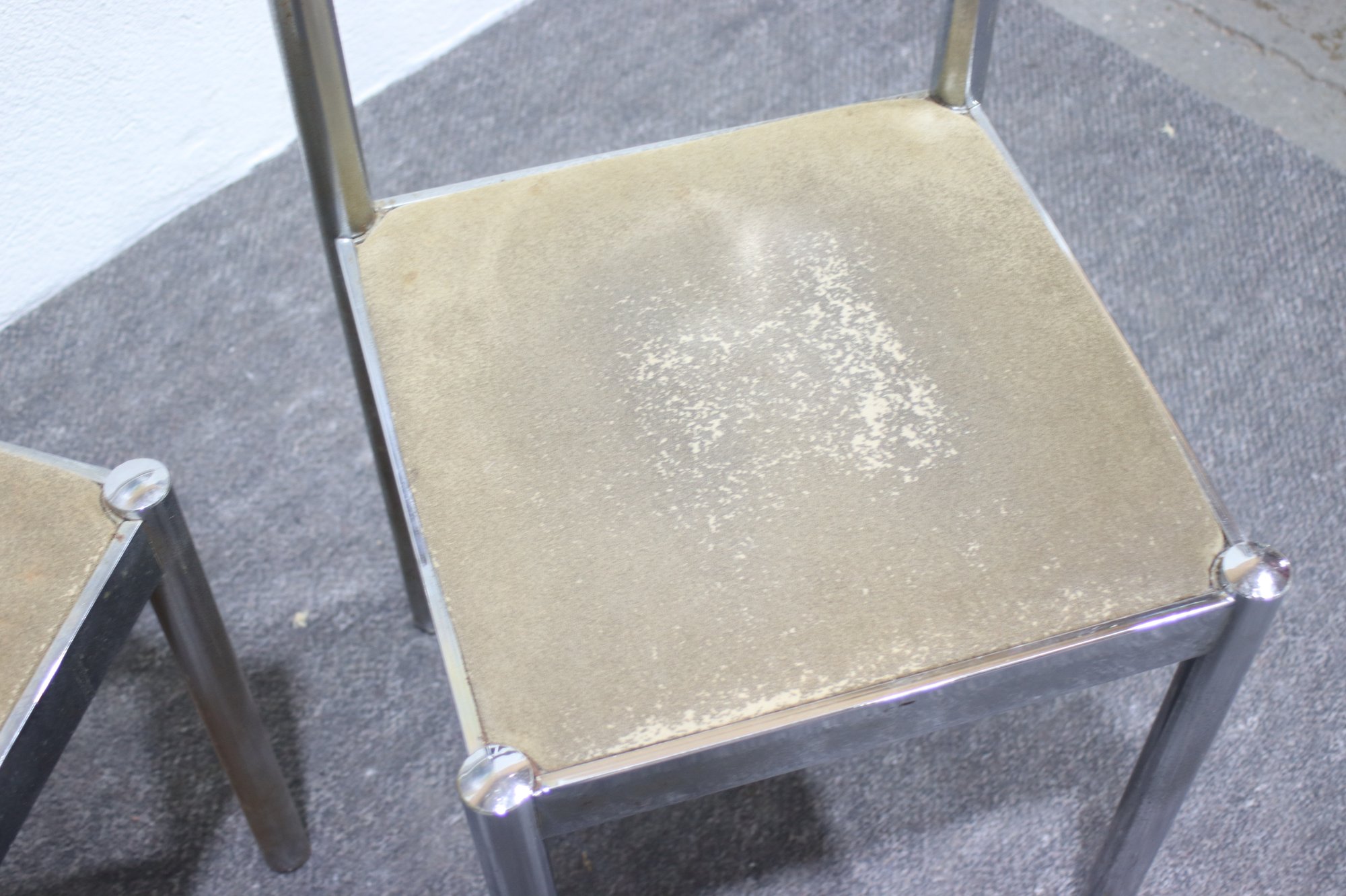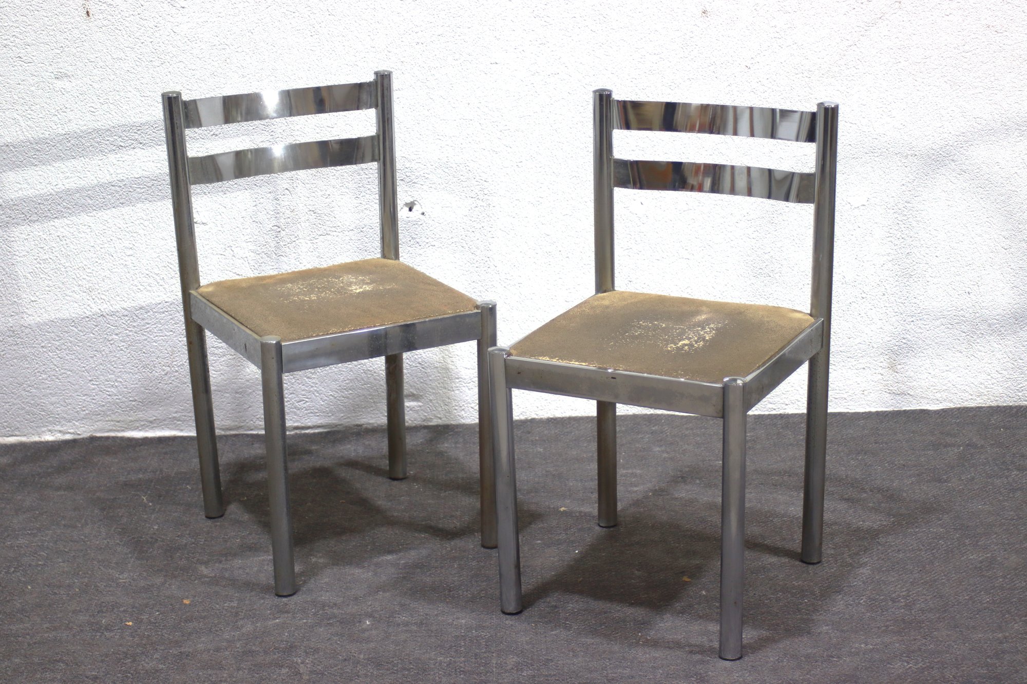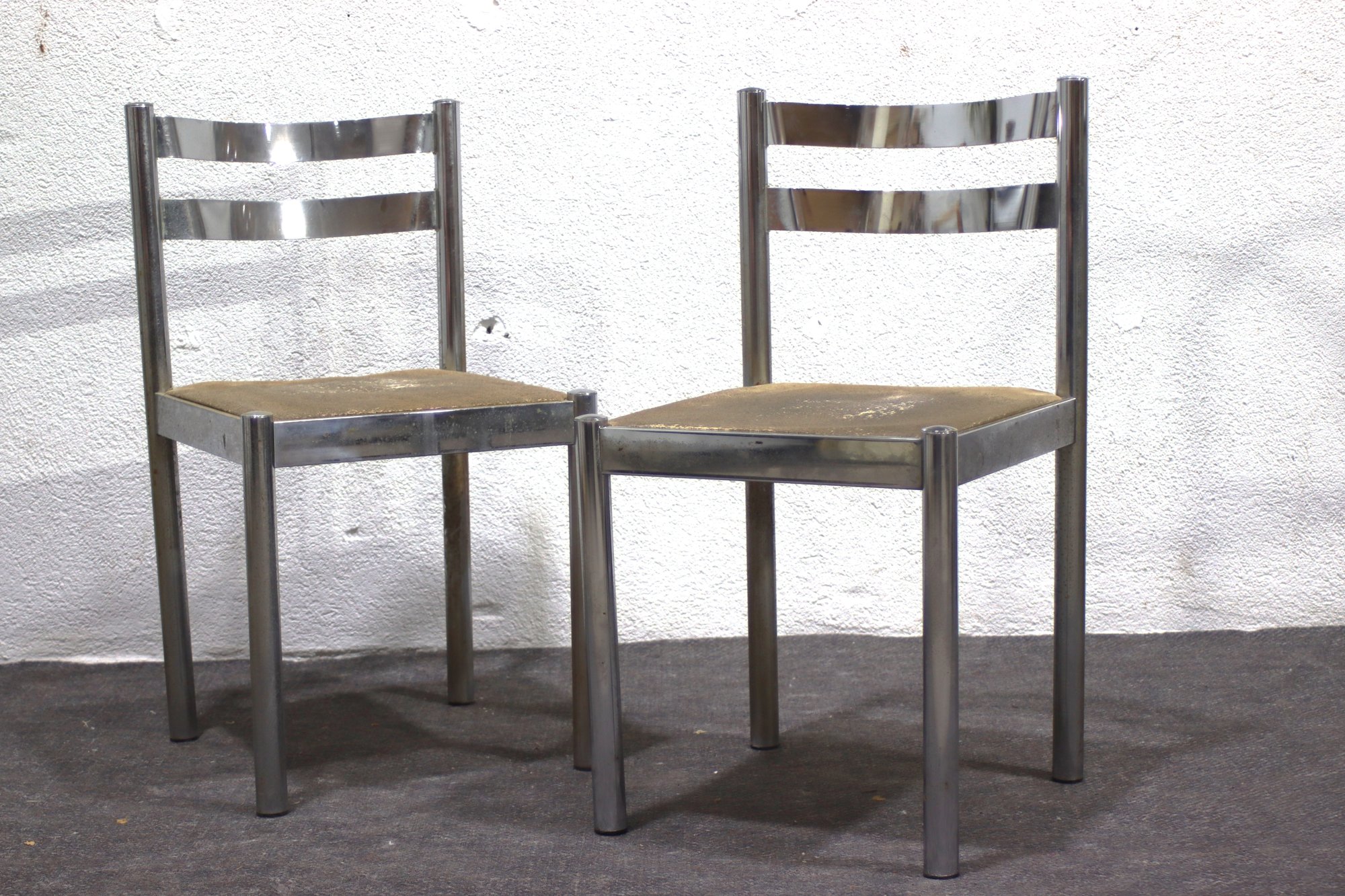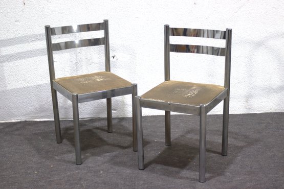 This pair of vintage chrome dining chairs offers a sleek, industrial-modern aesthetic with a minimalist polished metal frame and fabric-covered seats. Their clean, simple design makes them a great addition to any mid-century, industrial, or contemporary space.