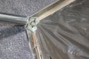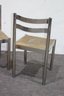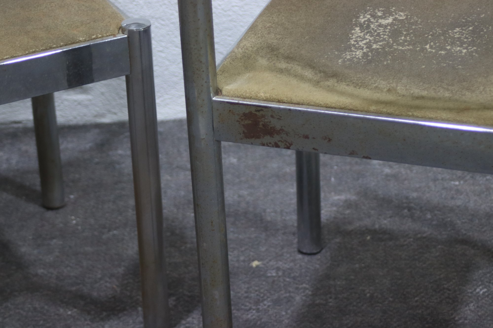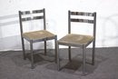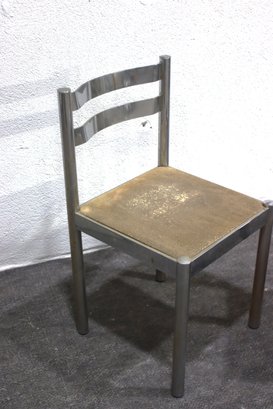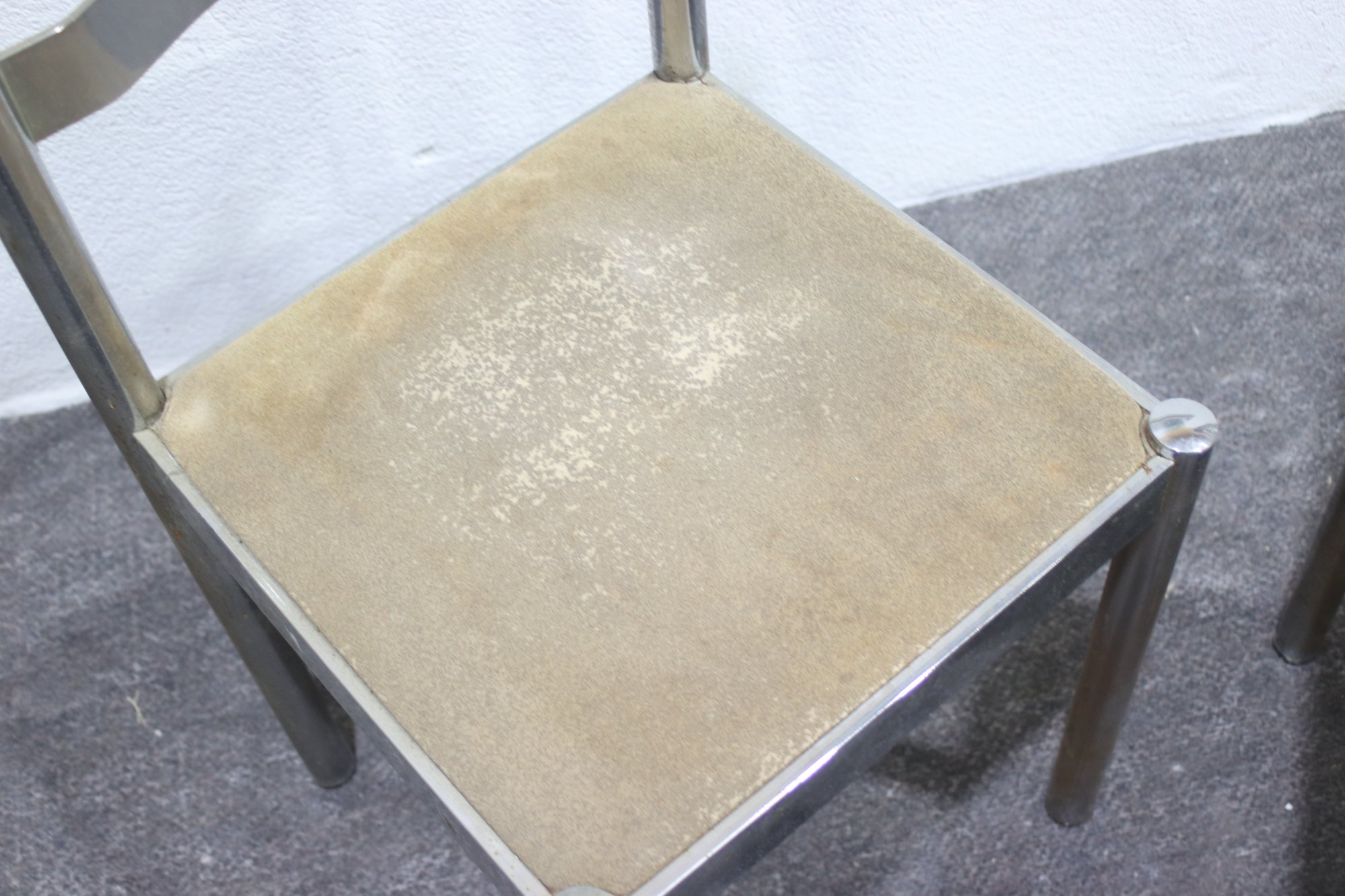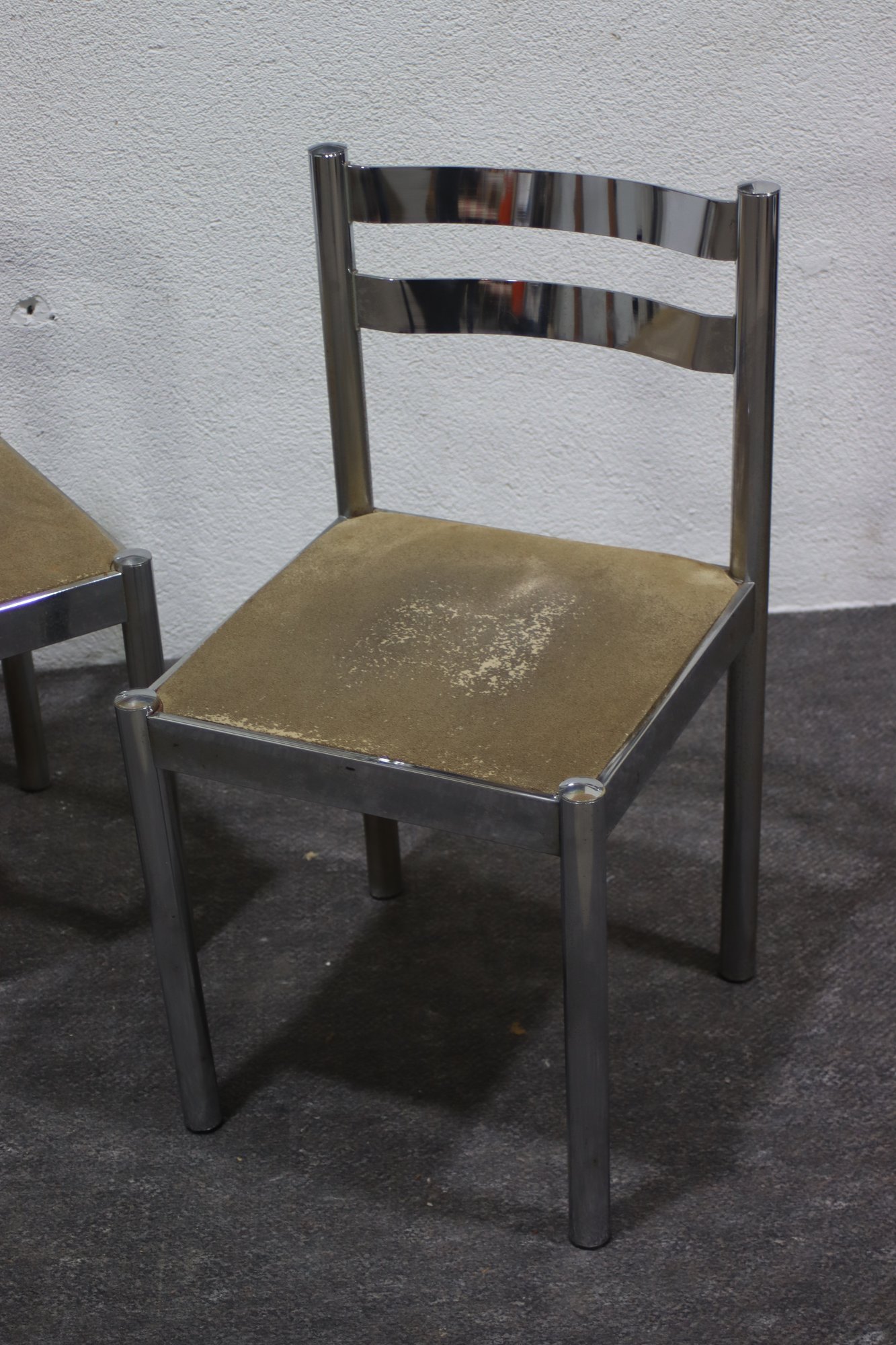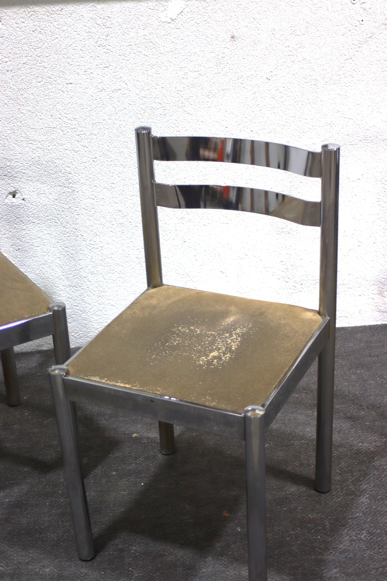 This pair of vintage chrome dining chairs offers a sleek, industrial-modern aesthetic with a minimalist polished metal frame and fabric-covered seats. Their clean, simple design makes them a great addition to any mid-century, industrial, or contemporary space.