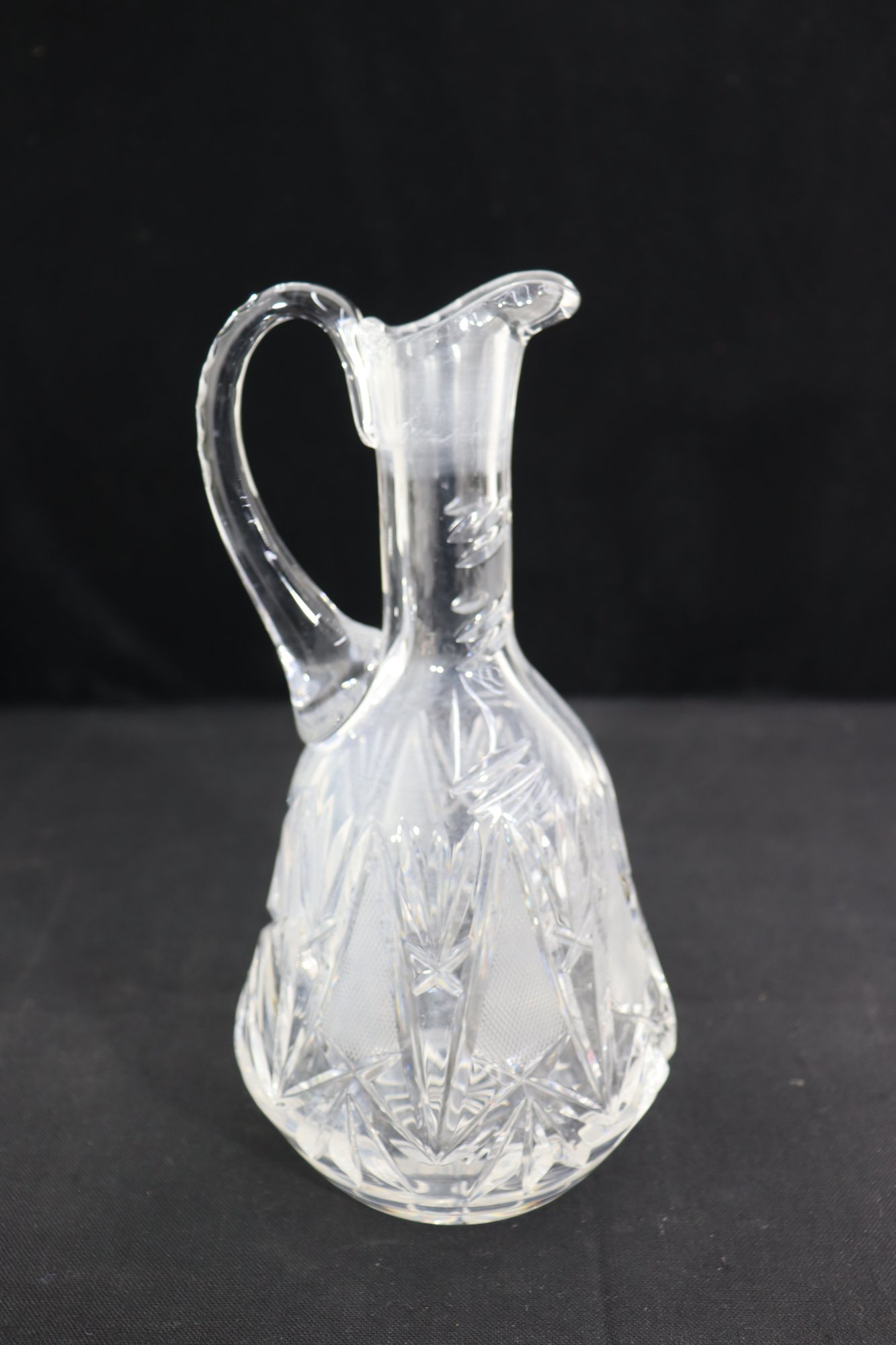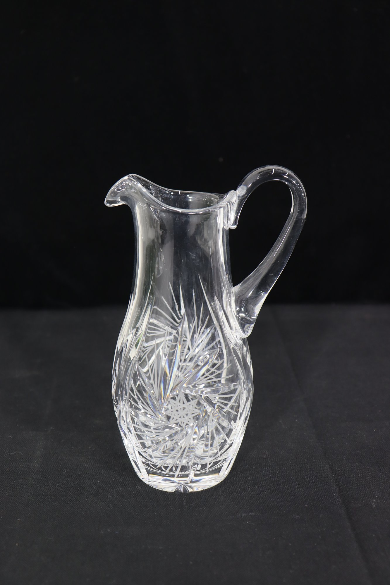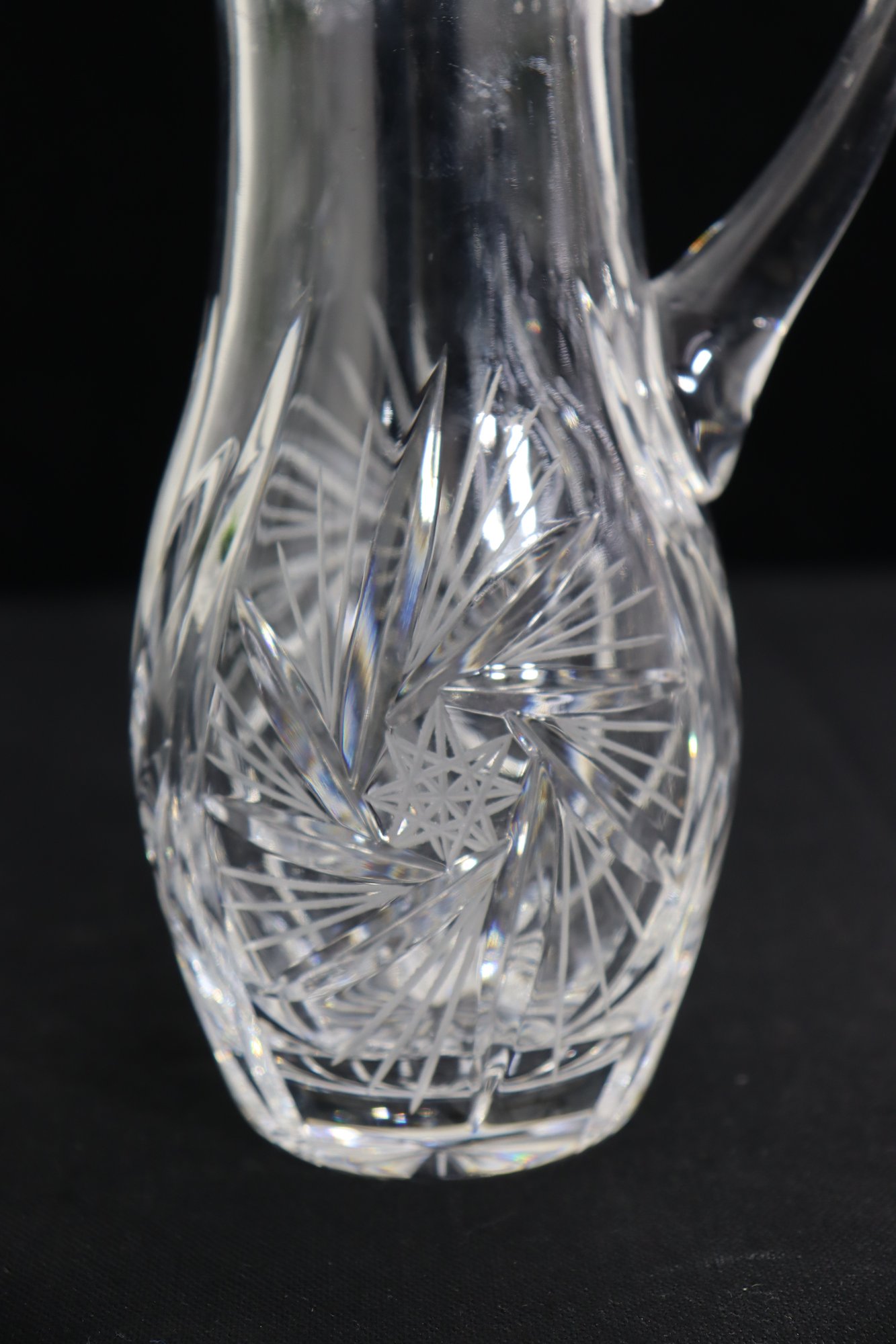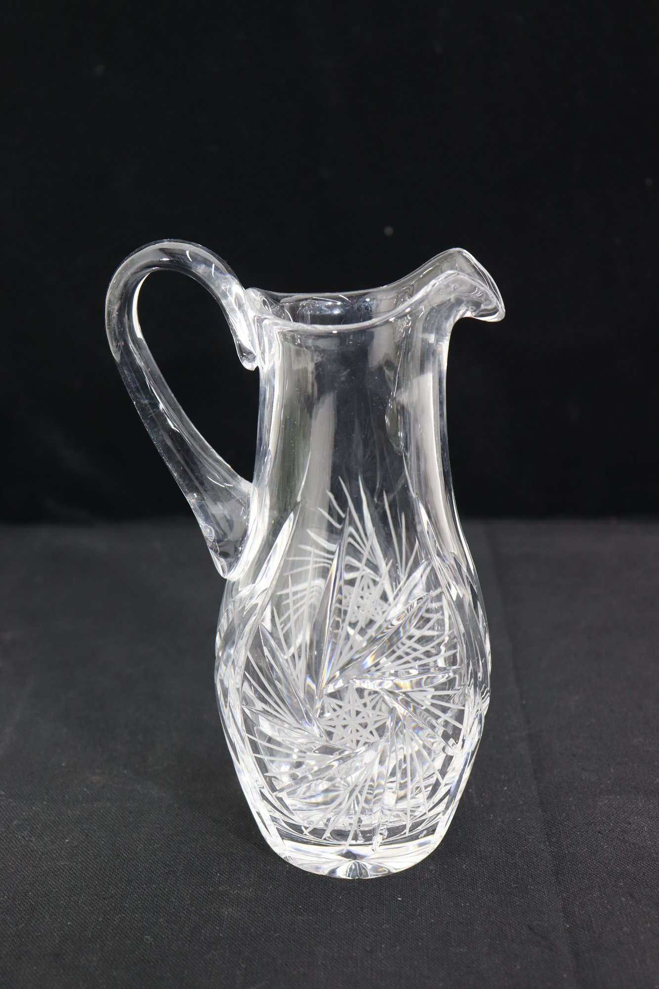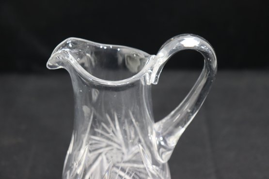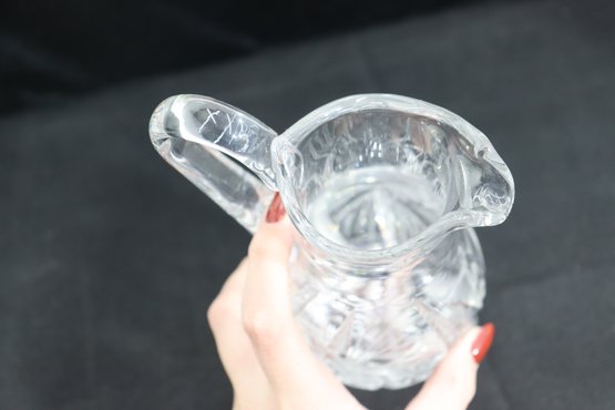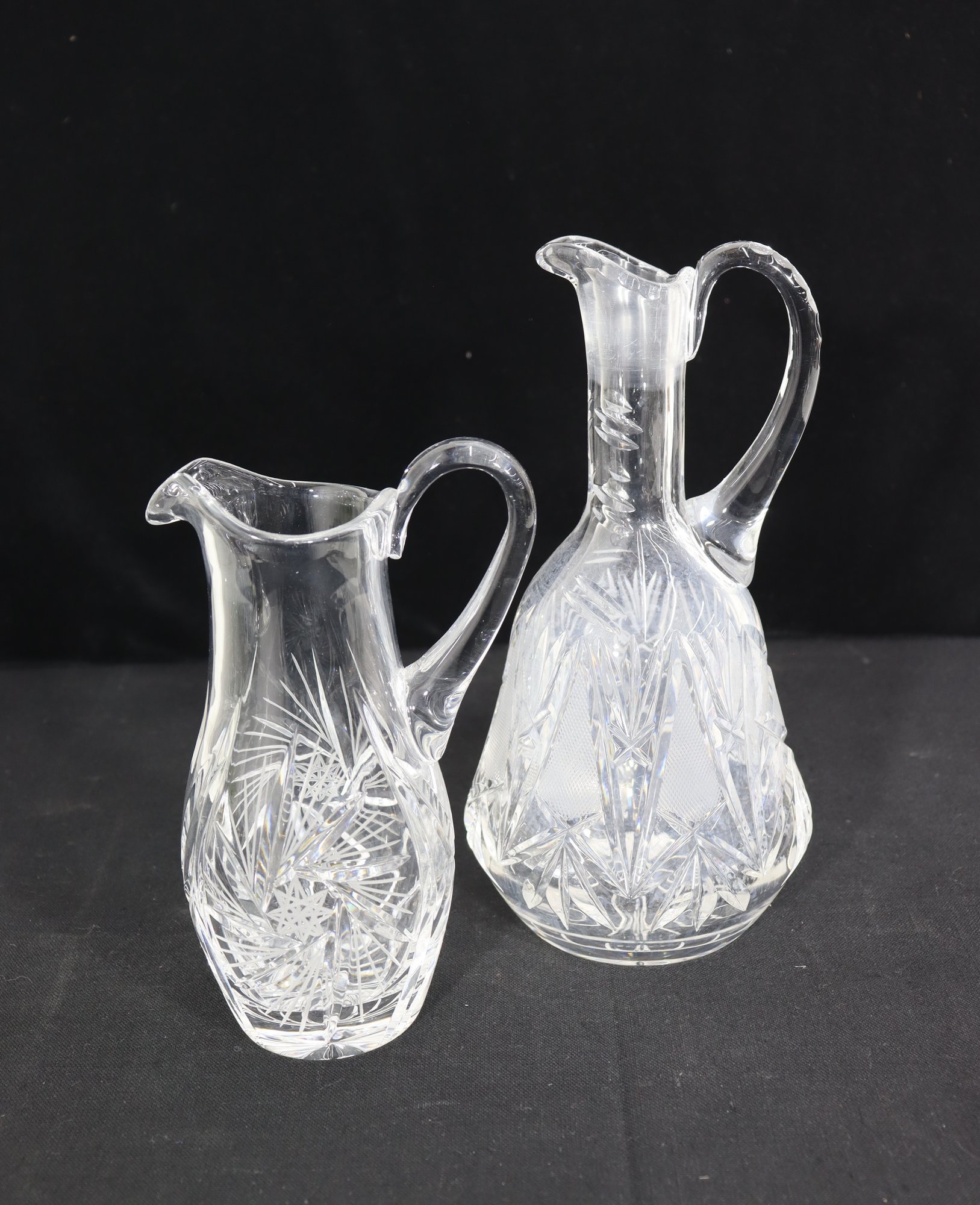 Beautifully crafted and full of sparkle, this pair of vintage cut crystal pitchers makes an elegant addition to any glassware collection or table display. Each piece features a unique etched pattern with intricate floral and starburst cuts, showcasing the brilliance and craftsmanship of traditional crystal work.