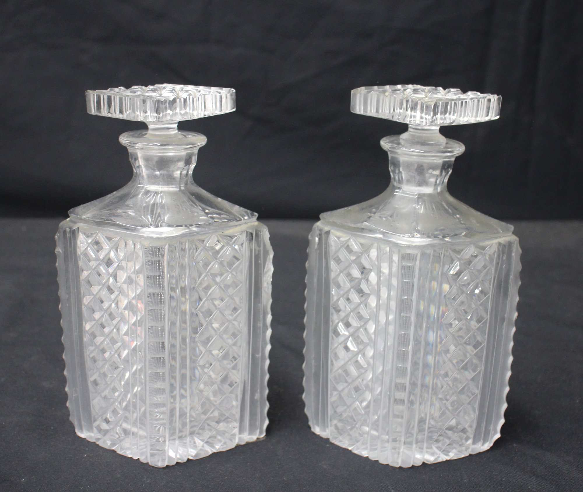 a stunning pair of vintage cut glass decanters, each standing 9 inches tall, including their square-cut stoppers. These beautifully crafted decanters showcase intricate cut glass designs, including a diamond and vertical pattern, with sturdy bases adding elegance and stability.