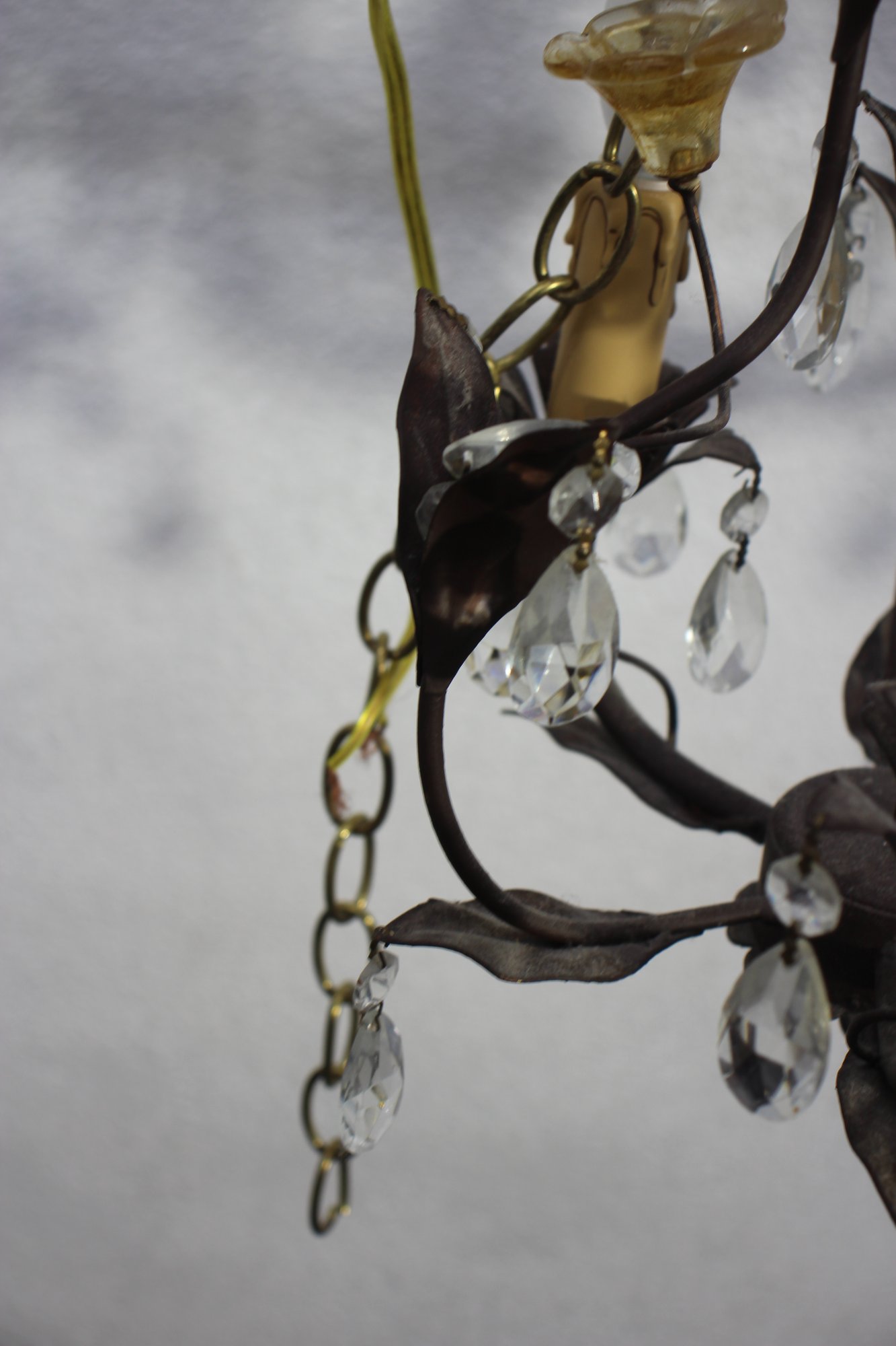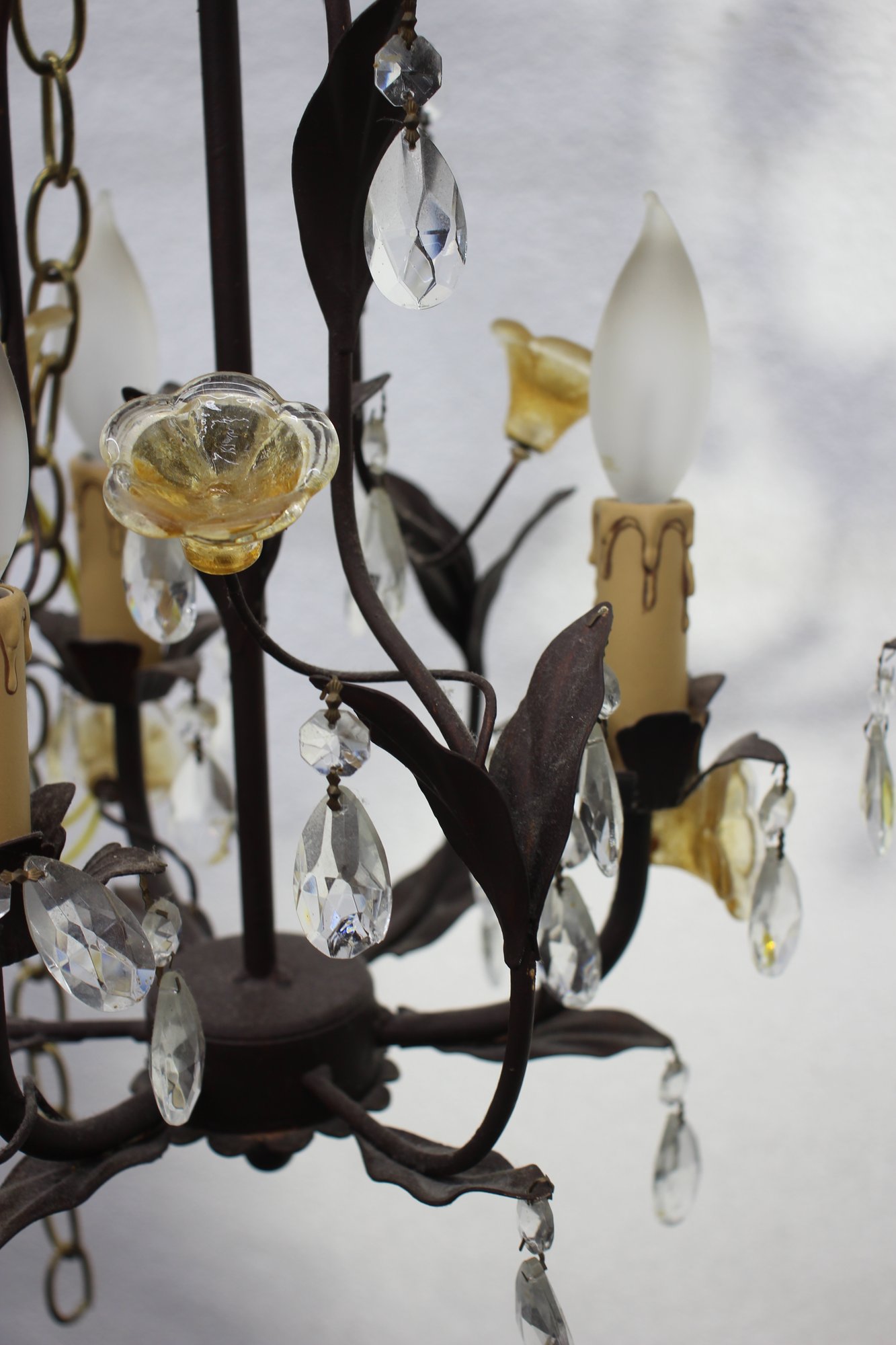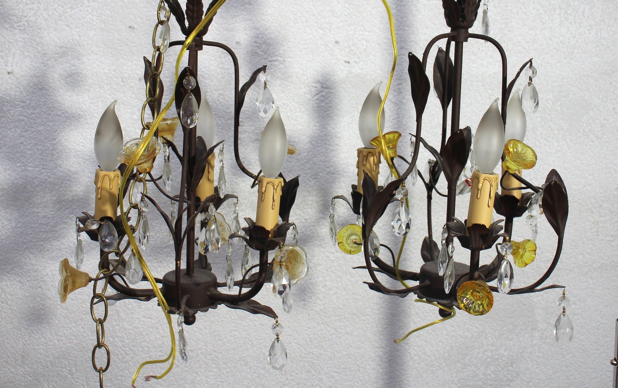 Add a touch of elegance to your home with this pair of vintage French-style chandelier sconces. Featuring intricate metalwork, sparkling crystal drops, and delicate floral accents, these fixtures exude timeless charm.