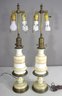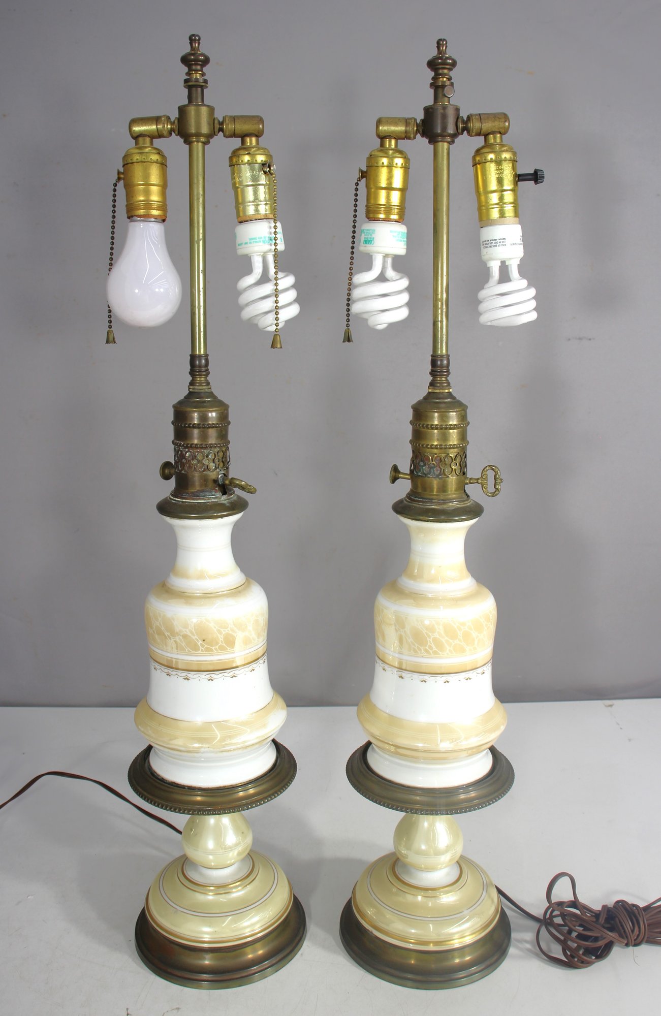 pair of vintage white glass and hand painted and brass table lamps, exuding classic elegance and timeless charm. These lamps feature beautifully crafted marble bodies with warm beige veining, resting on ornate brass bases for a luxurious aesthetic.